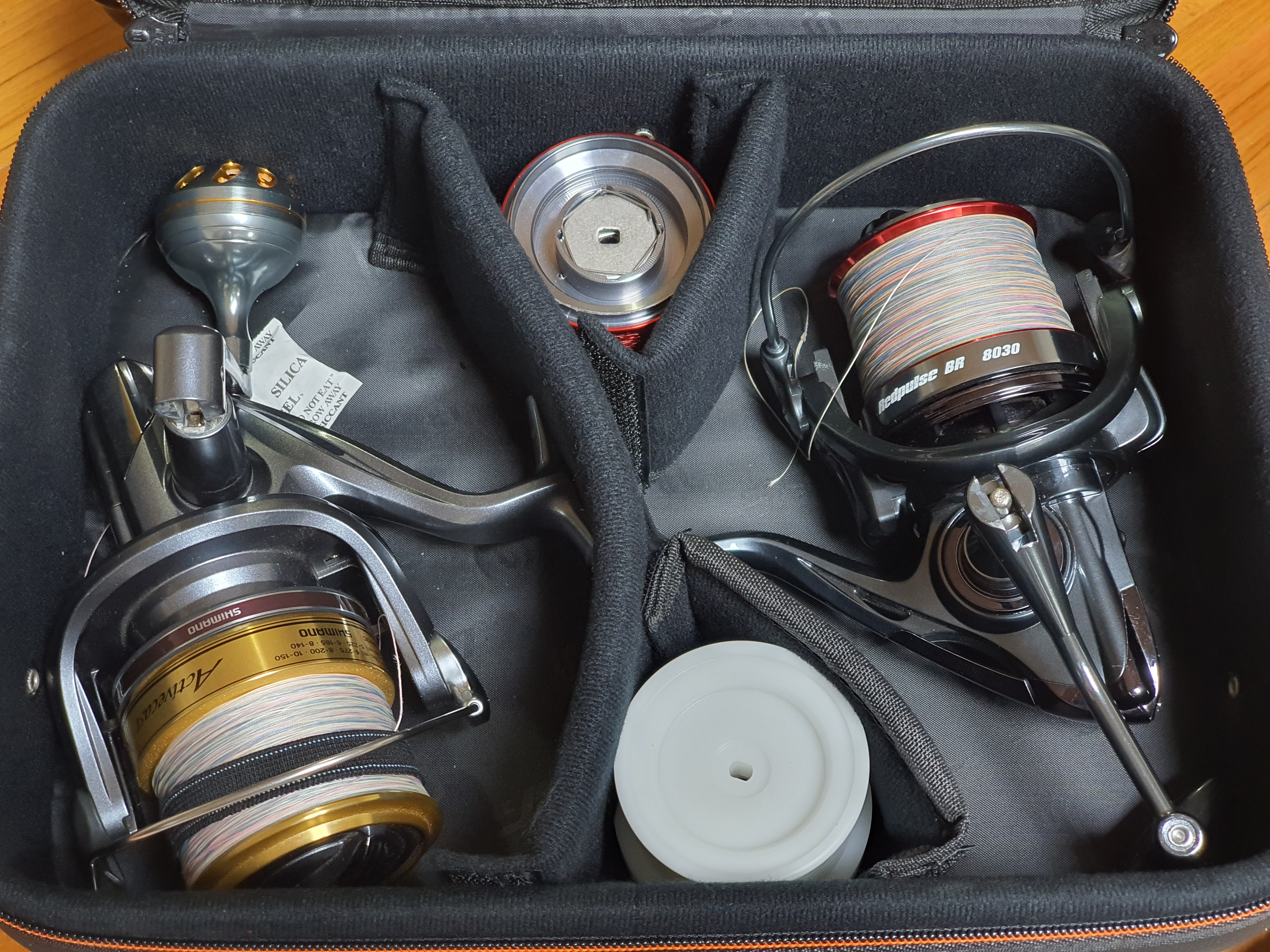 본격적으로 원투낚시용 릴백/보조백으로 사용하기 위해서 한쪽에는 액캐1080 릴과 보조스풀 / 레펄릴과 보조스풀 2세트를 모두 넣었습니다. 물론 깊이가 있다보니 릴 손잡이는 접어야 하구요. 베일이 살짝 튀어나와 보이나 가방 커버부분에 여유 공간으로 문제없이 수납이 가능합니다.