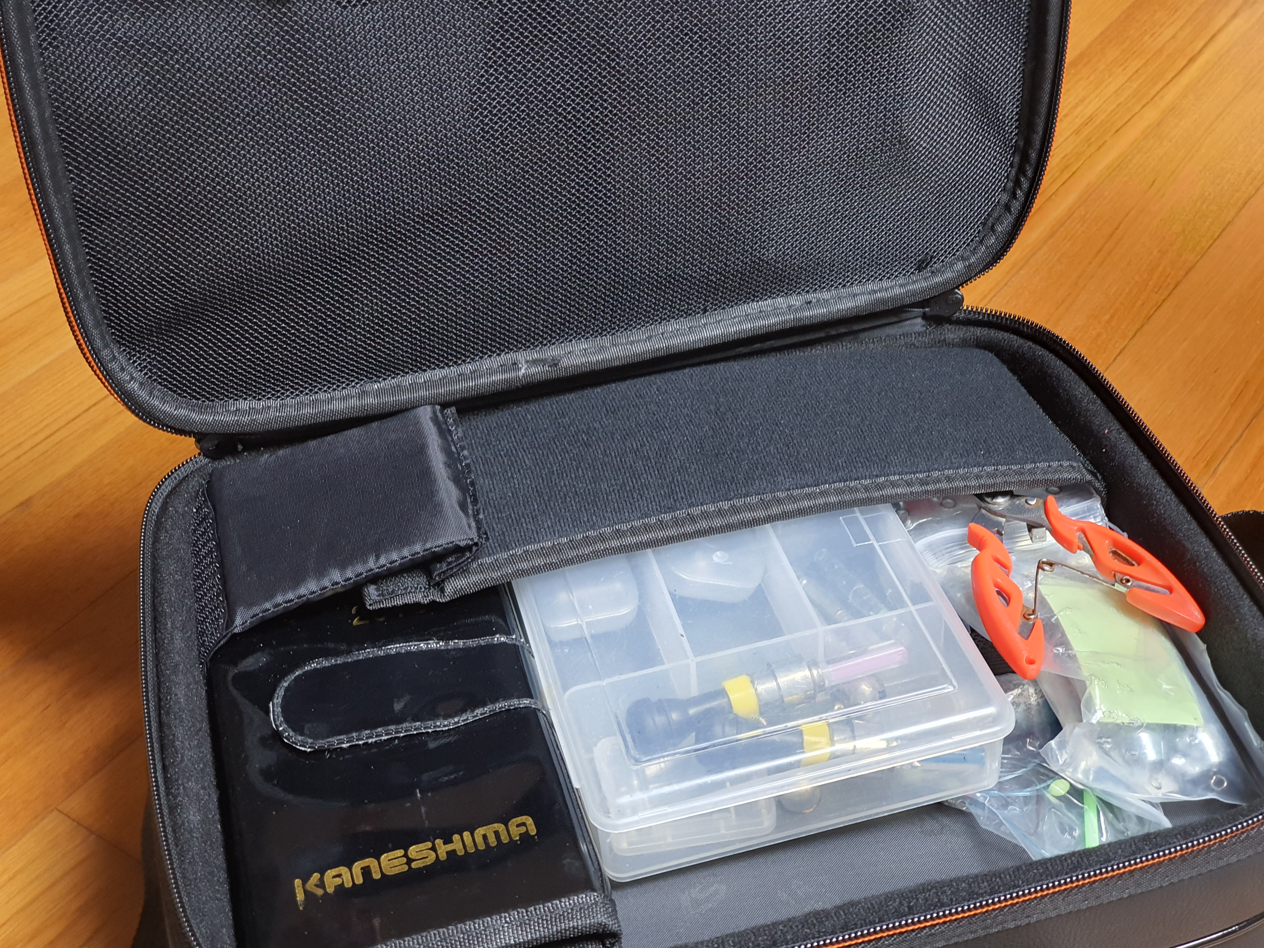 반대편 수납공간은 각종 채비를 넣어서 보관하고 있는데요. 지금은 내용물을 일부 조정해서 헤드라이트등까지 넣어 다니고 있네요.
