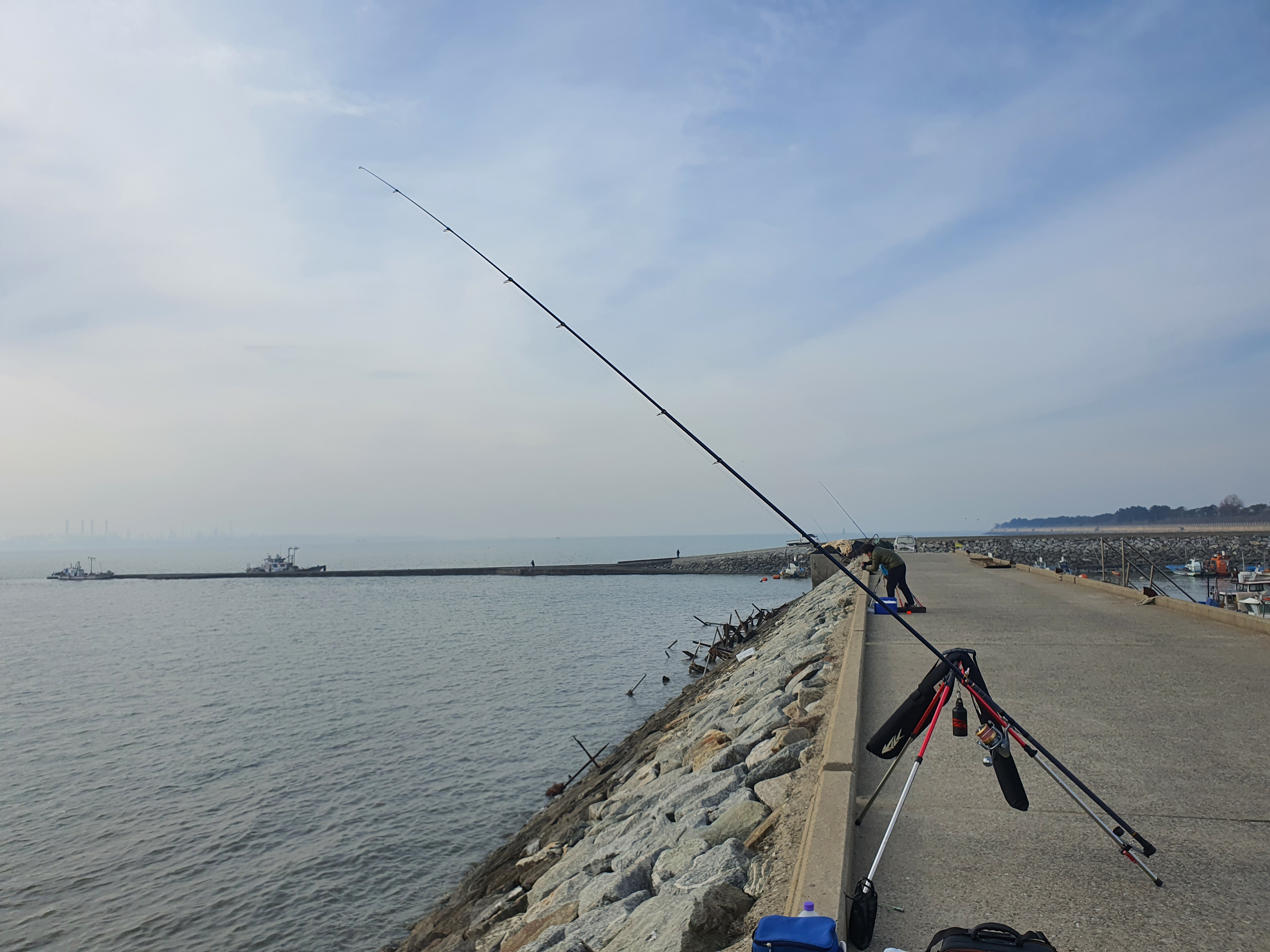 내항쪽이 많이 바뀌었더군요. 간조때 물이 거의 빠져 갯벌이 드러나고 바닥을 깊게 한다고 한참 공사가 진행 중이었는데, 깊이가 깊어진건지 물이 꽤 들어와 있더군요. 그래도 일부 구간은 공사중이라 조심해야 할 듯 합니다. 실수로드로 잠시만 해 보기로 하고 던져봅니다. 입질이 1도 없네요.