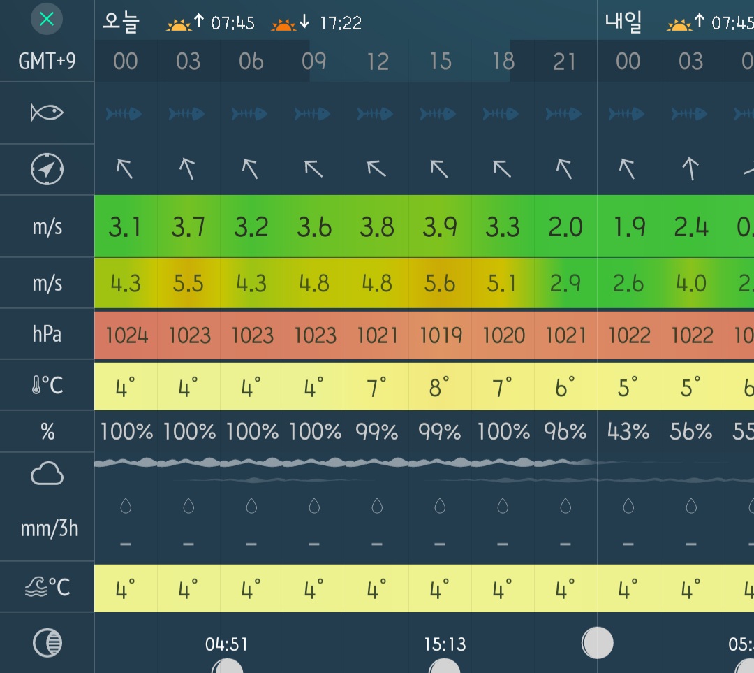 □ 바다상황 : 바람 1.5단 이하, 파도 장판, 물색 그다지