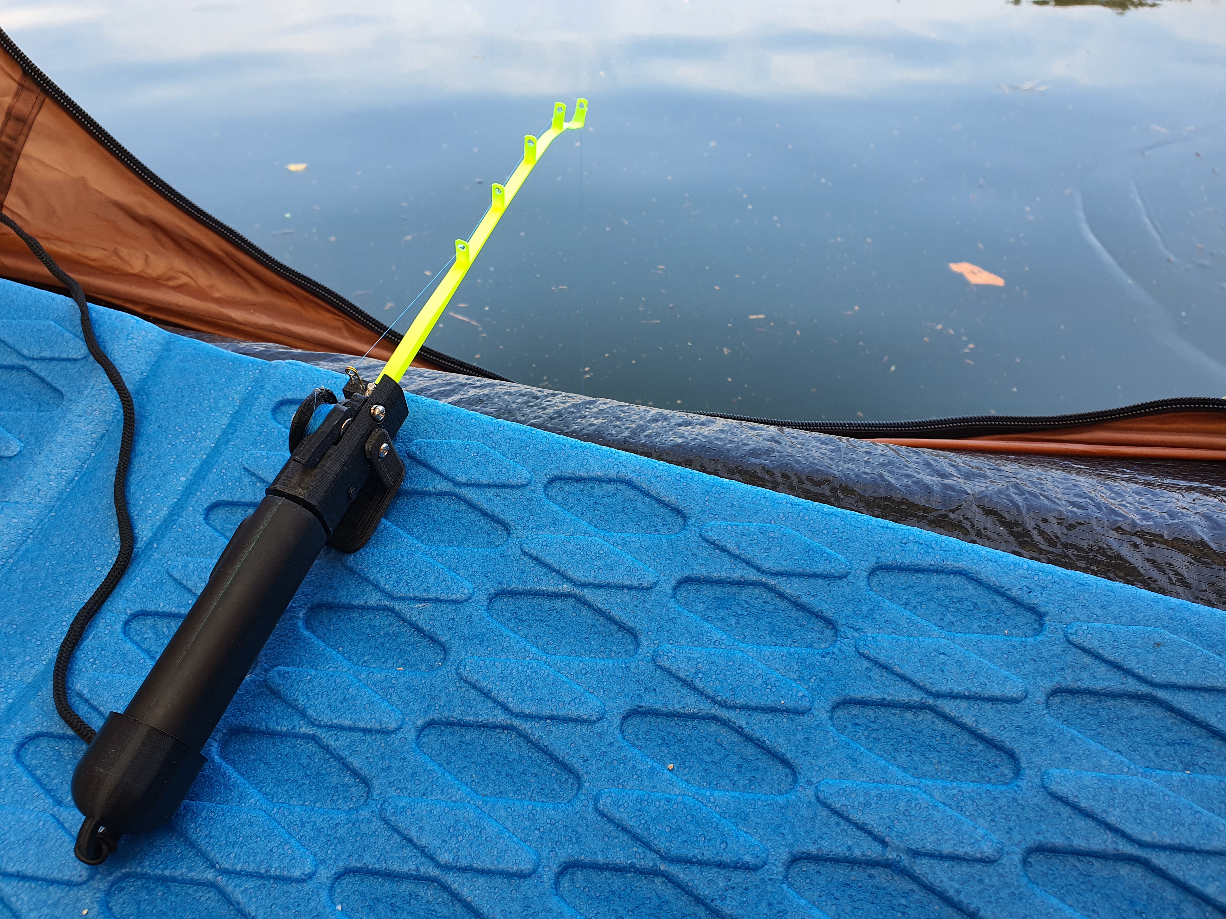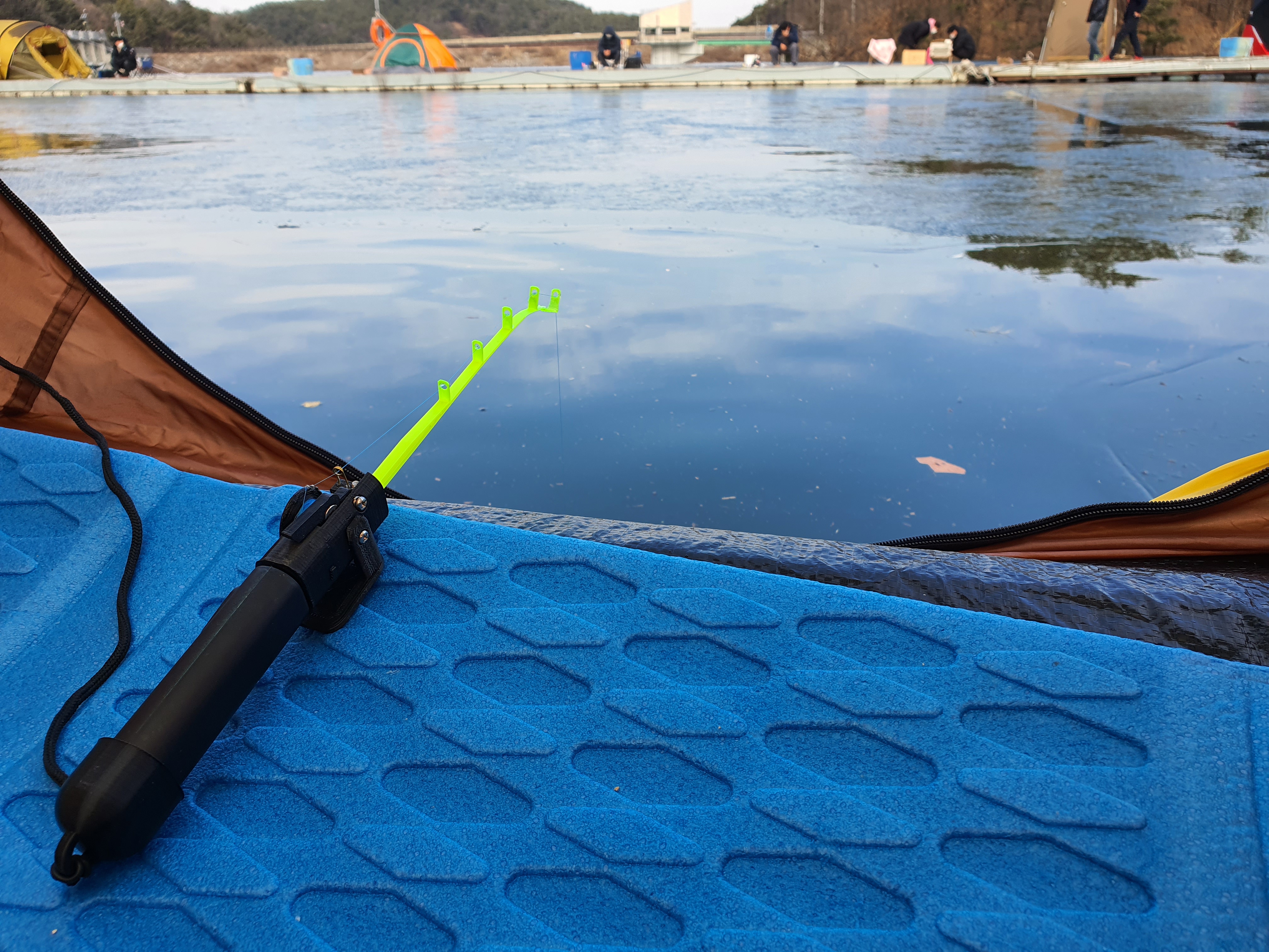 텐트를 치고, 가스 히터를 켠 후, 자작 전동릴과 초릿대를 조합하여 20-21년 겨울 첫 빙어낚시를 시작합니다.
