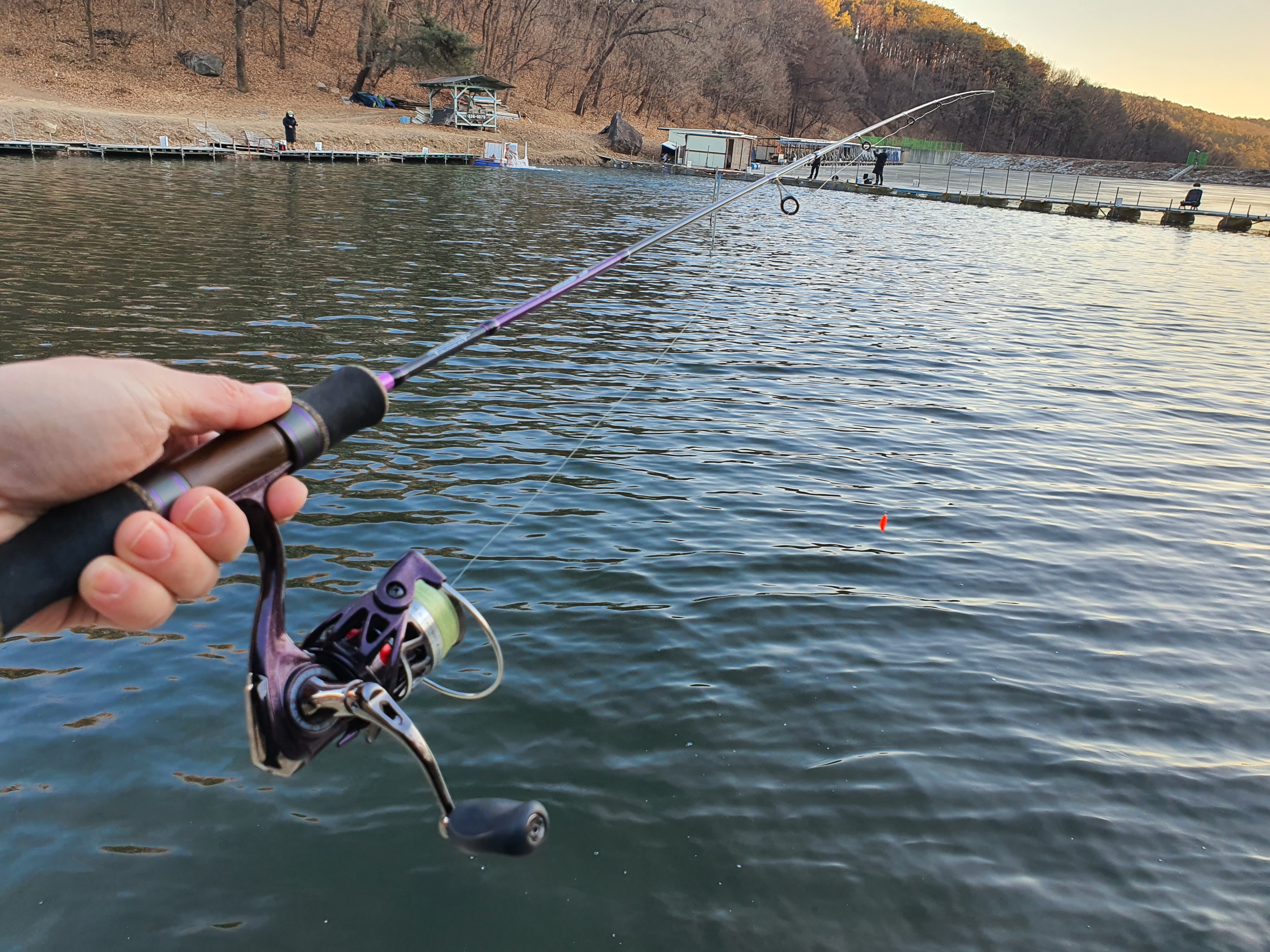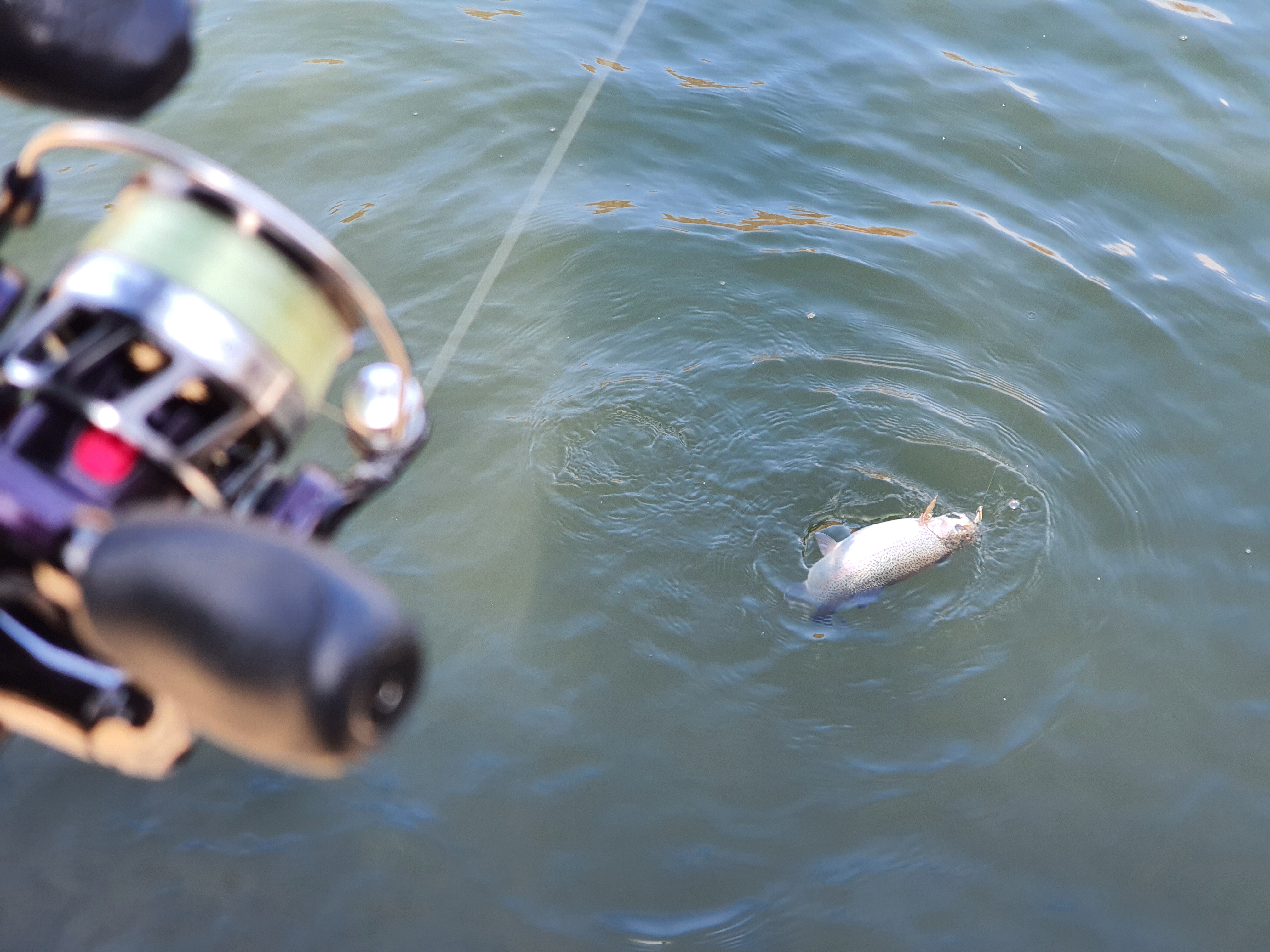 좀비송어가 아닌 아까전에 새로 방생했던 송어인지 힘을 씁니다. 손맛터이기에 라인 텐션을 유지하며, 몇분간 손맛을 보며 송어로드의 휨새도 느껴보았습니다.