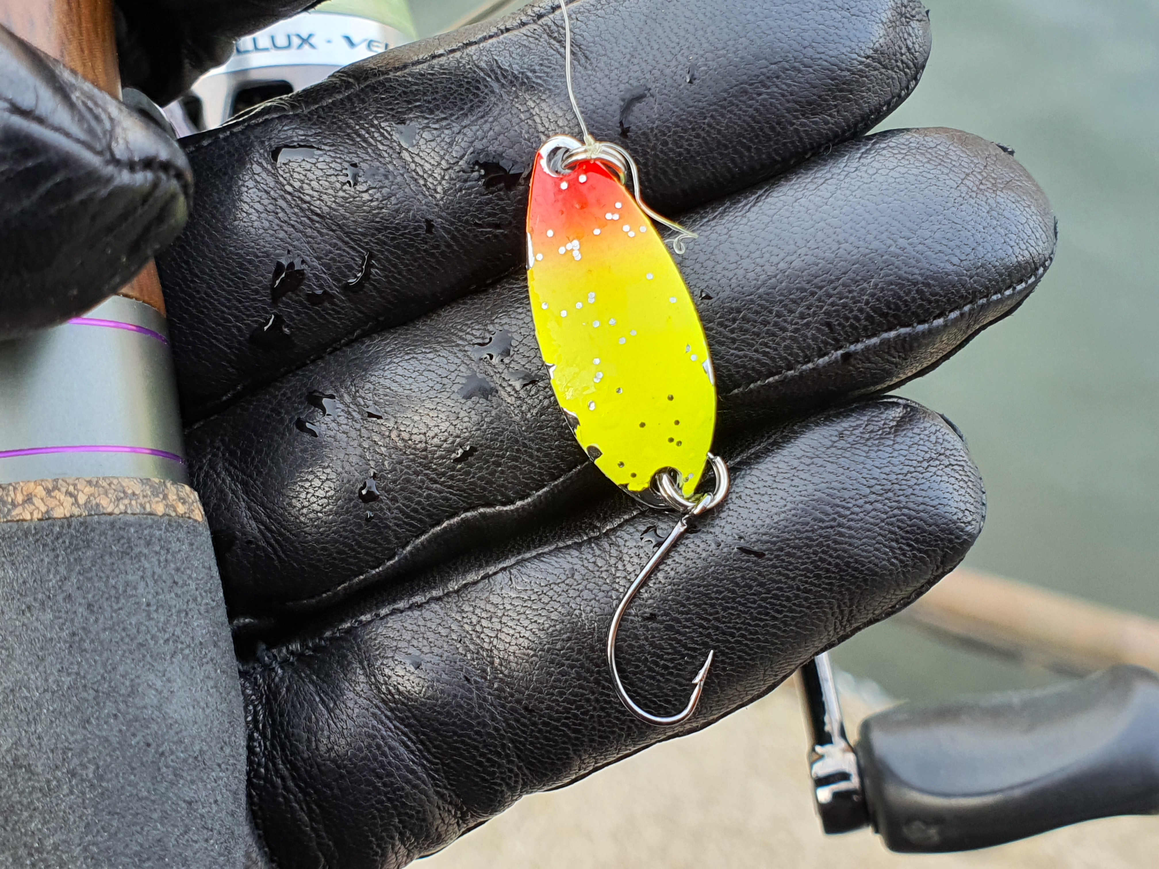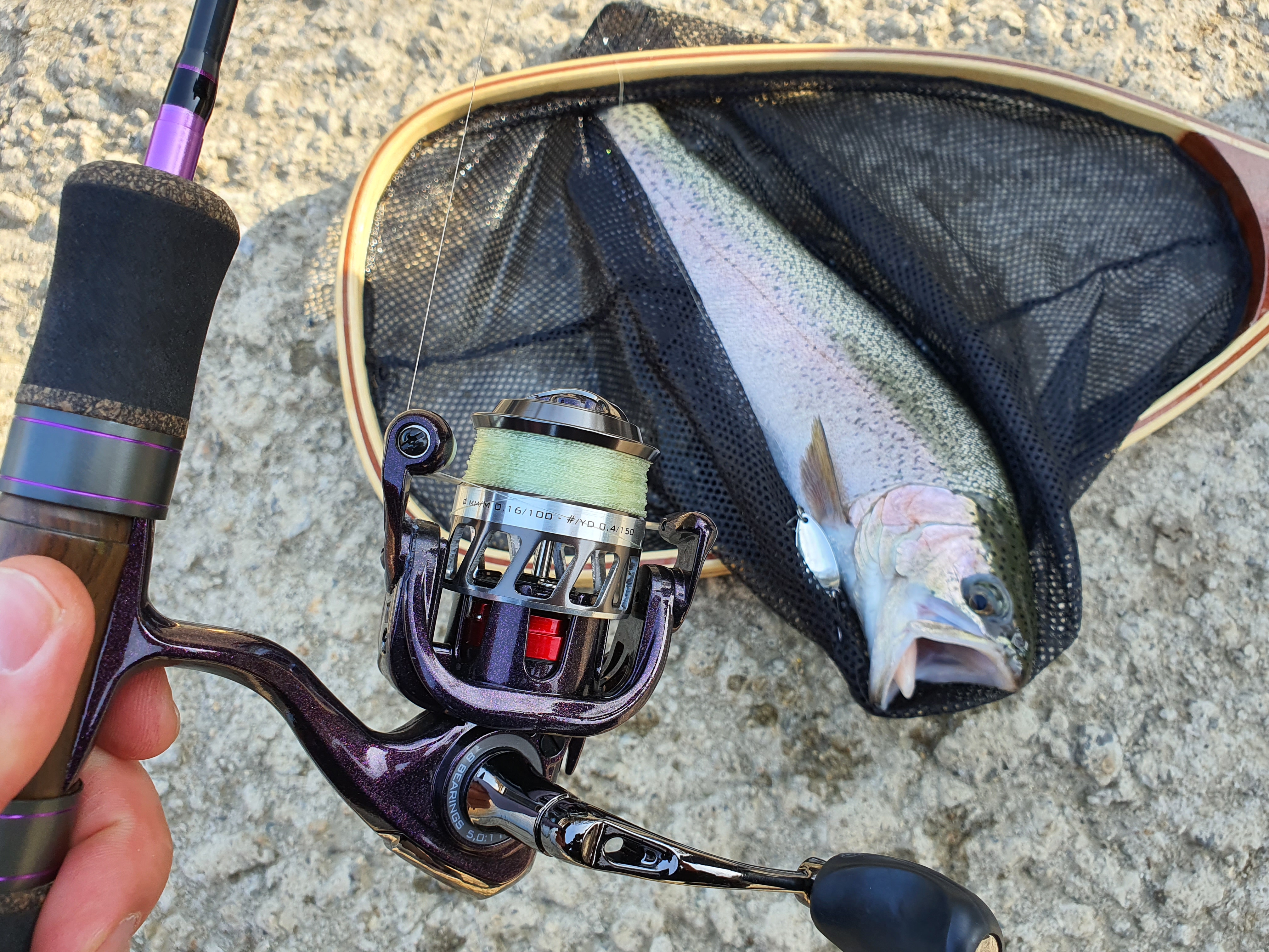 필자는 송어낚시 장비가 아직 없다보니 지인이 빌려준 조합으로 송어낚시를 했는데요. 그 조합이 알룩스 송어로드(일명 보라돌이)와 벨벳 에리어로 보라빛 줄무늬가 있는 송어와 어울리는 보라색이 매력적인 로드와 릴의 깔맞춤입니다.