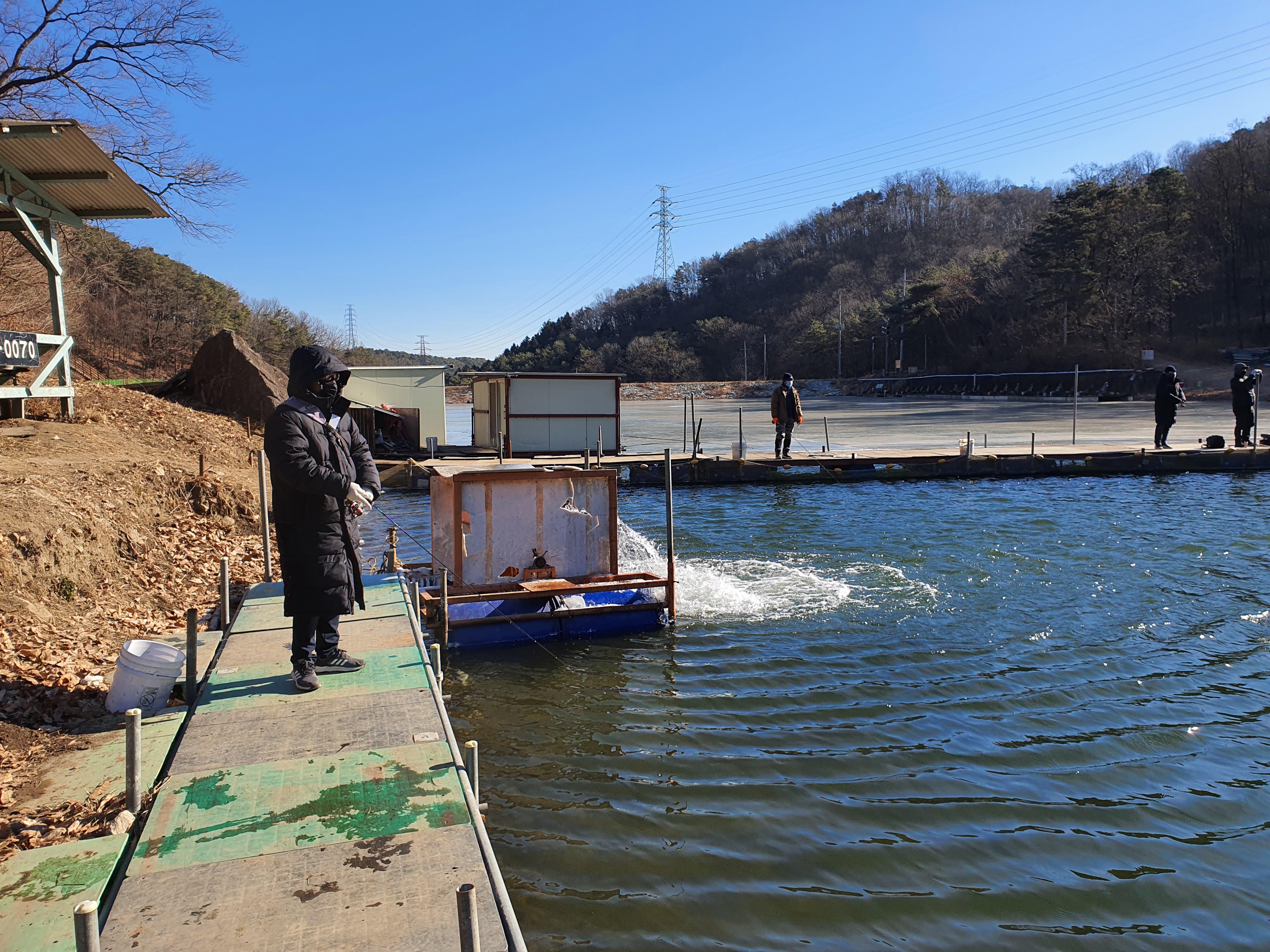 손발이 시릴정도로 너무 추운 날씨라 송어의 활성도가 많이 떨어지기도 한듯 하지만, 잡이터가 아닌 손맛터라 그런지 상처 입는 송어가 눈앞에 보이지만 인기척이 있어도 도망가지도 않고 알짱거리기만 할뿐 반응을 보이지 않습니다. 무슨 좀비송어느낌이더군요. 그렇게 한참동안 입질도 없이 보내는데 싱싱한 송어를 몇 마리 더 방생하더군요.