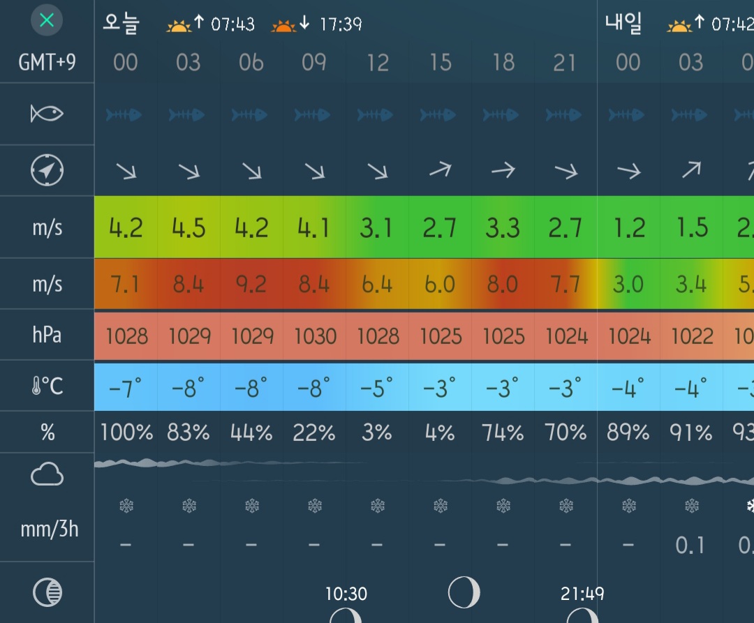 □ 날씨 : 바람 간간히 2~3단, 기온 영하 13도(최저기온)