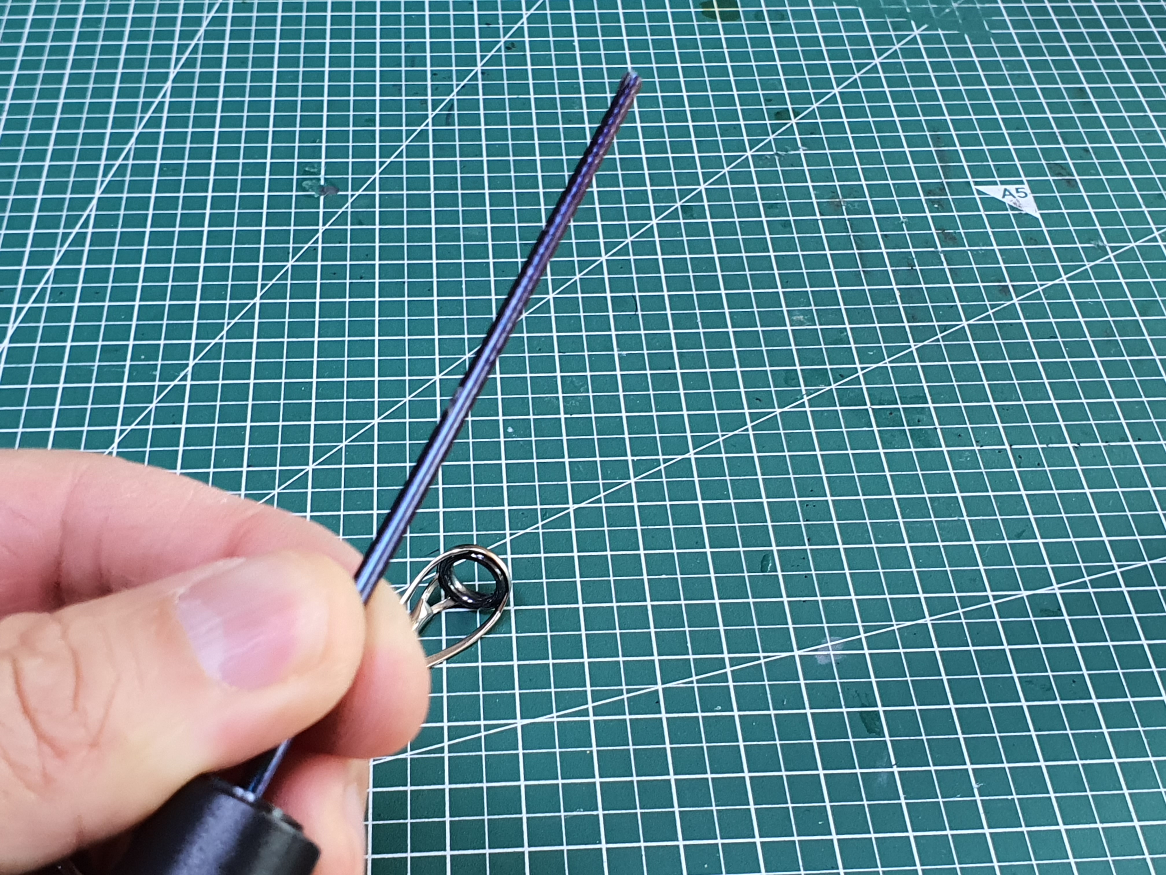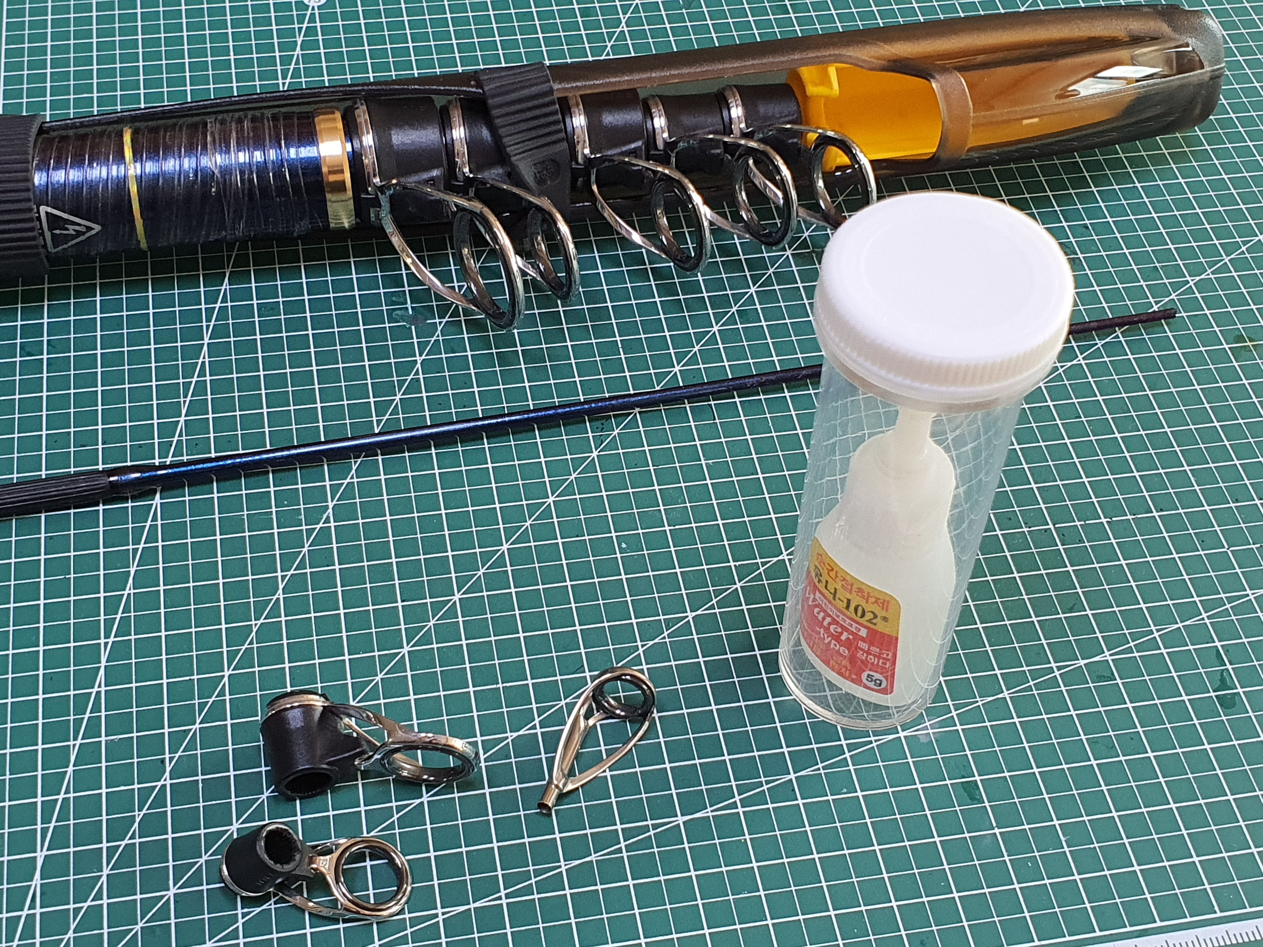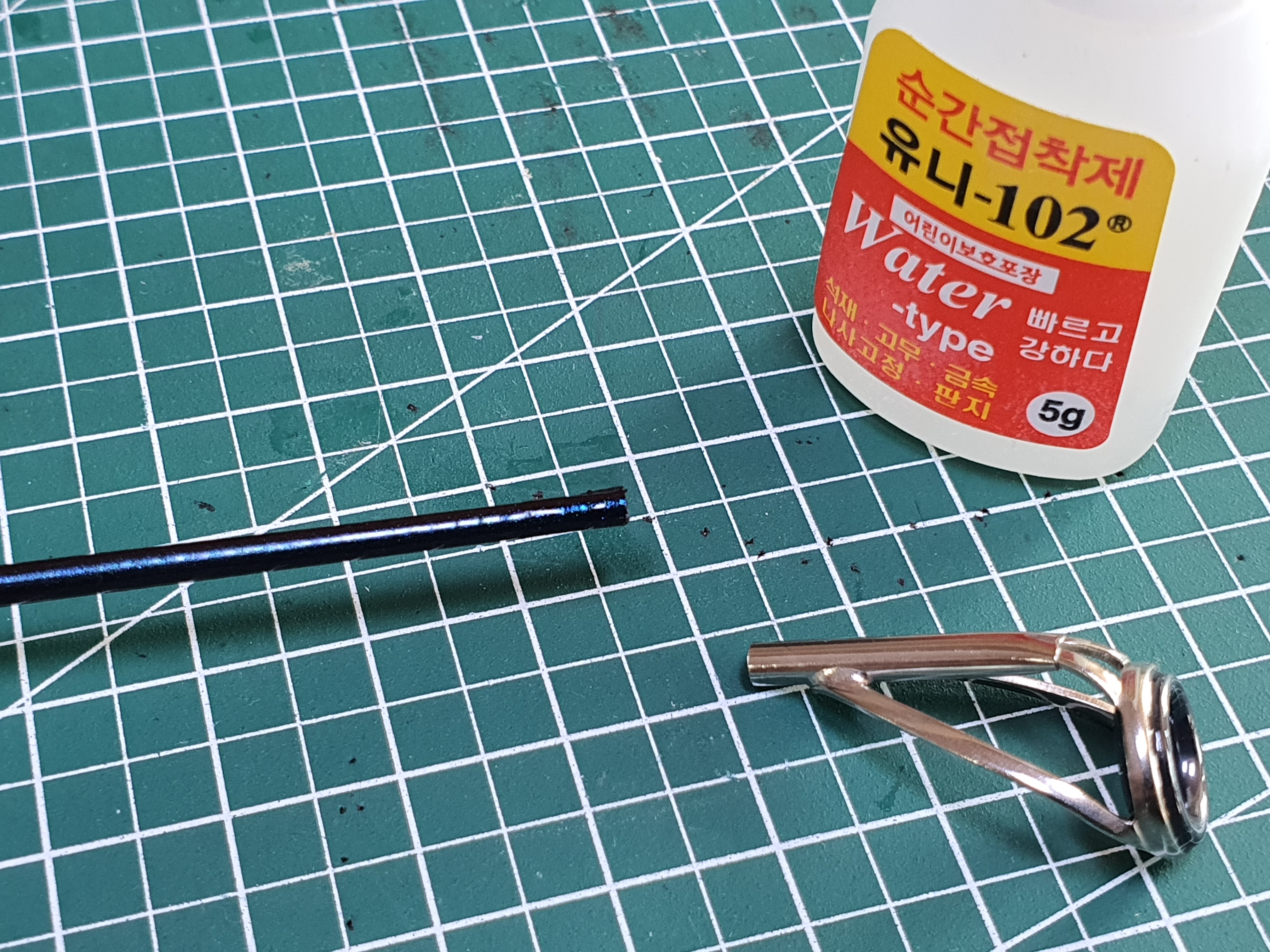 초릿대 길이를 확인해 보니 약 1.9cm정도 날아간 듯 합니다. 큰 체감을 주지 못하는 길이라 사용하던 초릿대를 먼저 사용하기로 하고 헌터 35S-485 카멜레온 낚시대 자가수리를 시작합니다.