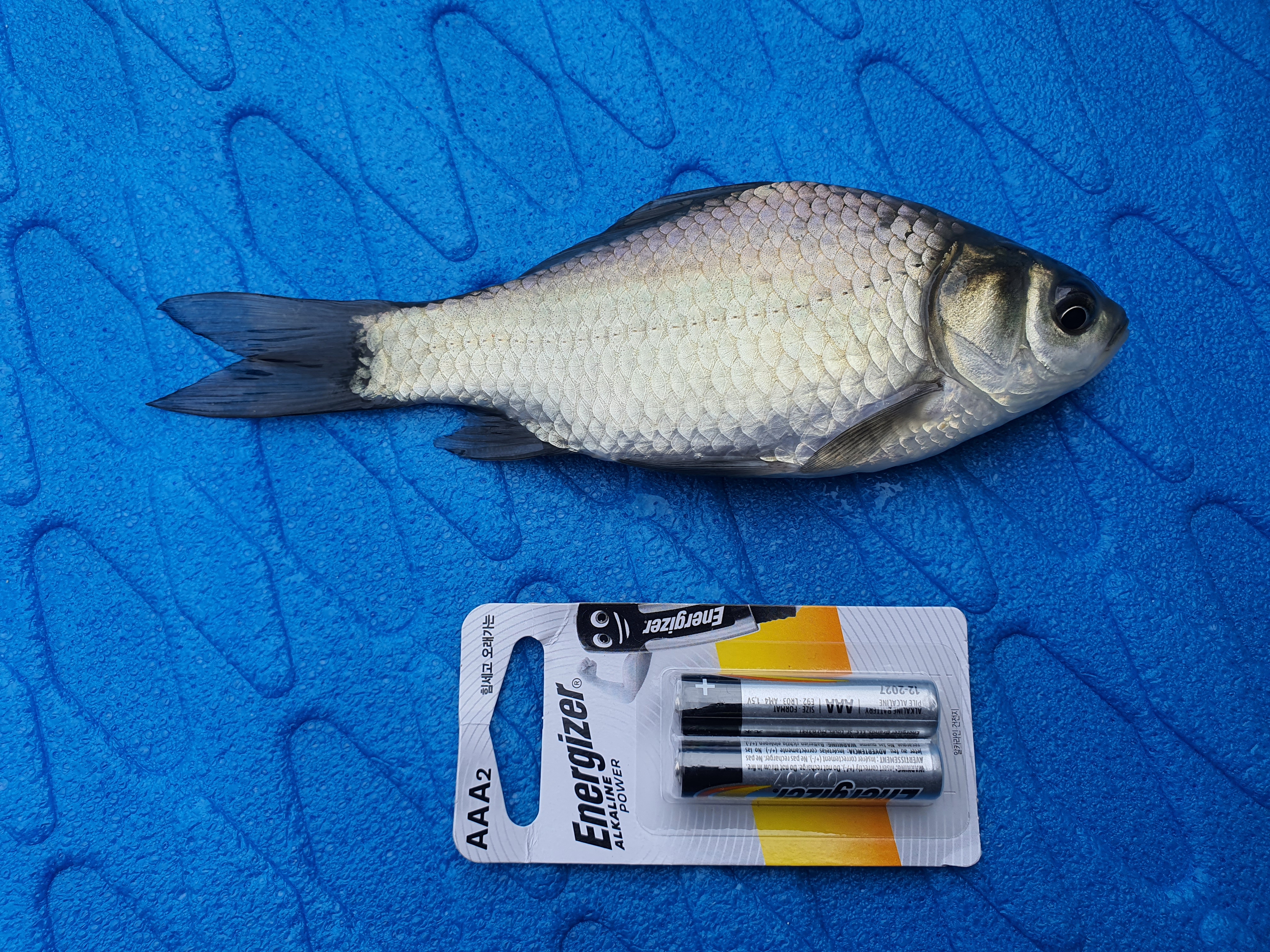 연이어 비슷한 중간층에서 또 묵직한게 걸렸는데 이번엔 전동릴이 잘 감기지도 않습니다. 어찌어찌 전동릴을 겨우 감으니 이번엔 붕어가 올라오네요.