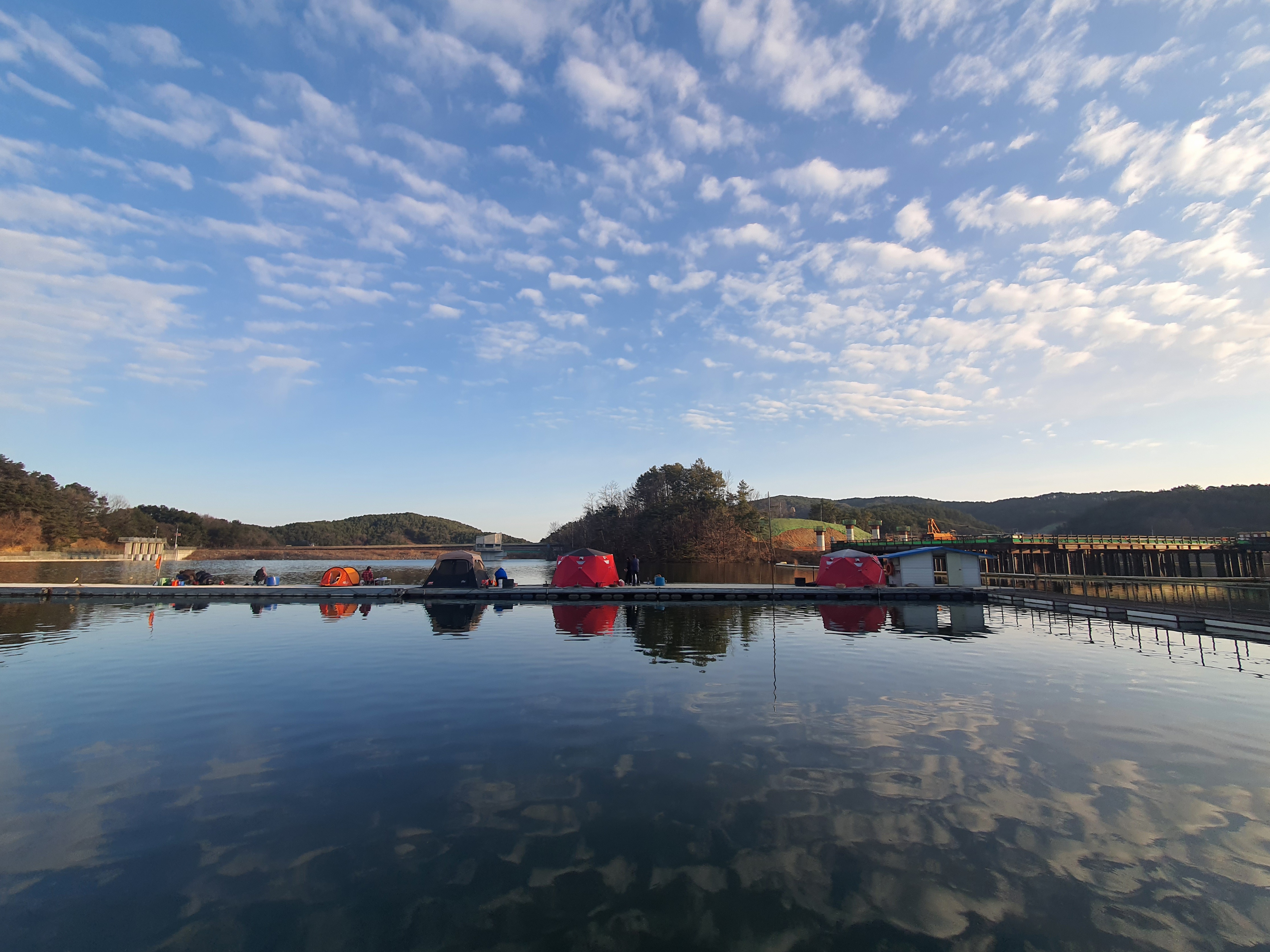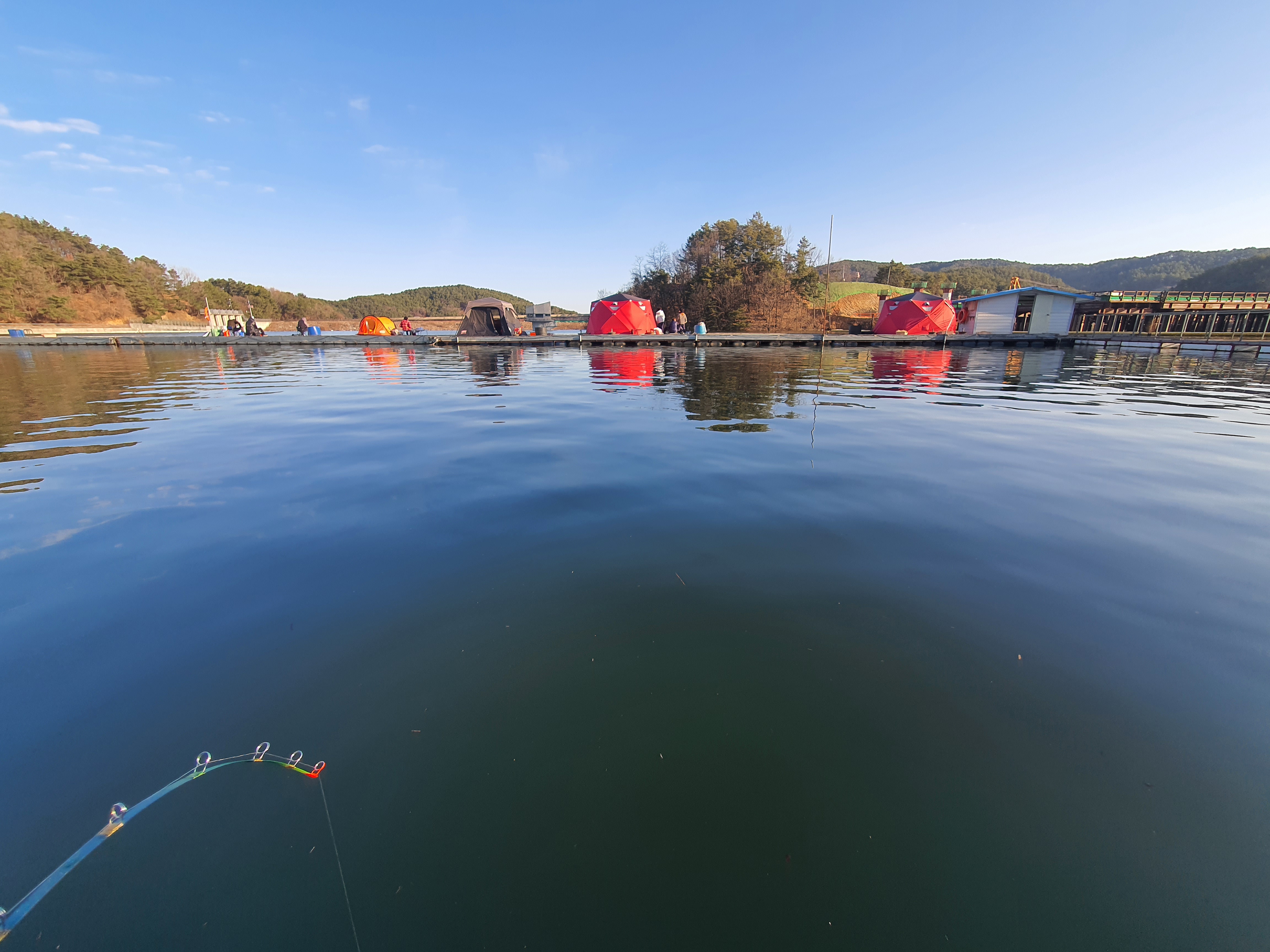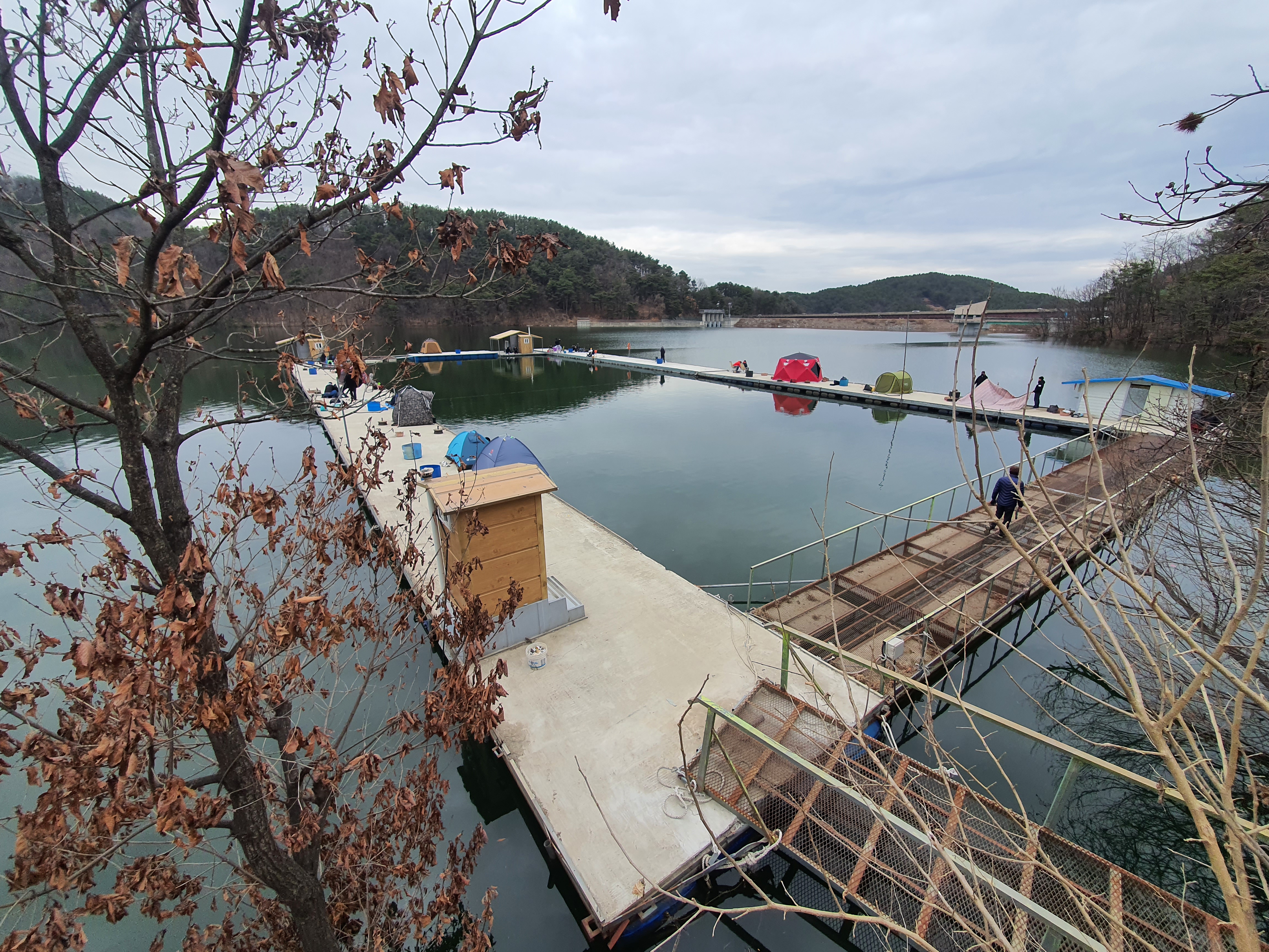 바람은 거의 없는 예보라 텐트를 안 가져가려다 그래도 편안하게 하기위해 챙겼는데, 흐린날씨로 영상이지만 쌀쌀한 날씨로 잘 챙겨갔네요. 언제나 그렇듯 마둔낚시터 잔교 계단 내려가자마자 앞쪽 포인트에 자리를 잡았습니다.