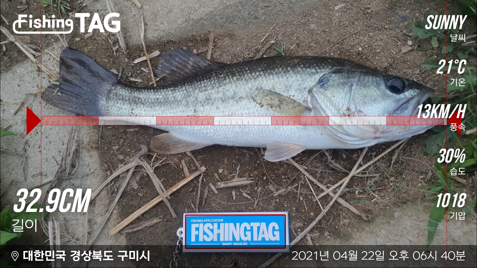 피싱태그로 사이즈를 계측해 봅니다. 32.9cm로 3짜 초반의 짜치네요. 다음에는 런커를 목표로 노려봐야겠습니다. 이제는 잡을 수 있다는 행복회로가 발동되어 예정된 시간보다 조금 더 던져보다 철수했네요.