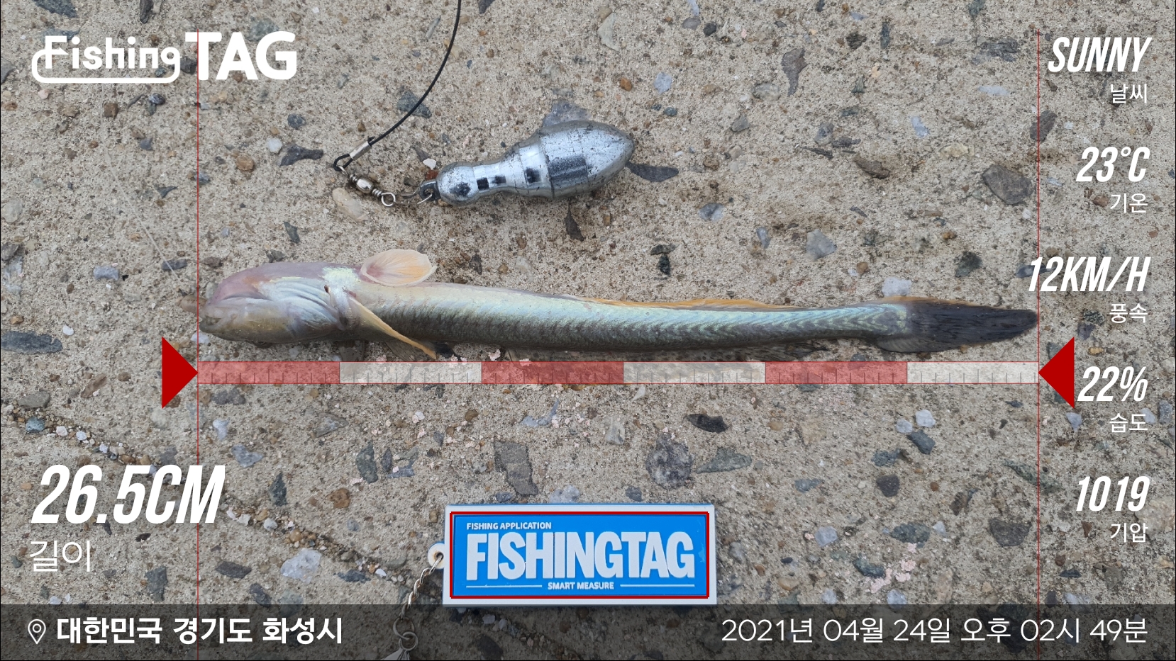 방울이 딸랑거렸다고 하지만, 듣지를 못했고 바람 때문이었거니 생각하고 채비 확인을 하기 위해 회수하는데 묵직이 전달됩니다. 2짜 중반의 망둥어가 올라옵니다.