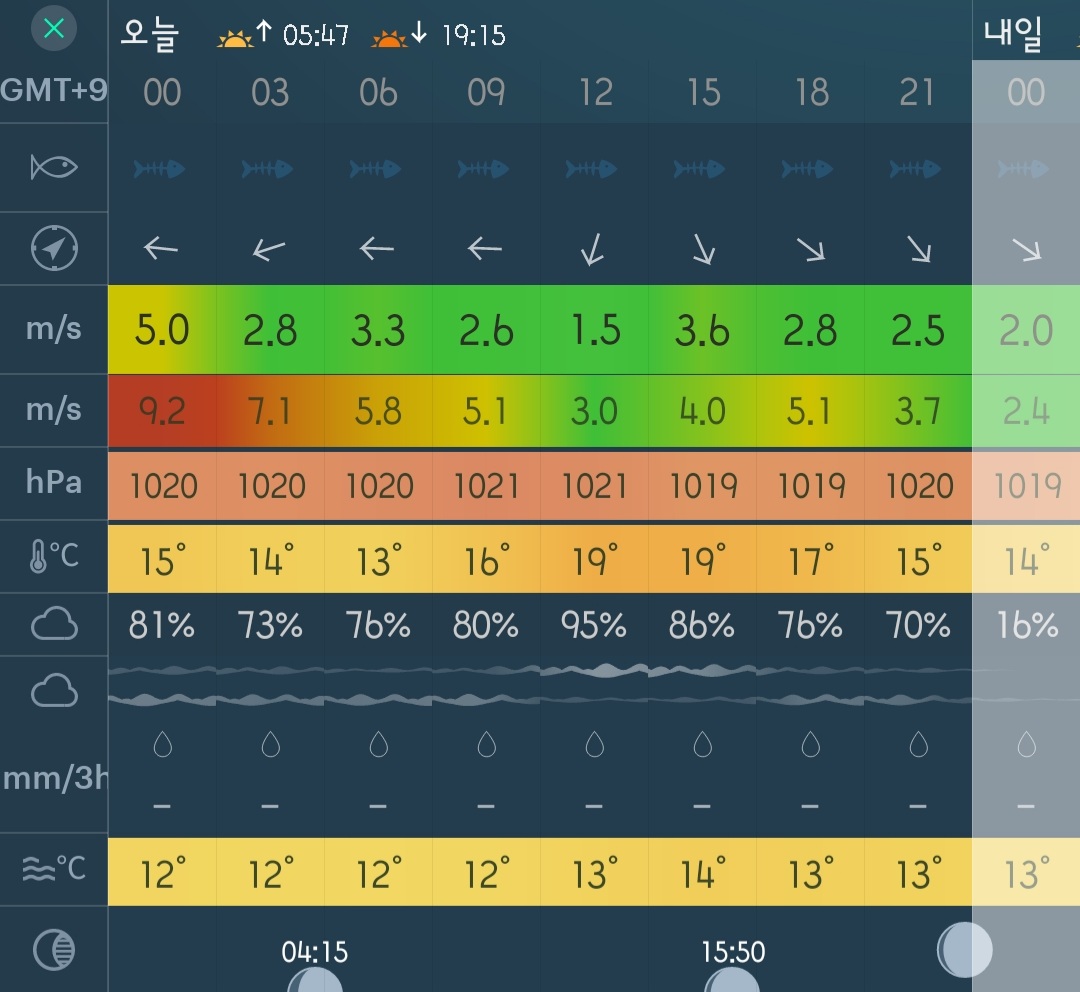 바람은 이전 주말보다 훨씬 나아지기는 했지만, 어느정도 바람이 있는 예보였는데, 실제로도 4단 수준의 바람이 지속적으로 괴롭히기는 하더군요. 그나마 입질을 구분할 수 있는 바람이라 제대로 즐길 수 있었던 출조가 아니었나 합니다.