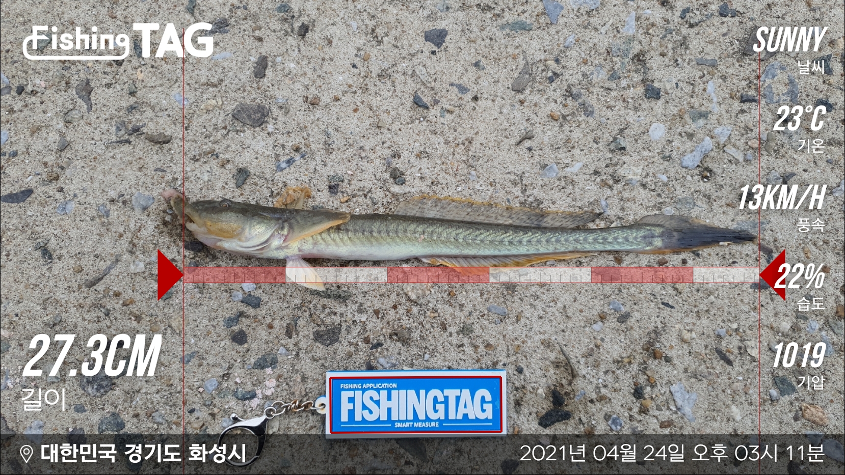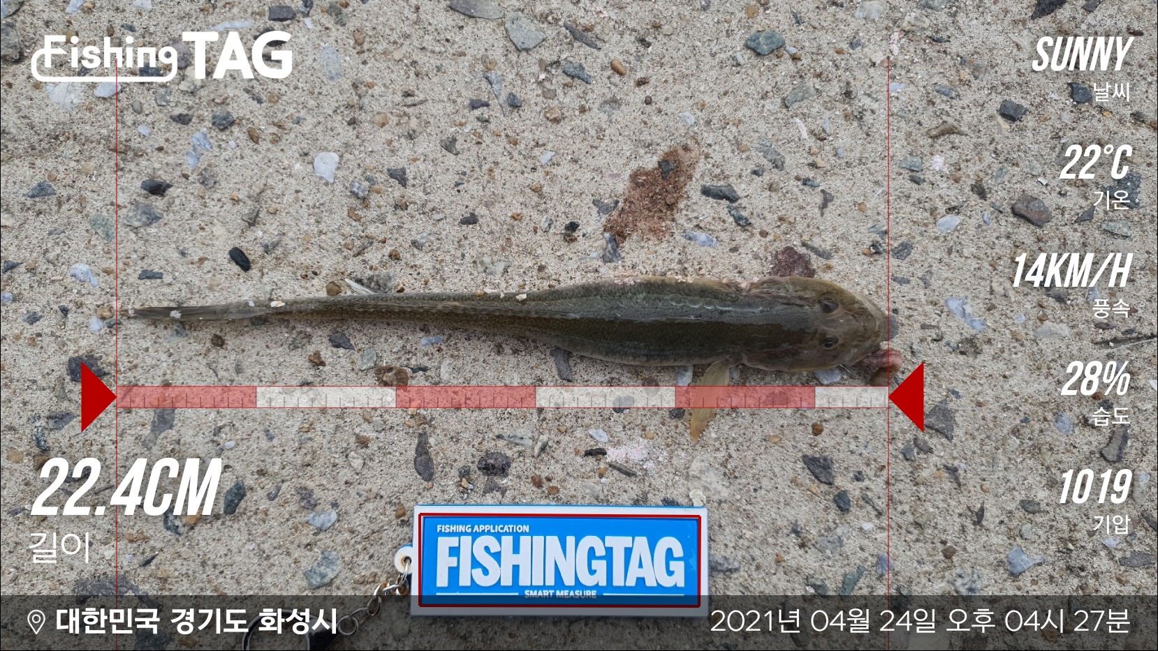 시작한지 만조시간이 다가오는데도 불구하고 도리와 검빨 아우가 각 첫수를 했음에도 여전히 입질이 없더군요. 그러다 BT30-425 초릿대에서 아주 약한 입질의 반응을 확인하고 챔질해서 올리는데 살짝 무거움에 히트임을 직감! 2짜 초반의 망둥어가 올라오네요.