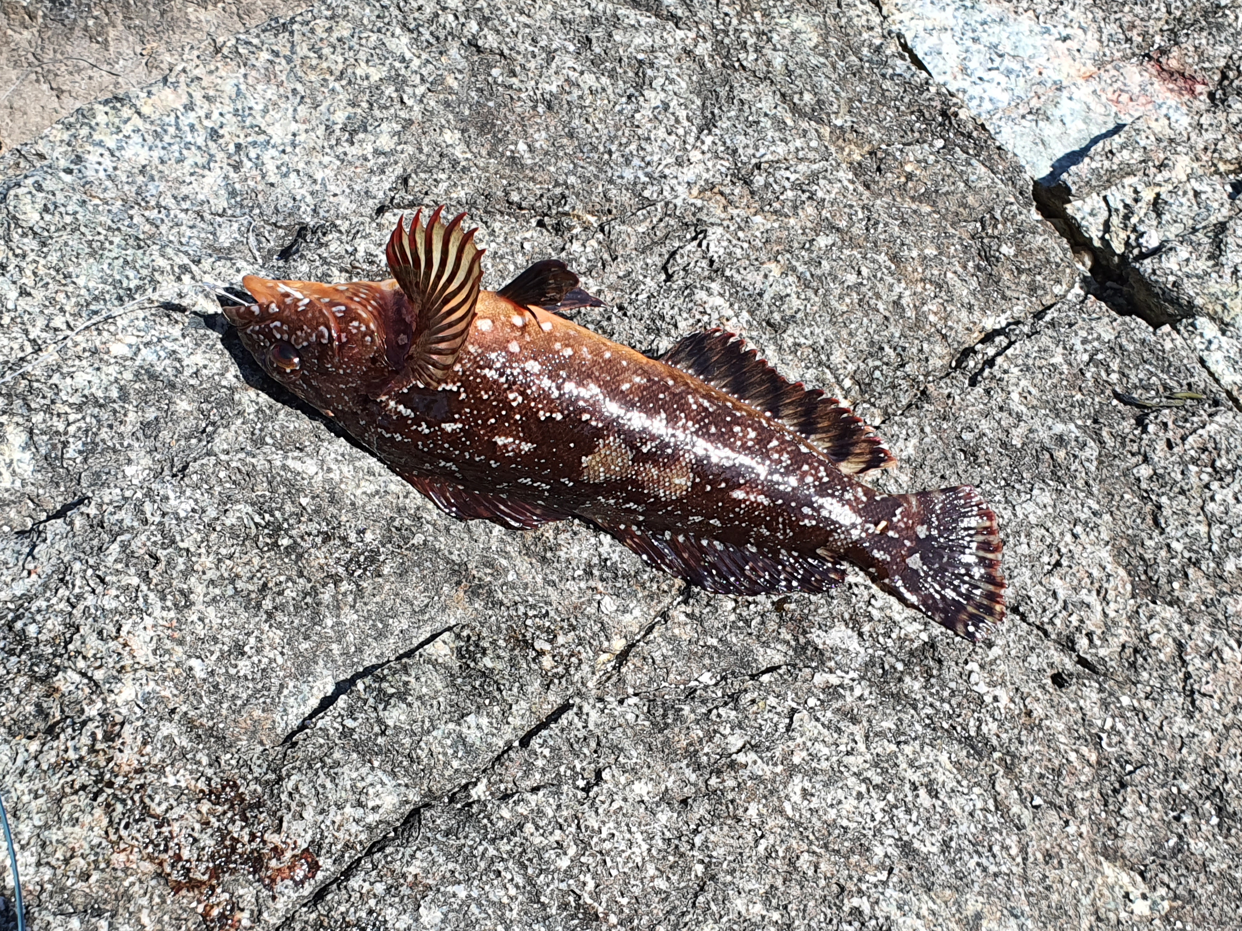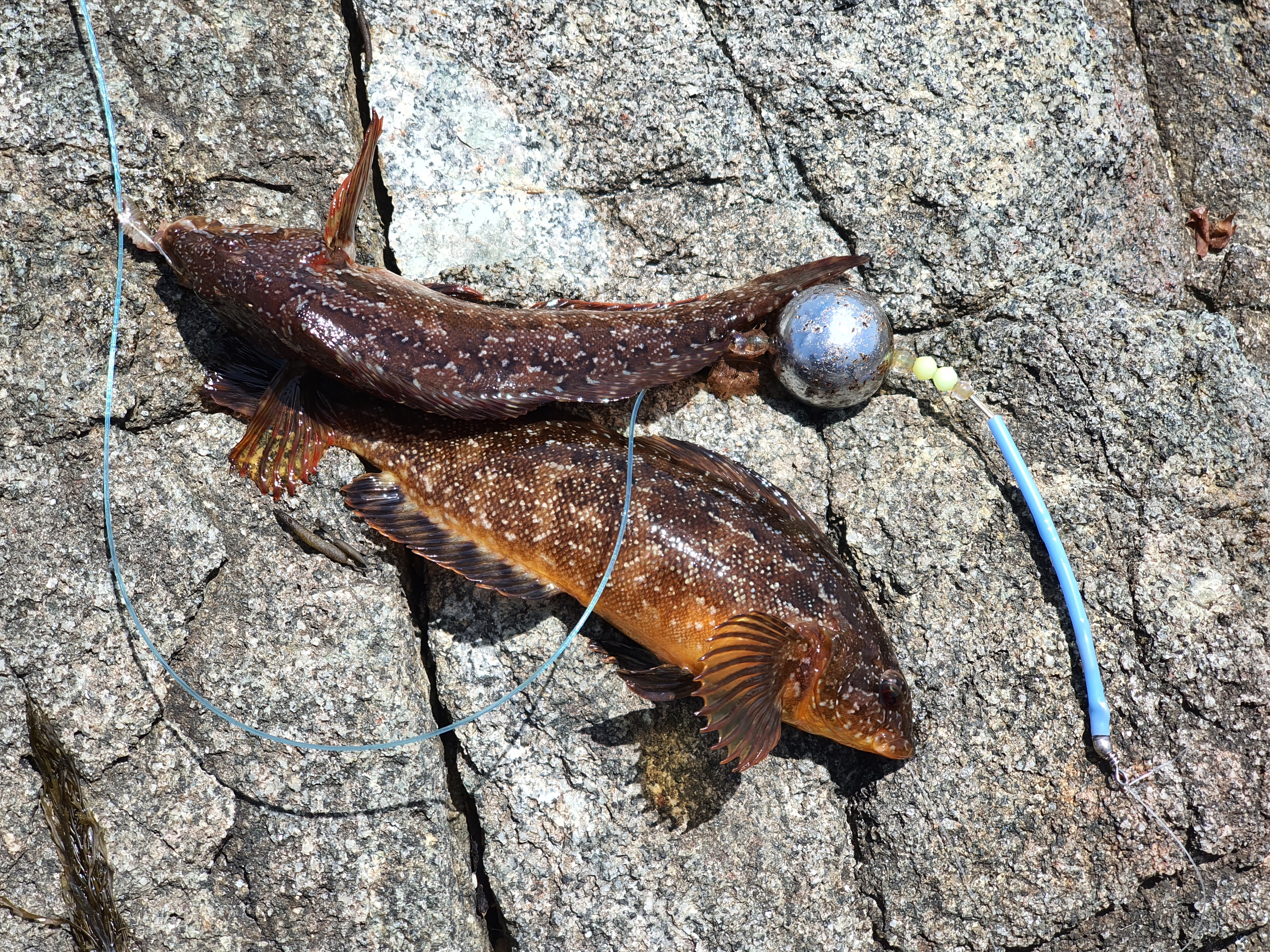 그리고, 다시 던진 채비에 입질과 함께 챔질해서 올리니 노래미가 쌍거리로 올라오네요.