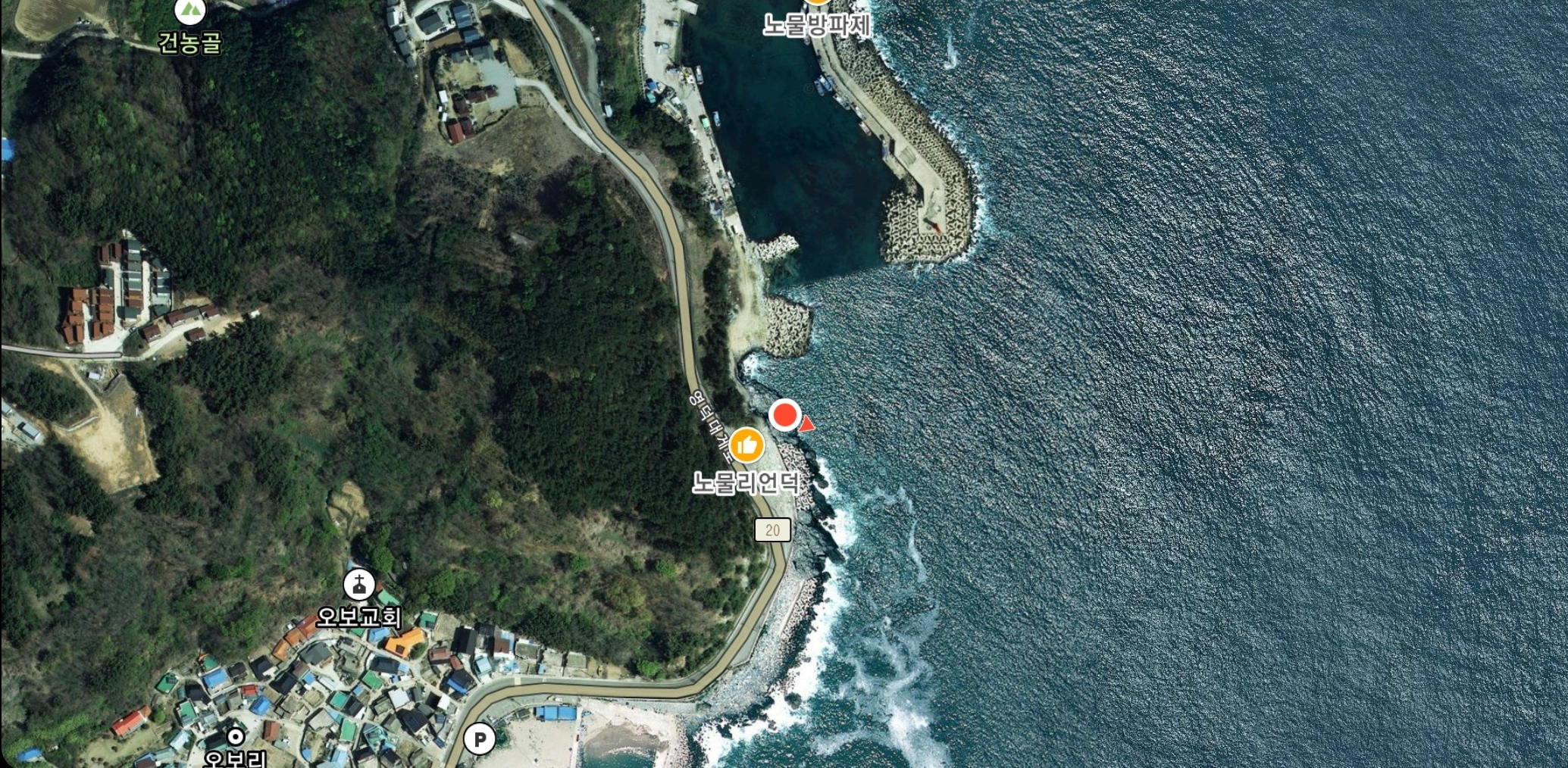 새벽 5시경 도착한 첫번째 포인트는 노물방파제 인근 갯바위 포인트입니다. 유튜브를 보다가 발견한 포인트로 찌낚시에 보다 적합한 포인트이기는 하지만, 원투낚시도 가능한 포인트라 찾아보았습니다. 노물리 언덕에서 계단을 타고 내려가다가 갯바위쪽으로 빠지면 발판이 좋은 갯바위 포인트가 있습니다.
