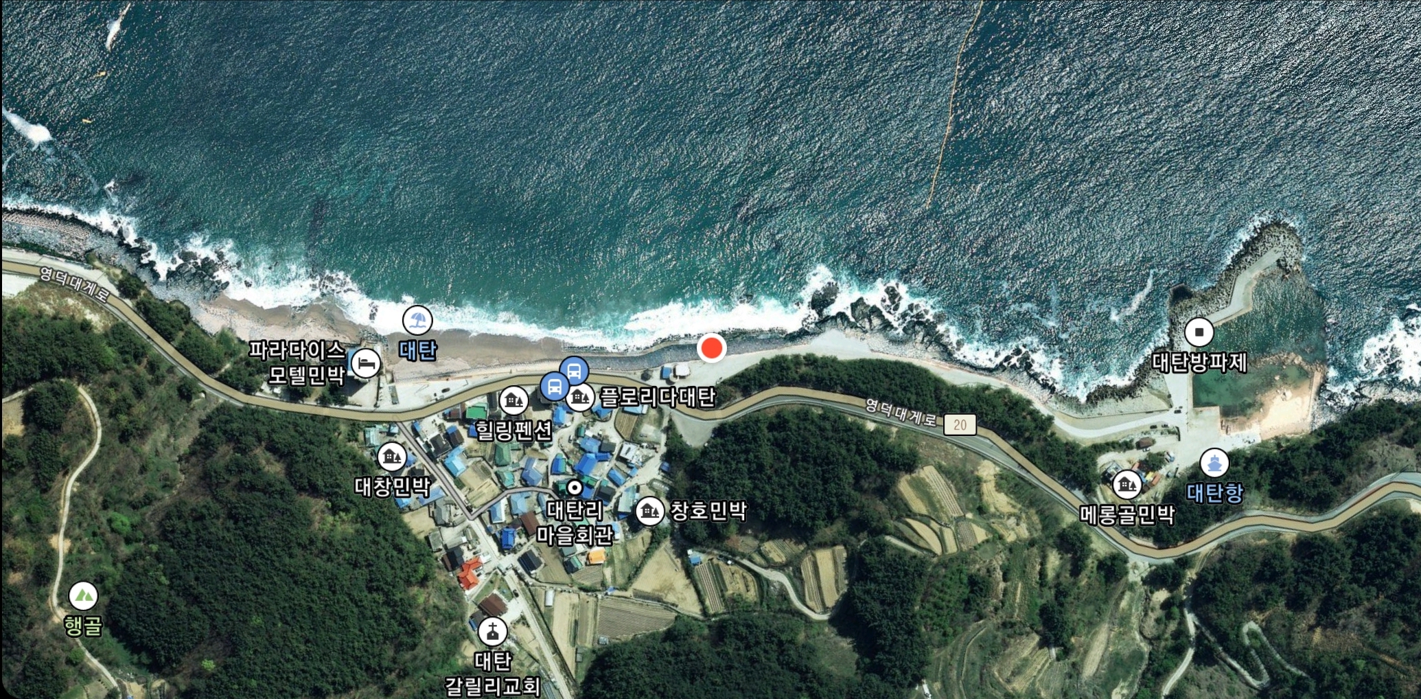 식당 바로 옆으로 계단식 발판 좋은 콘크리트 바닥과 석축으로 이루어진 포인트입니다. 좌측으로 대탄해변이 보이네요.