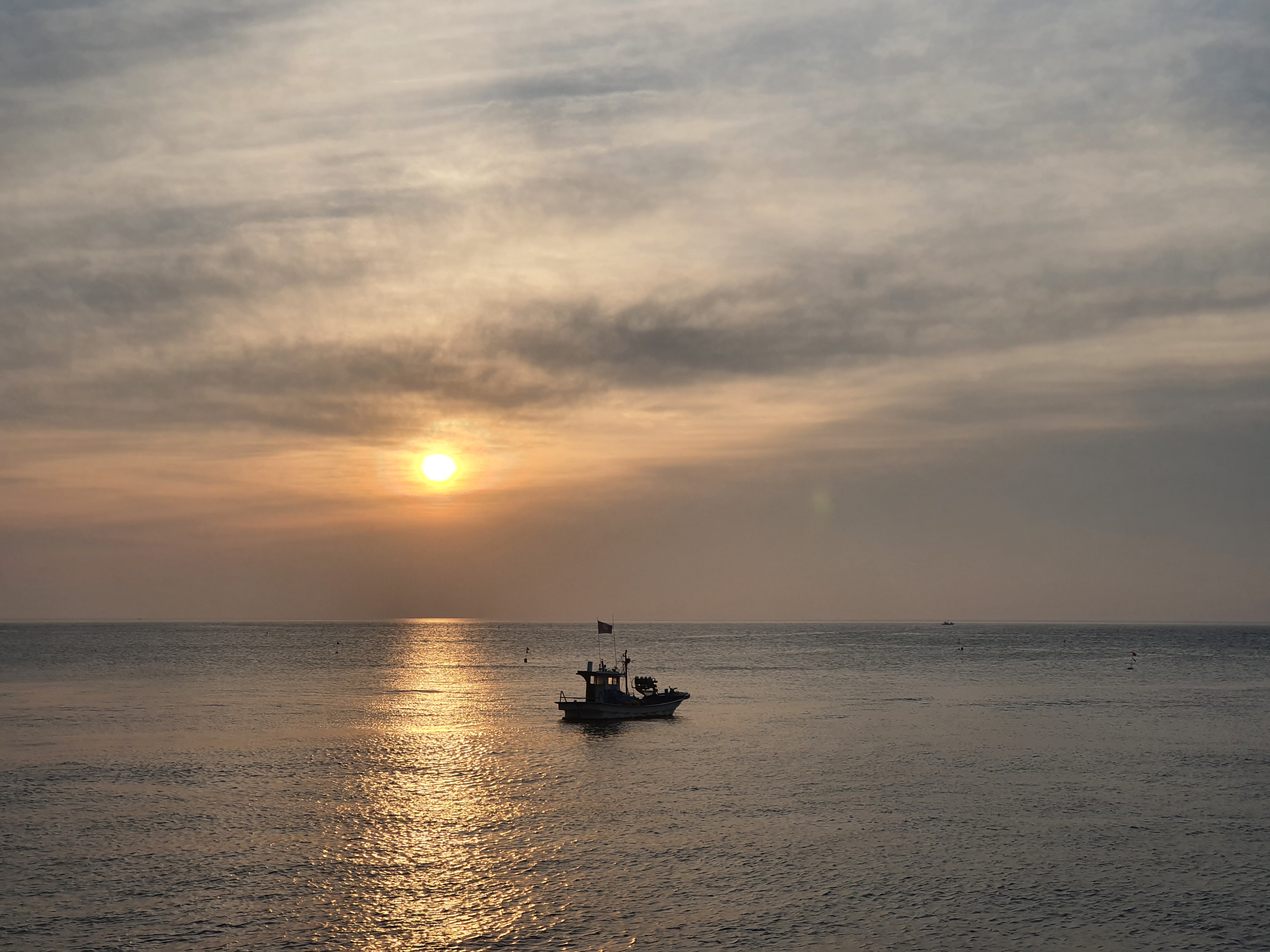이른 아침에 인근 노물항에서 출조하는 어선들이 떠오르는 태양과 함께 멋스러움을 더하는 포인트이기는 하지만, 수십분이 지나도록 입질이 없더군요. 게다가 바닥른 여밭이 많아서인지 채비가 자꾸 걸려 터져버립니다.