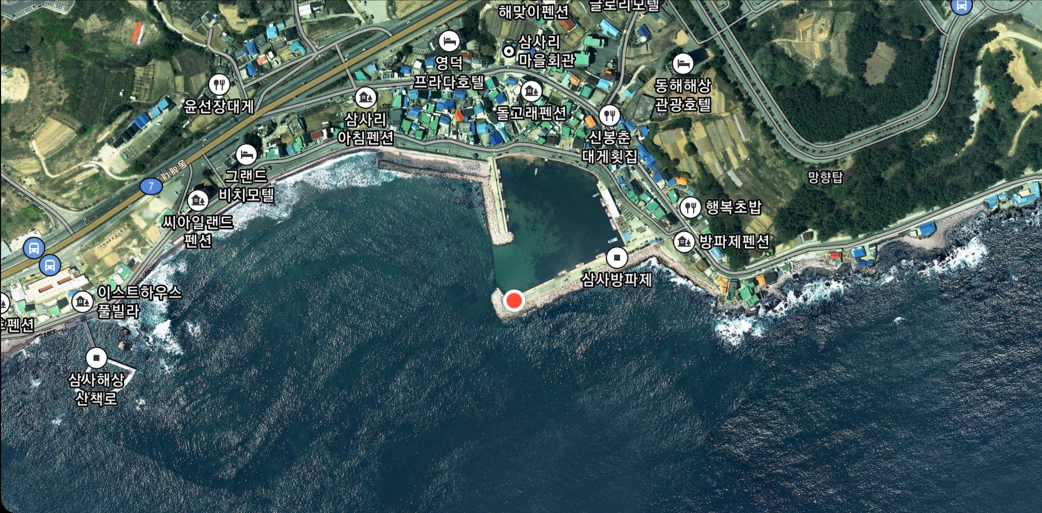 다시 장비를 정리하고, 다음 포인트로 이동해 봅니다. 중간에 방파제까지 차를 진입해서 캠낚을 즐길수 있는 포인트도 있었지만, 자리가 없기에 더 내려가 삼사항 삼사방파제로 들어가 봅니다. 해가 이미 높아지고 있어 햇살이 따가워지기 시작하더군요.