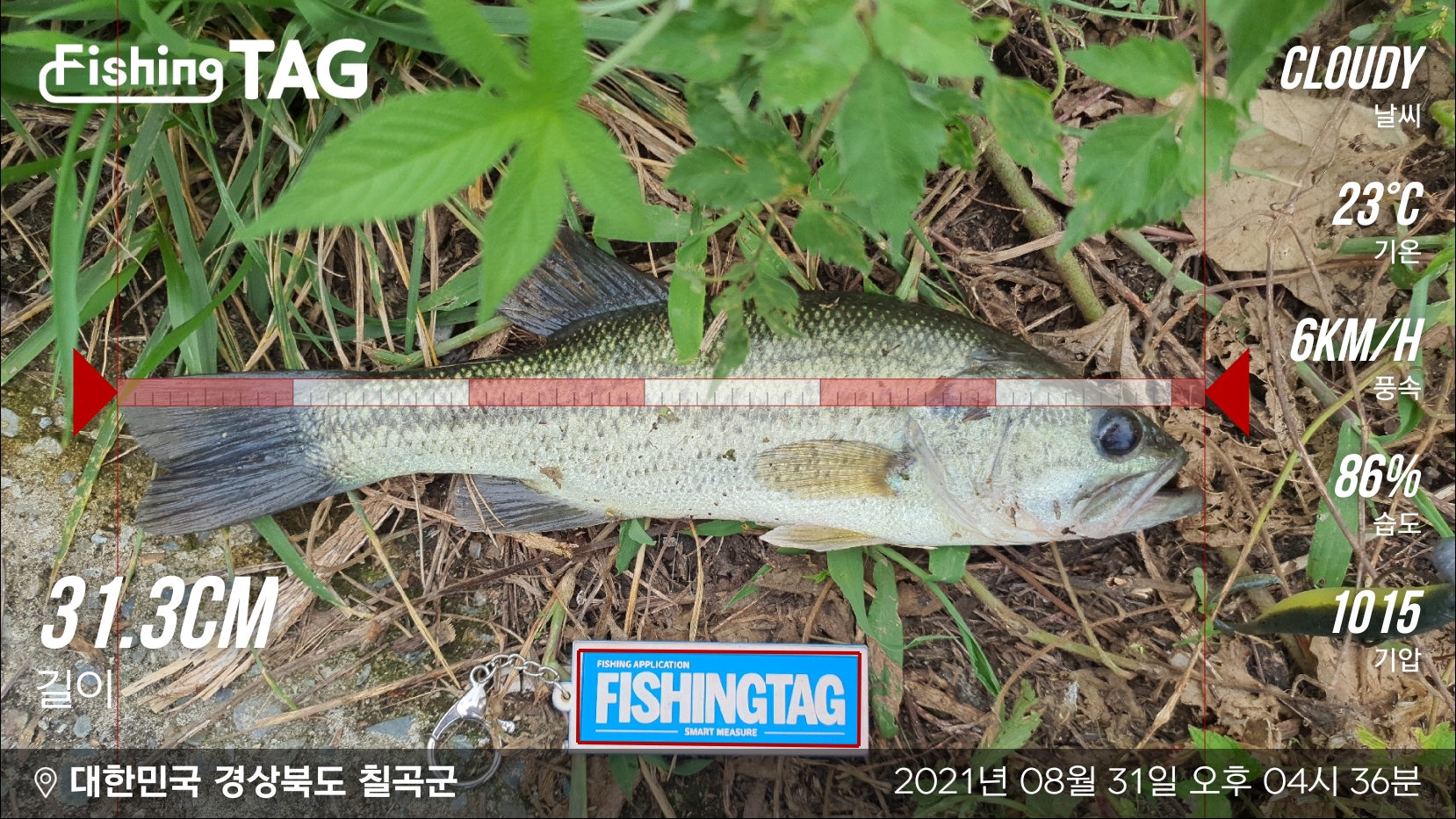잠깐 힘을 쓰긴 했지만, 바늘 털고 나갈 듯 하기에 금방 제압을 하고 들어뽕으로 올려봅니다. 올려보니 31.3cm의 배스입니다. 오랫만에 민물에서 보는 손맛이네요.