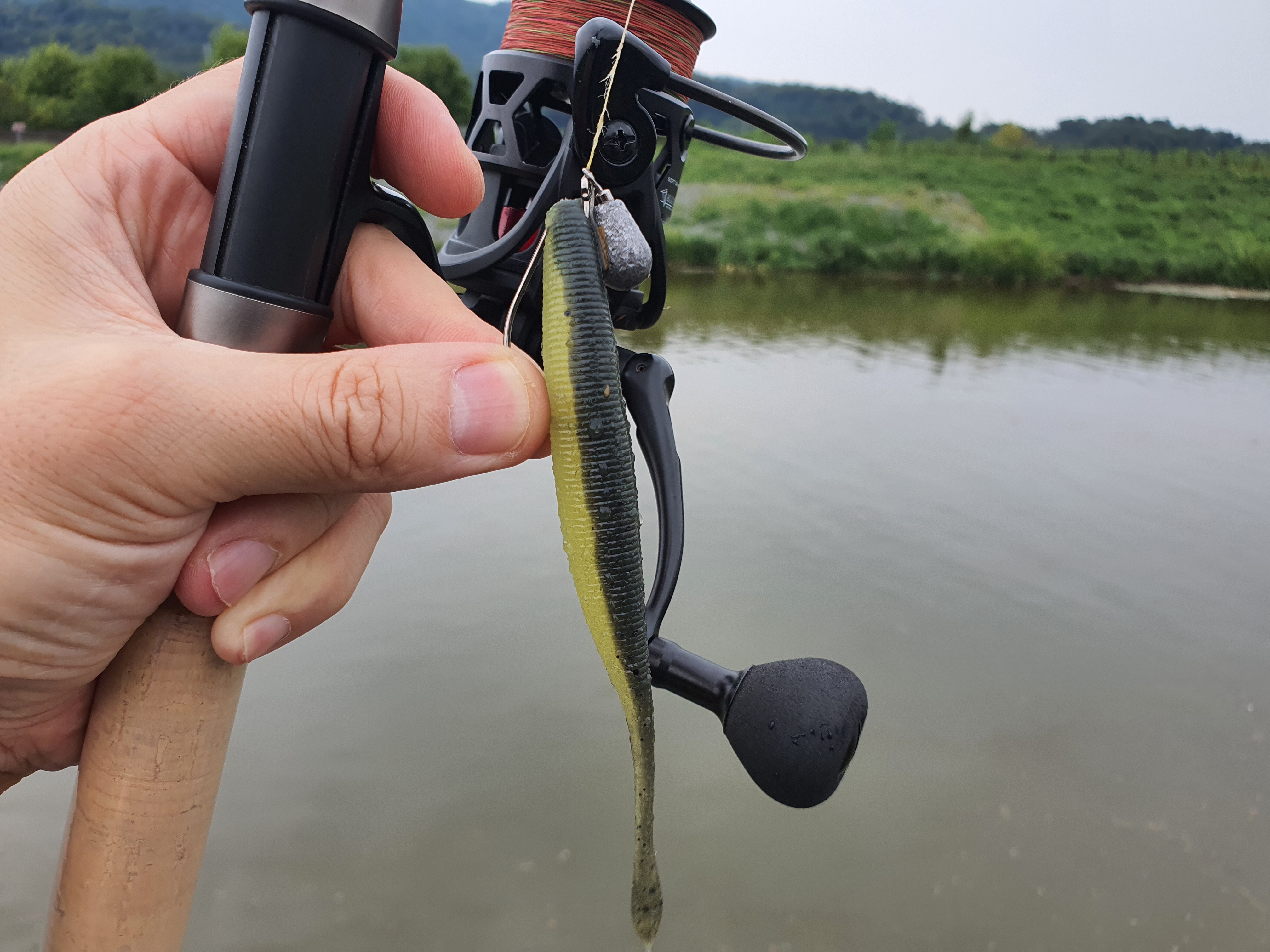 무심코 캐스팅한 후, 조금의 액션을 주다가 수초에 걸려 툭툭 당겨 채비를 넘겨 가라앉는데 뭔가 툭 걸리는 느낌이 옵니다. 또 뭐가 걸렸나 하는 와중에 갑자기 치고 나가네요. 역시 배스는 멀리 있지 않았나 봅니다.