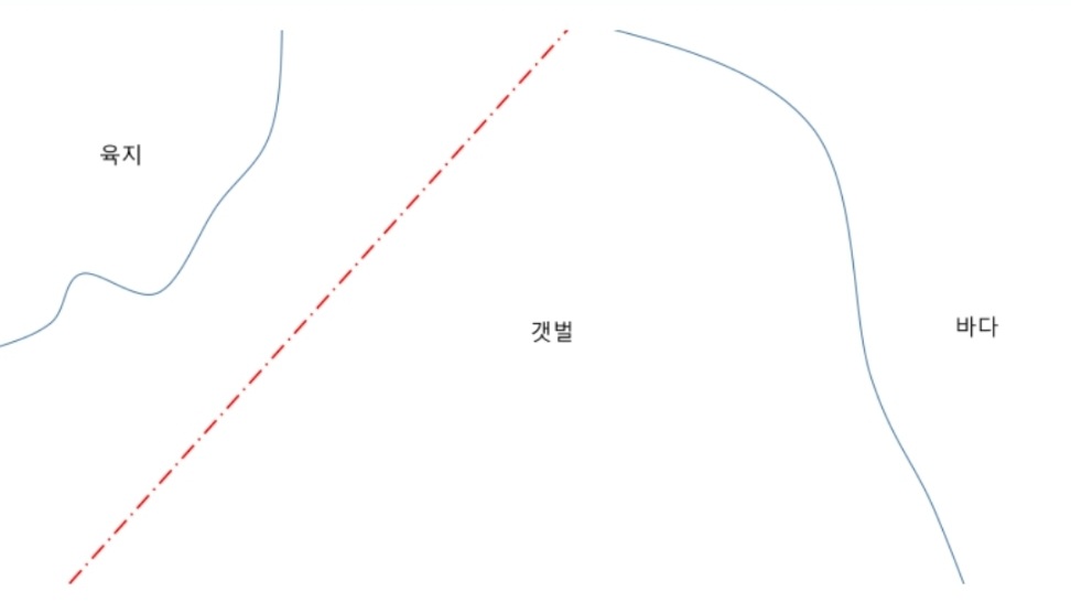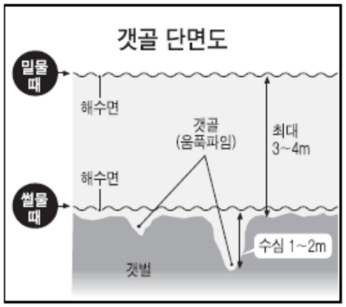 지형이 낮으니 '갯벌' 이라고 써놓은 위치보다 훨~~~~~씬 물이 먼저 들어오고 또 지형이 낮으니 '갯벌'이라고 써놓은 부근에서는 물이 들어와도 낮아서 물이 들어온 것이 안보입니다.