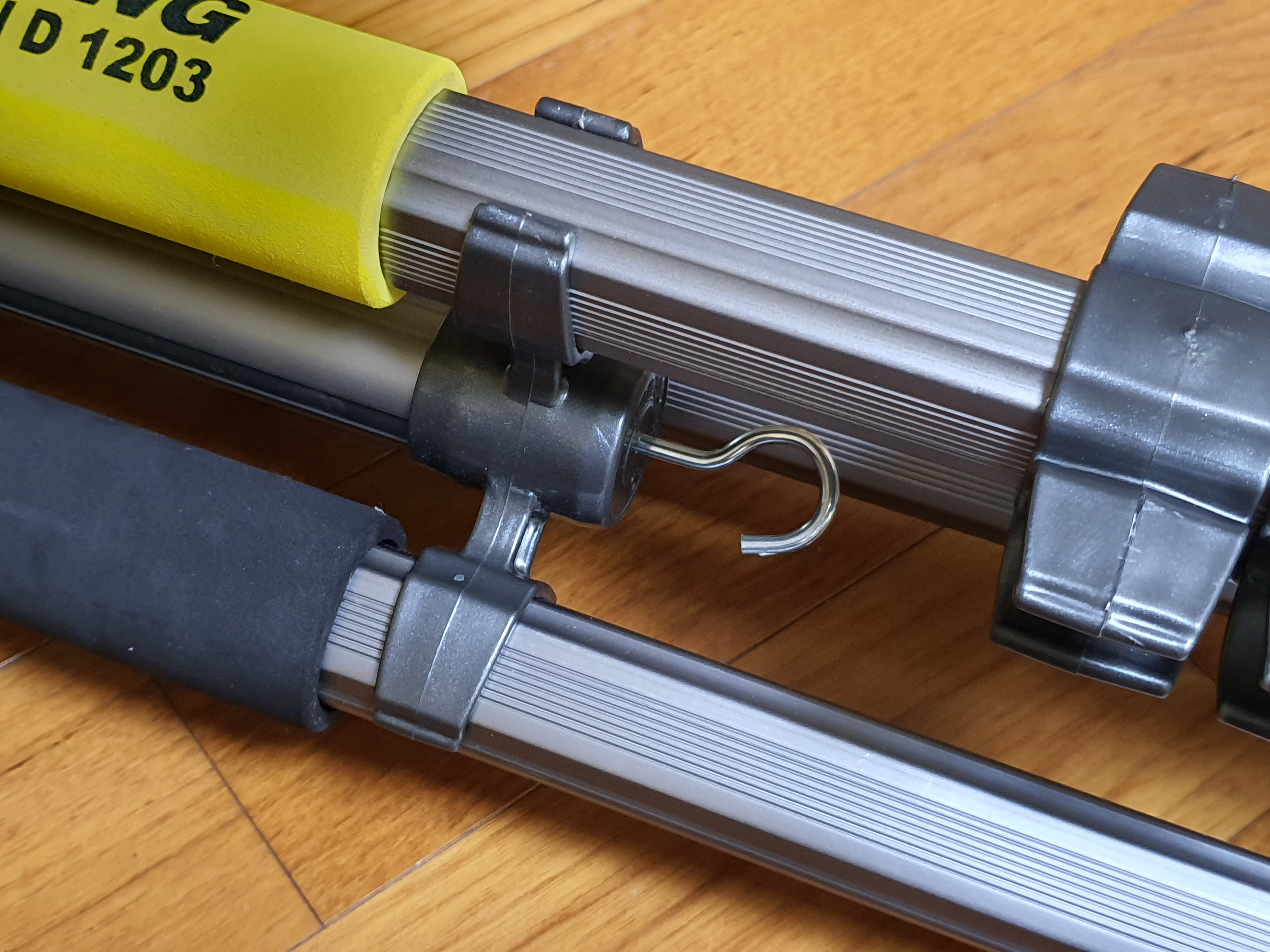 두번째로는 하단부 거치대를 고정시켜도 로드와 릴의 무게때문에 아래로 쳐지더군요. 제 사용상의 문제일수도 있겠지만 2~3회 사용간 중간중간 조절을 해 준 기억이 납니다.