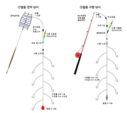 견지낚시대나 빙어낚시대의 채비 연결 방식은 그다지 차이가 나지 않습니다. 아래 채비 연결에서 찌를 넣은 상태이면 찌낚시 형태이고, 찌를 빼면 끝보기 또는 손의 감각으로 입질을 파악하는 형태라고 보시면 됩니다.