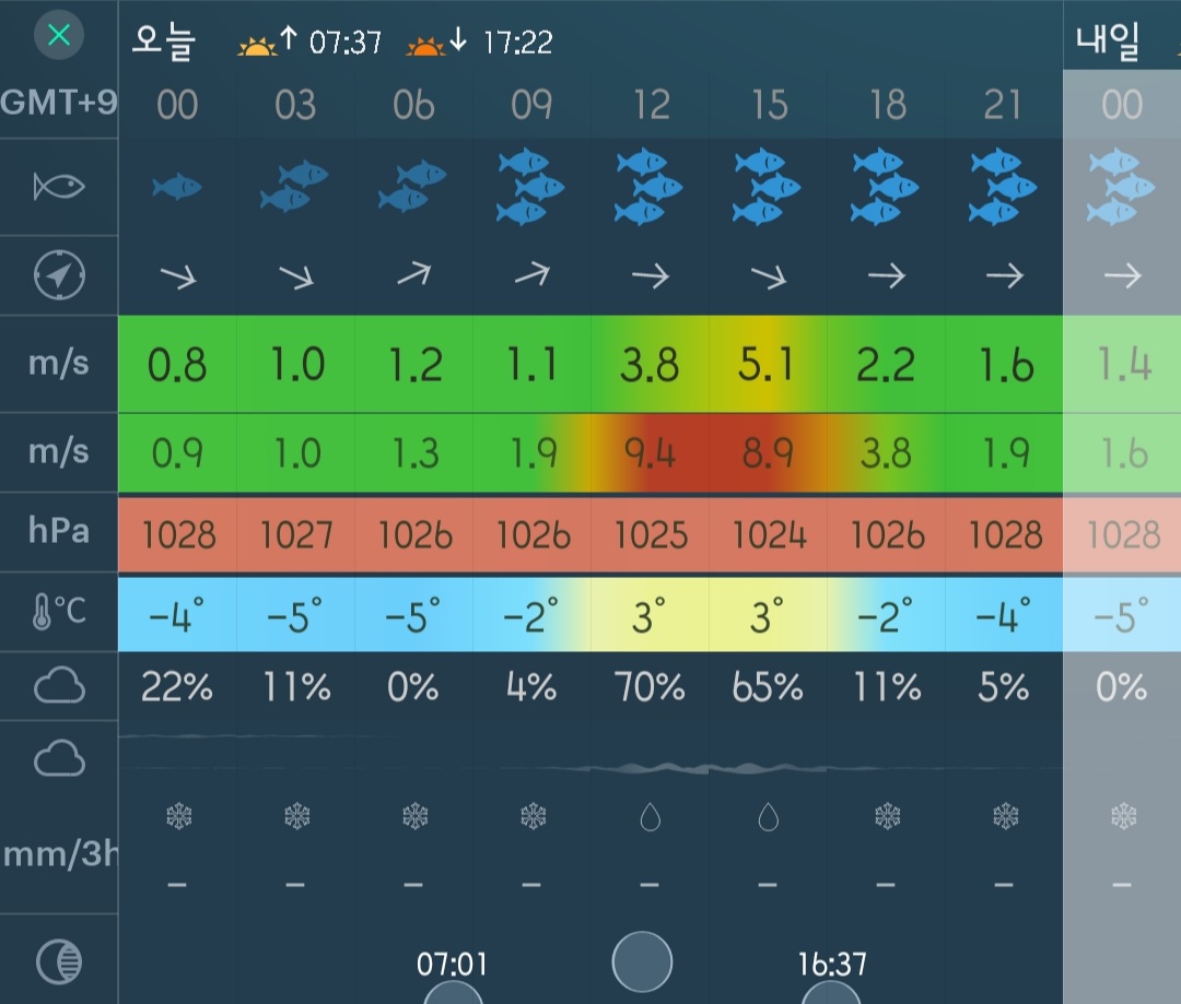 □ 날씨 : 바람 오전 1단 이하, 오후 3단 이상, 온도 3도(낮기온), 흐림