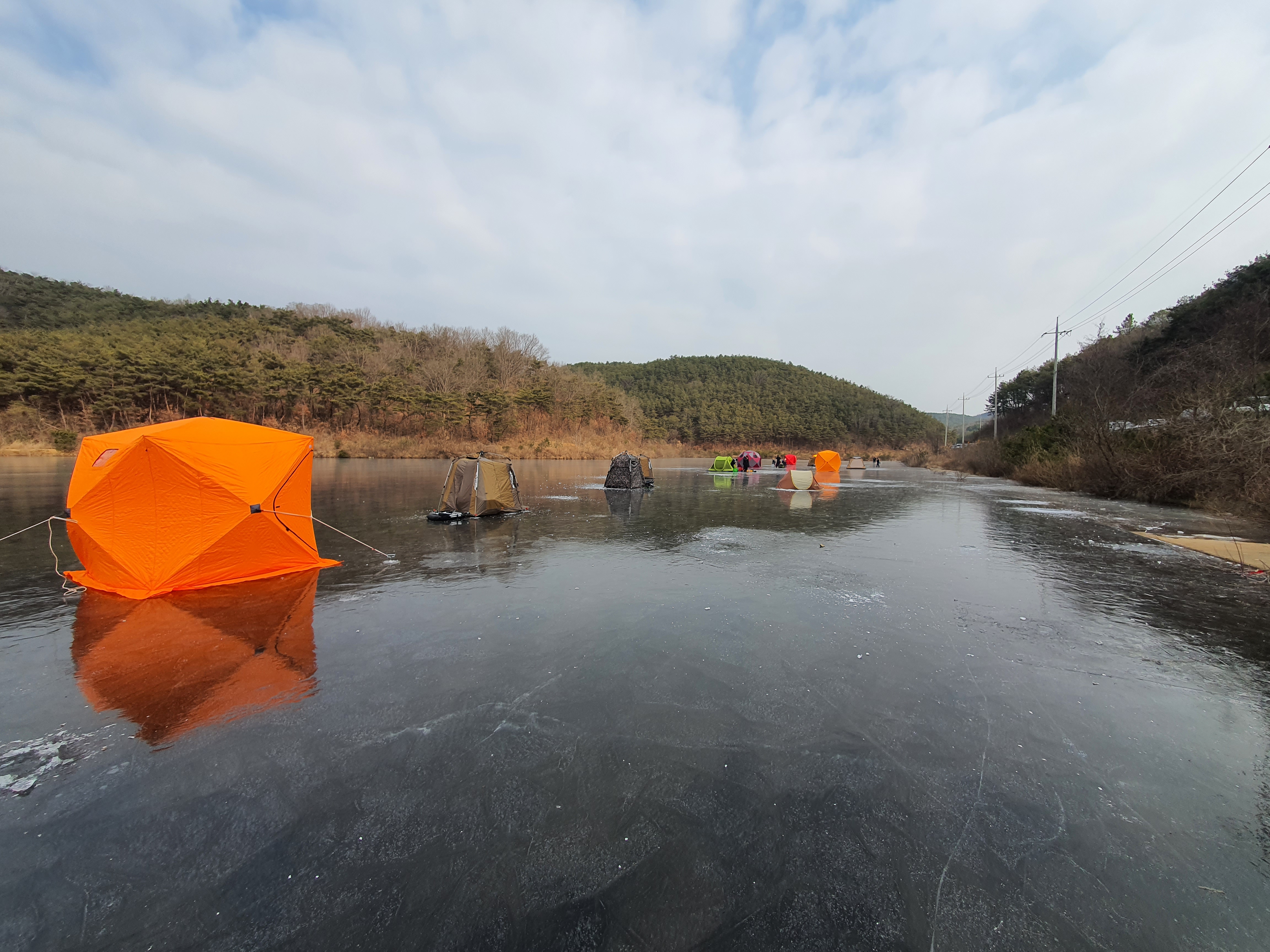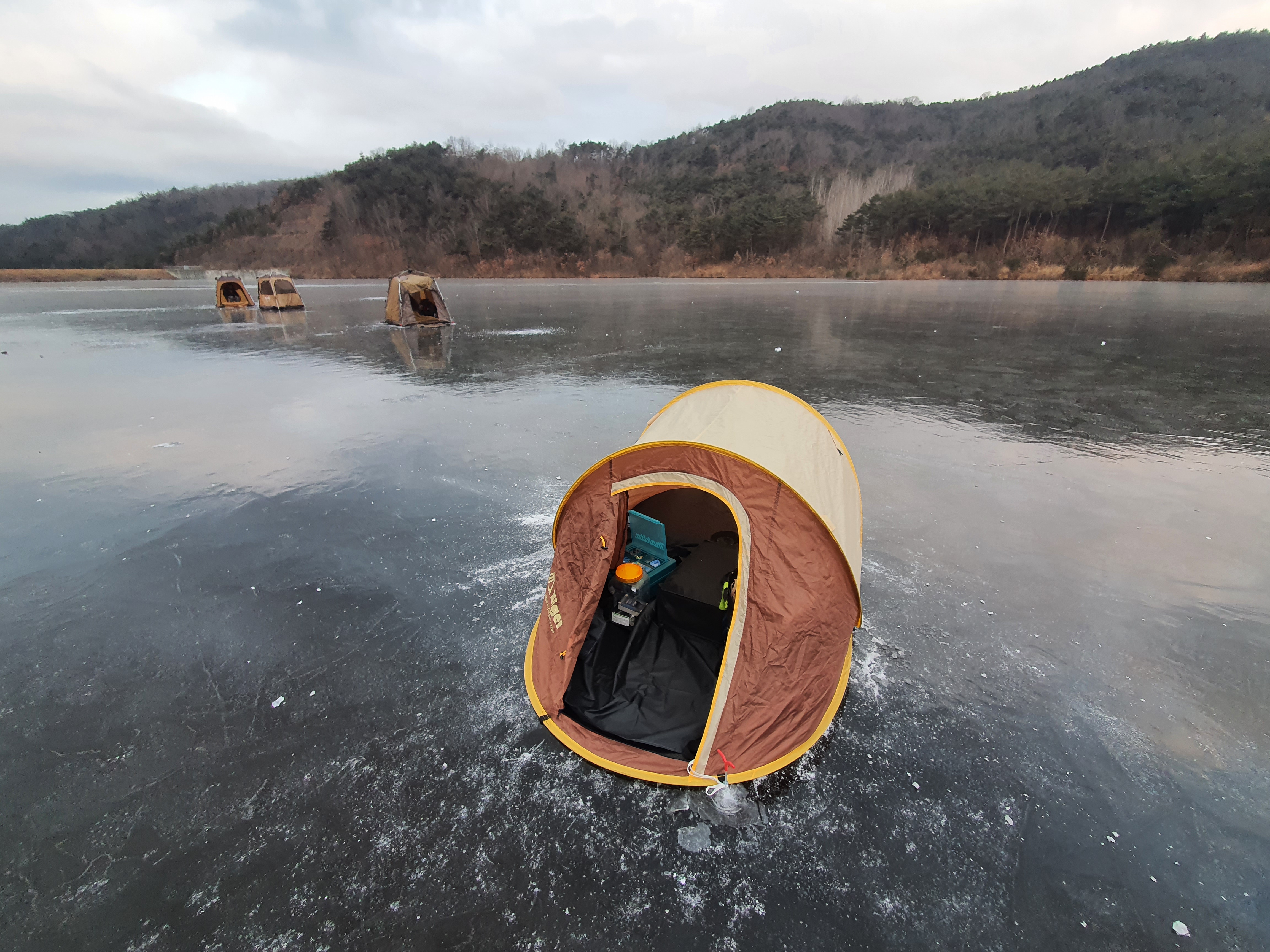 흐린 날씨에 눈도 잠시 온 날씨였고, 오전에는 바람이 거의 없었지만, 오후에는 바람이 불었던 날씨였네요. 전체적으로 빙어낚시하기에는 큰 무리가 없었다 생각되네요.