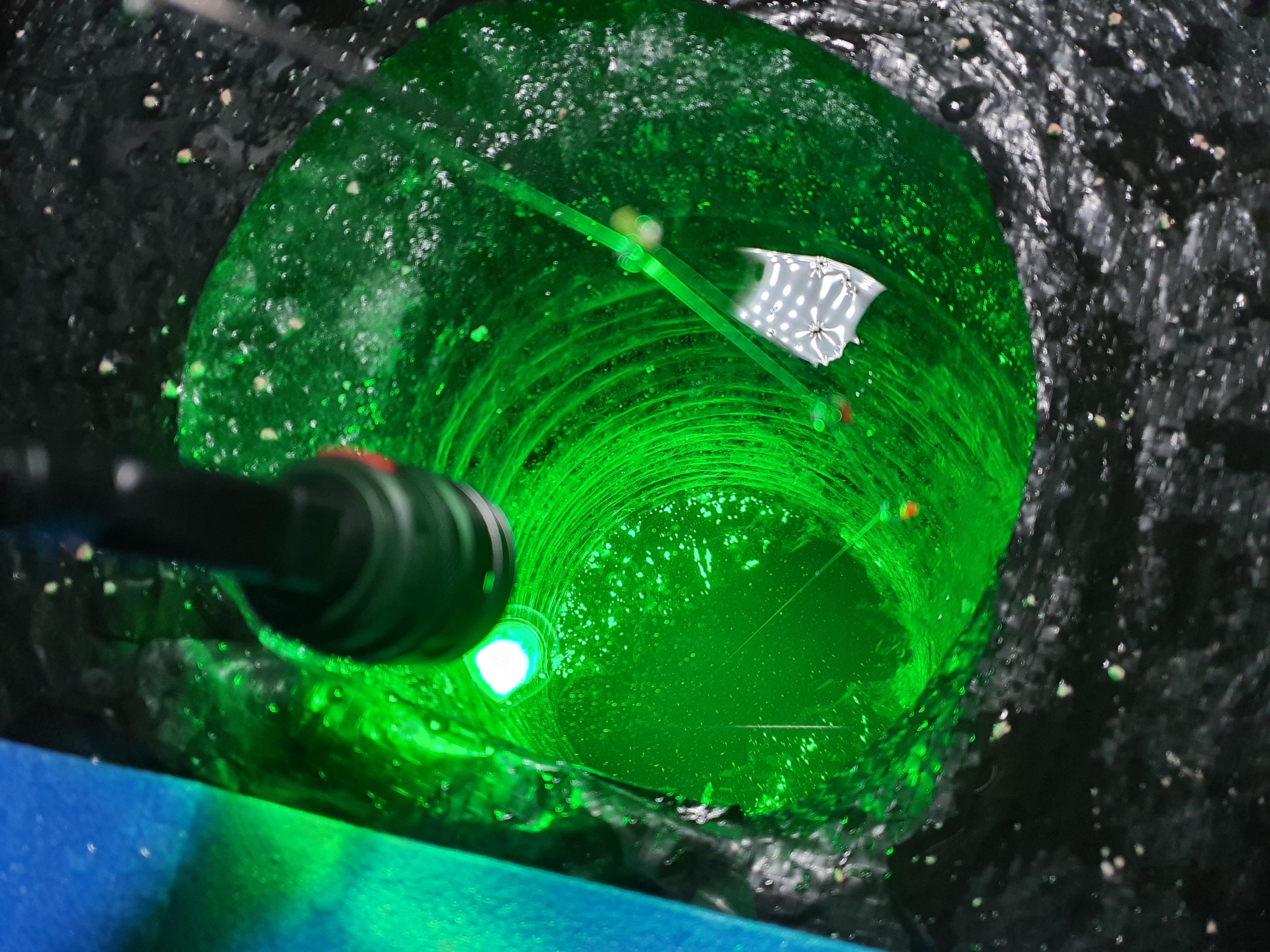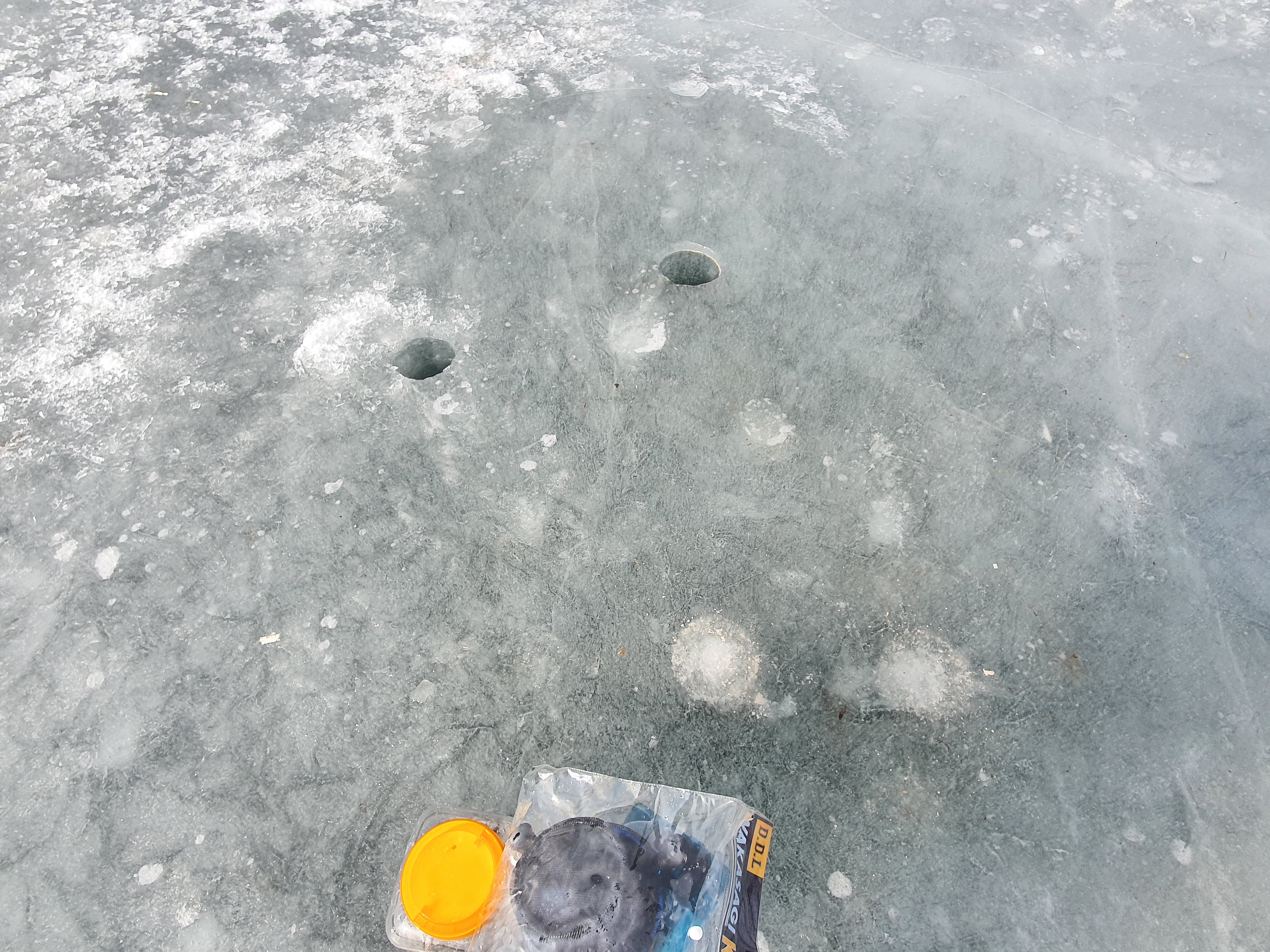 빙판 두께가 25cm를 넘어가는 두께더군요. 이 두꺼운 빙판의 구멍을 2개 뚫는데 금방이네요. 역시 잘 산 아이템 중에 하나입니다. 마지막 뚫는데 요령이 없어서 사진에 보는 것처럼 구멍 아래쪽에 얼음이 남아 있는데, 구멍을 뚫고 회오리 날을 살짝 내려 아래로 툭툭 치면 깔끔해 진다고 합니다.
