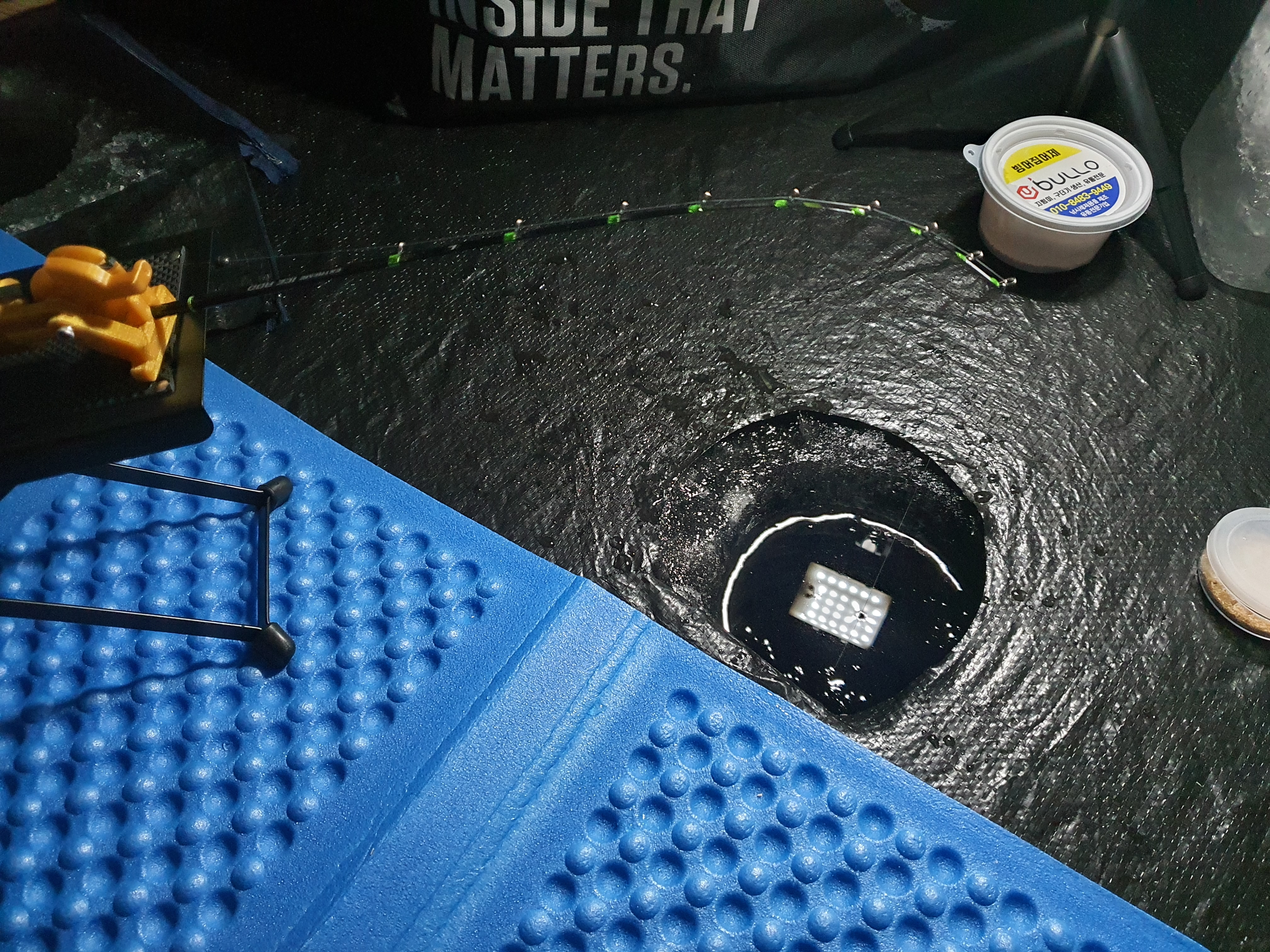 날이 밝아지니 2.3m의 바닥층이 보이더군요. 그리고, 빙어가 모였다 헤쳤다를 하며, 덕이에 입질을 하는 것이 보입니다. 눈으로 보며, 달려들면 챔질을 합니다.