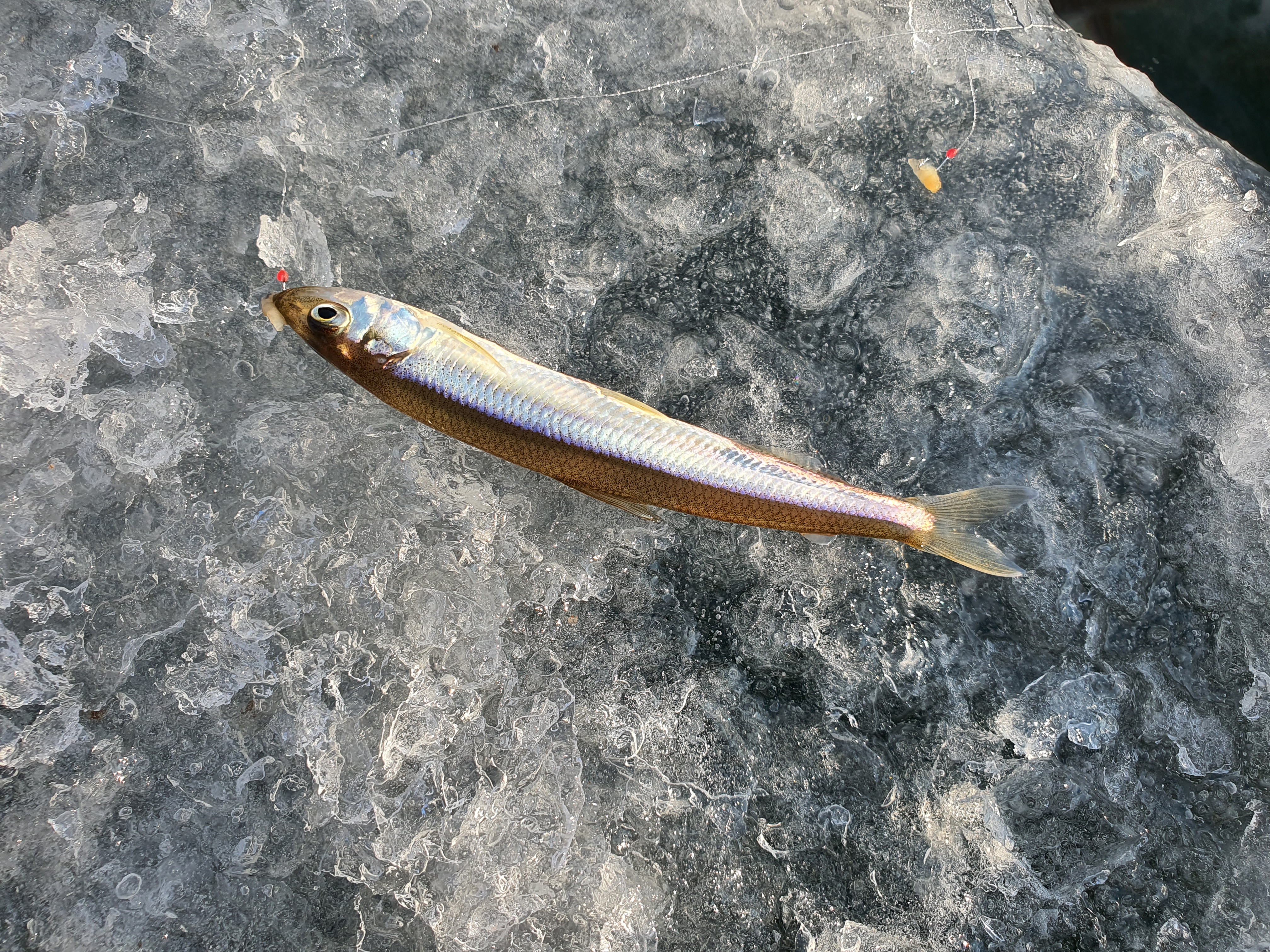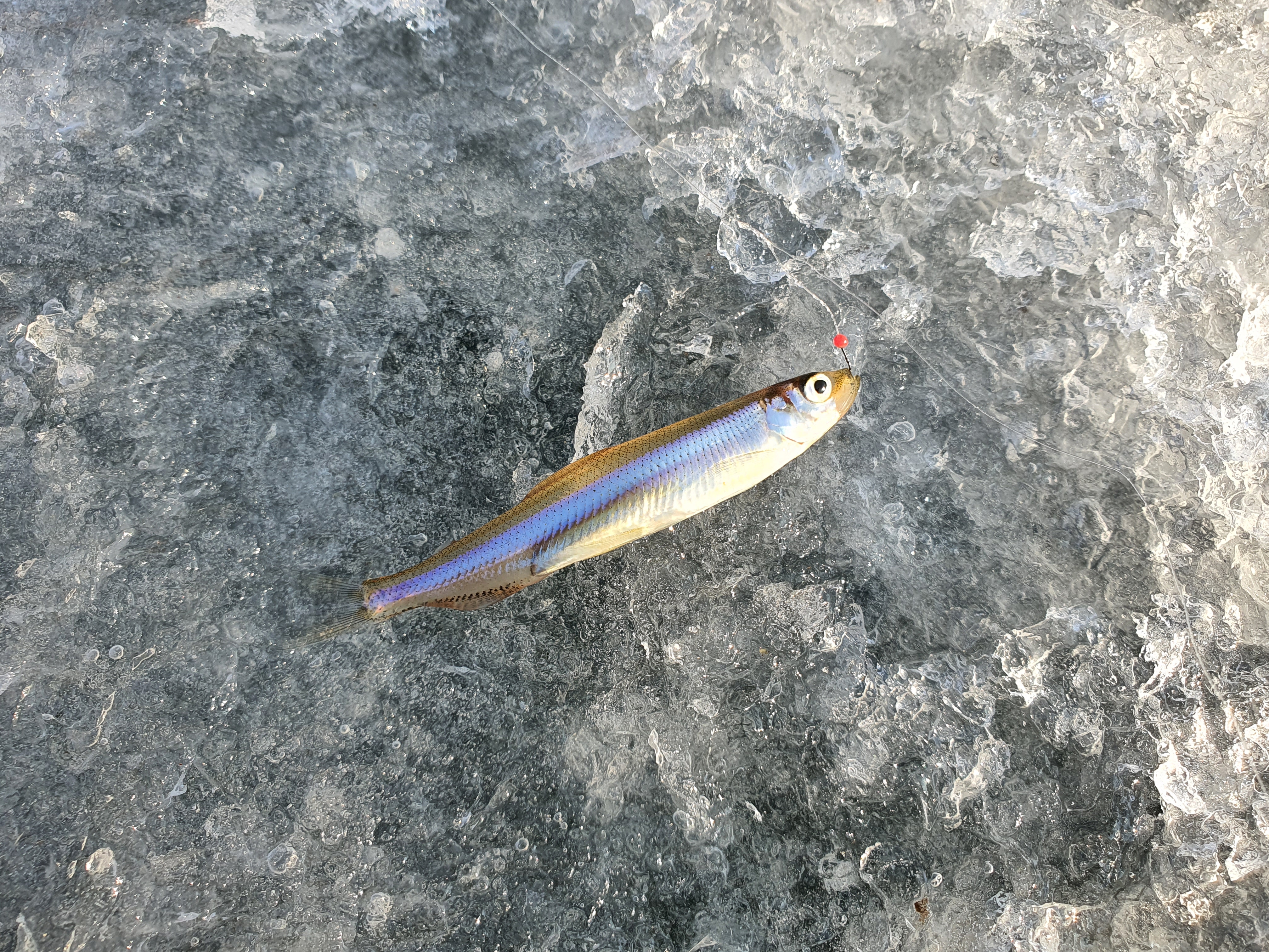 시작은 바닥부터라 바닥찍고 초리가 유동을 가지게 살짝 감는데, 바로 입질이 오더군요. 경천호 첫 빙어가 올라왔습니다. 사이즈가 좀 작네요.