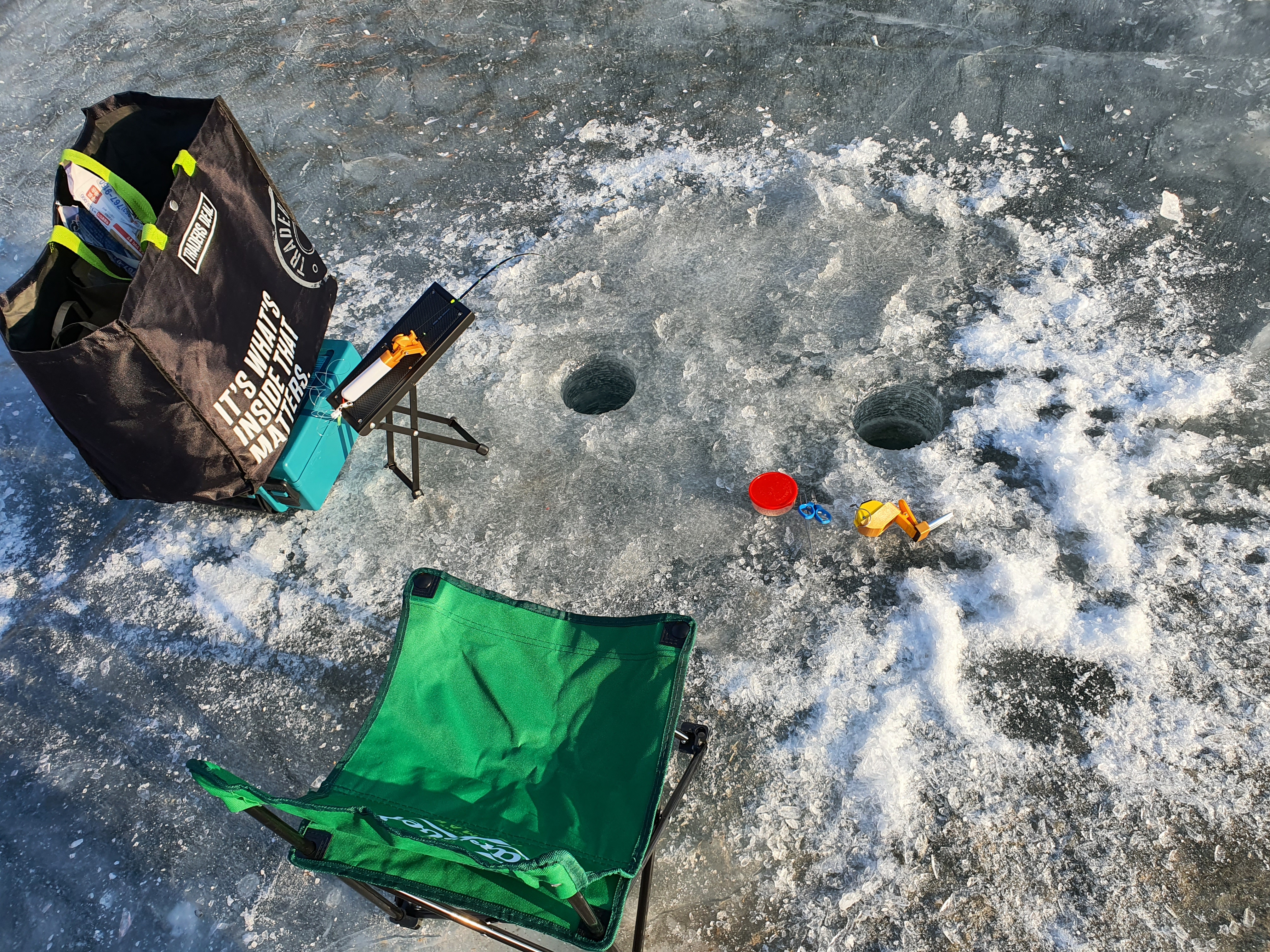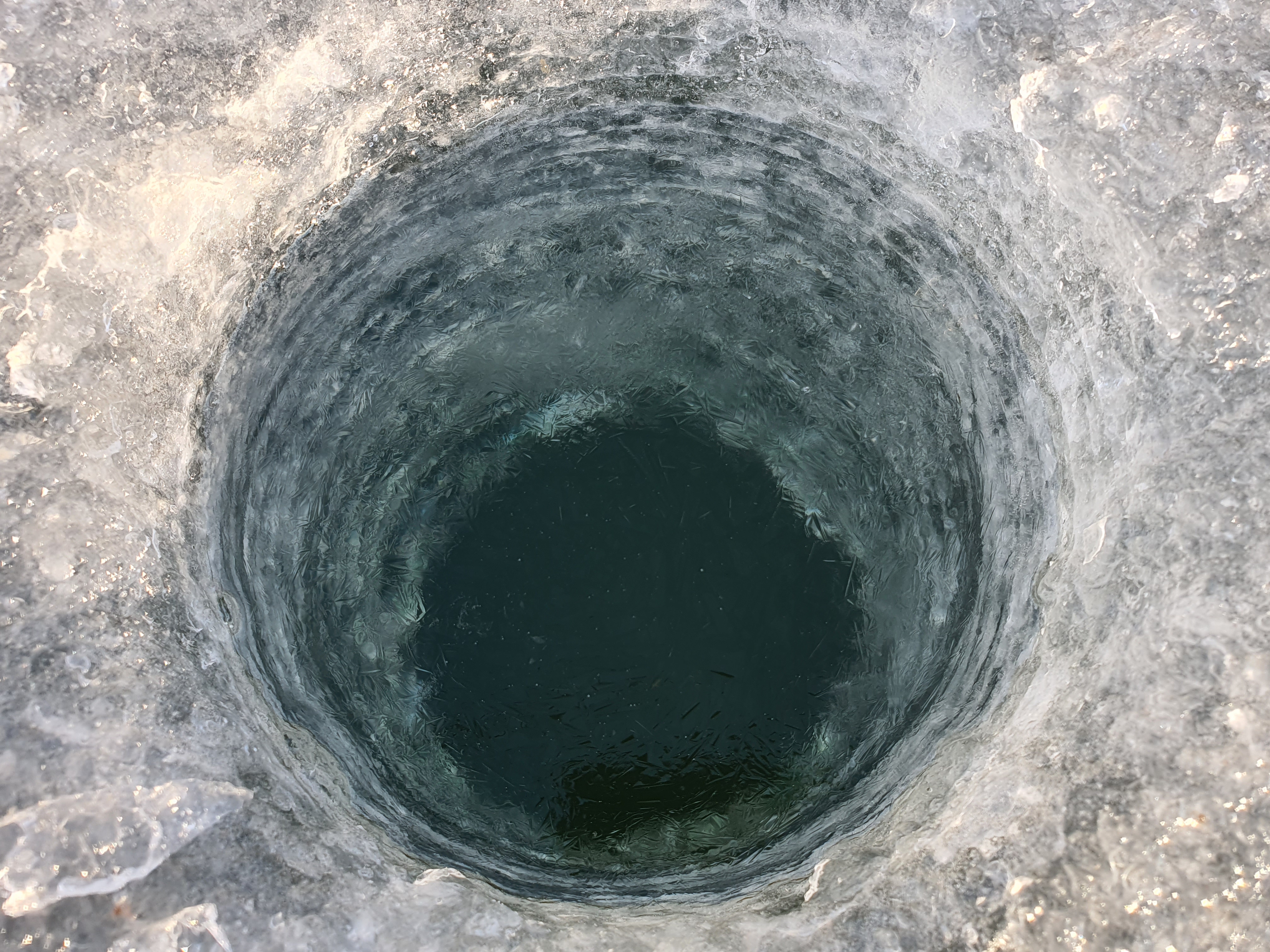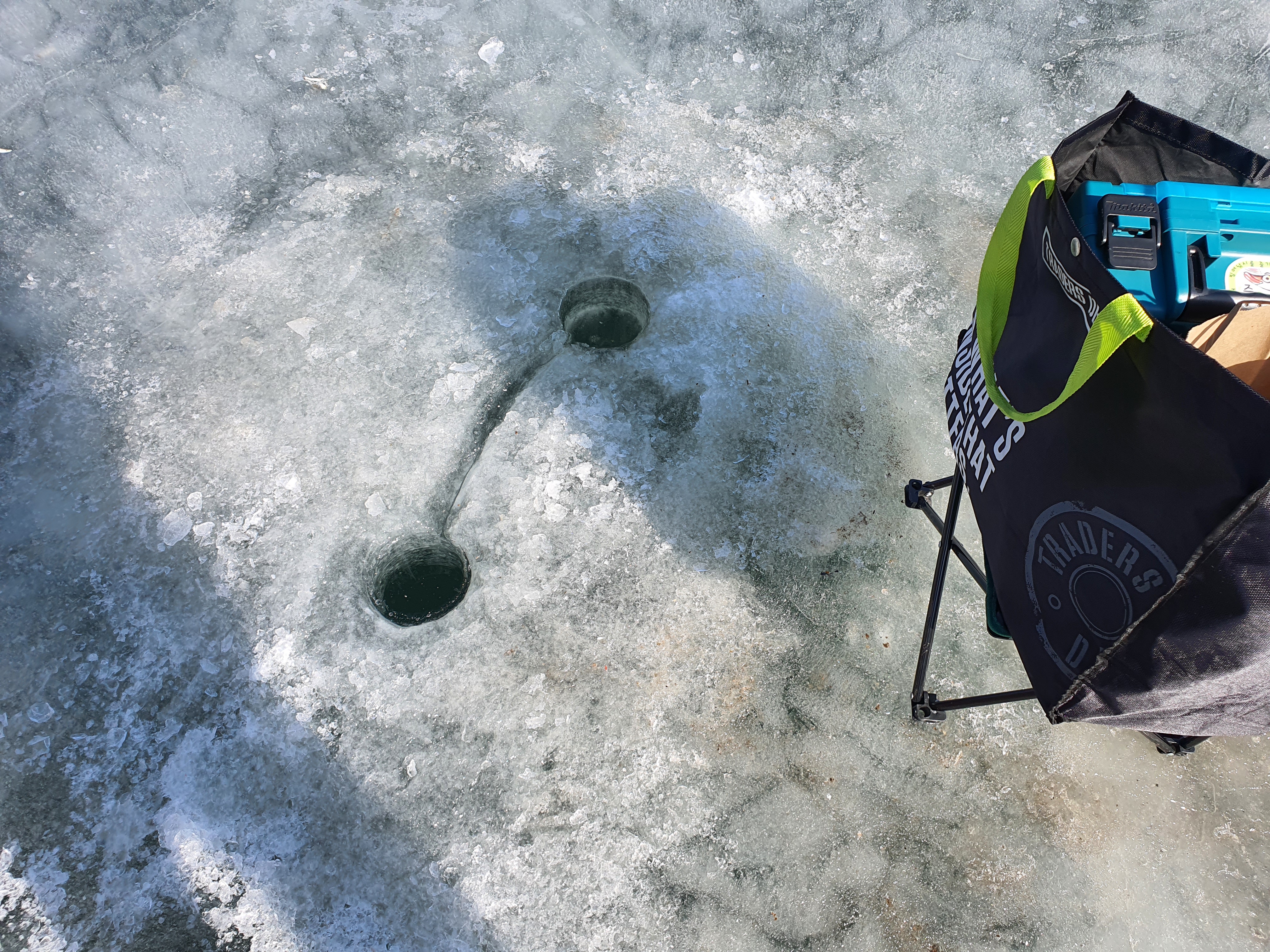빙낚을 위한 구멍 옆에 빙어를 모으기 위한 구멍도 하나 냅니다.