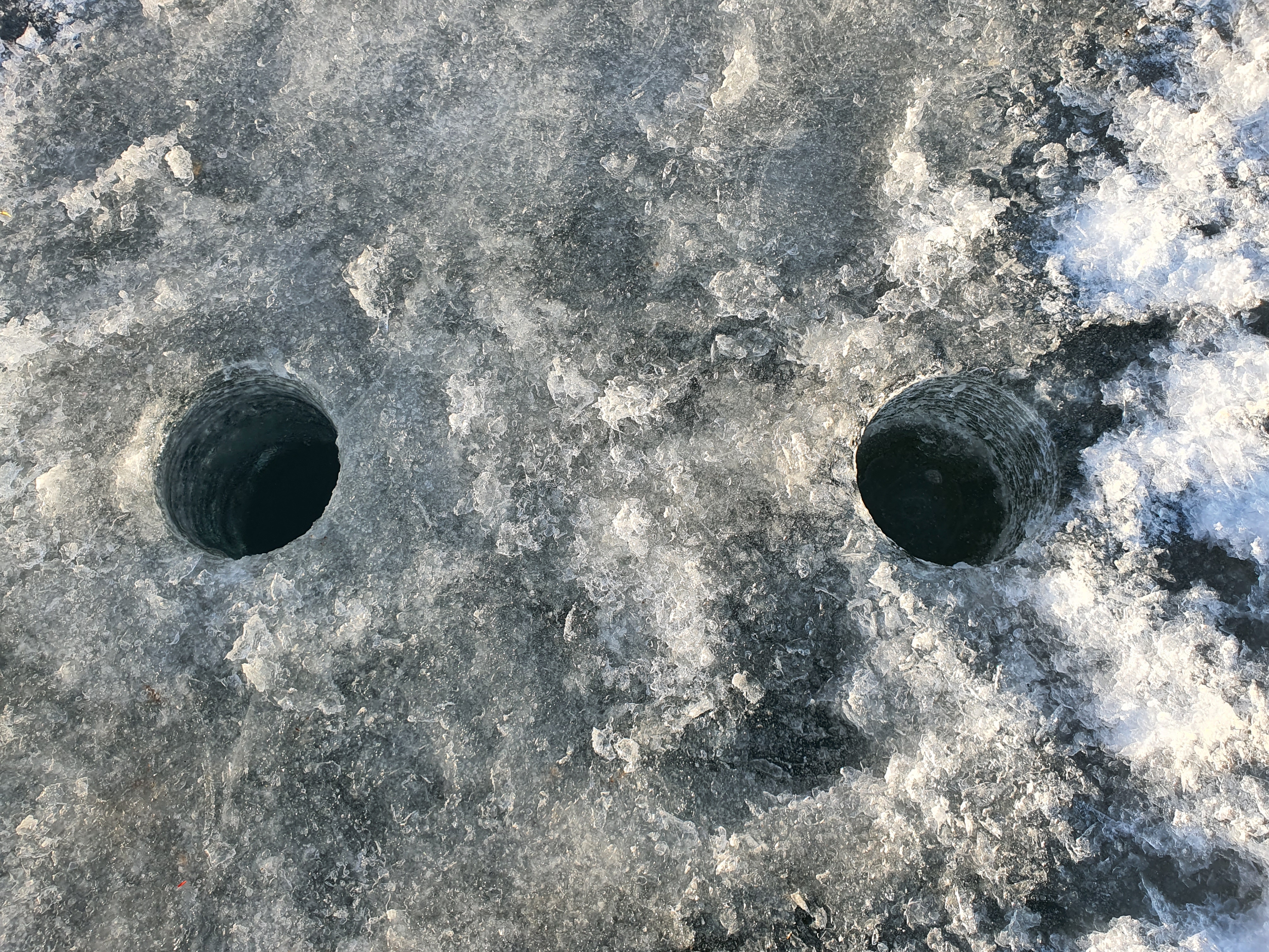 빙낚을 위한 구멍 옆에 빙어를 모으기 위한 구멍도 하나 냅니다.