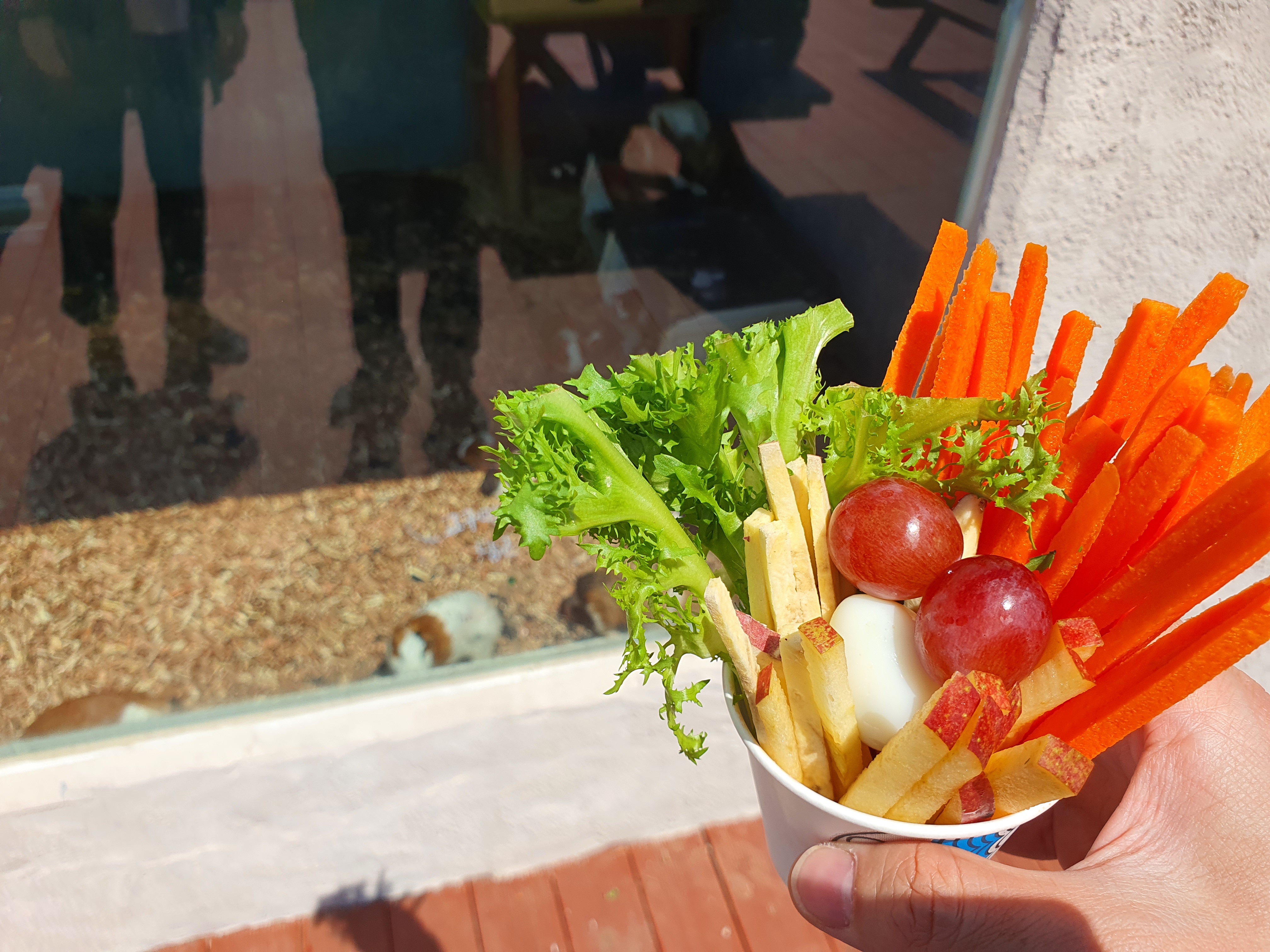 먼저 주문을 하고 서비스로 받은 웜으로 동물들에게 먹이를 줍니다. 웜으로는 아쉬워 과일, 채소를 먹은 동물을 위해서 한컵을 삽니다. (2천원)