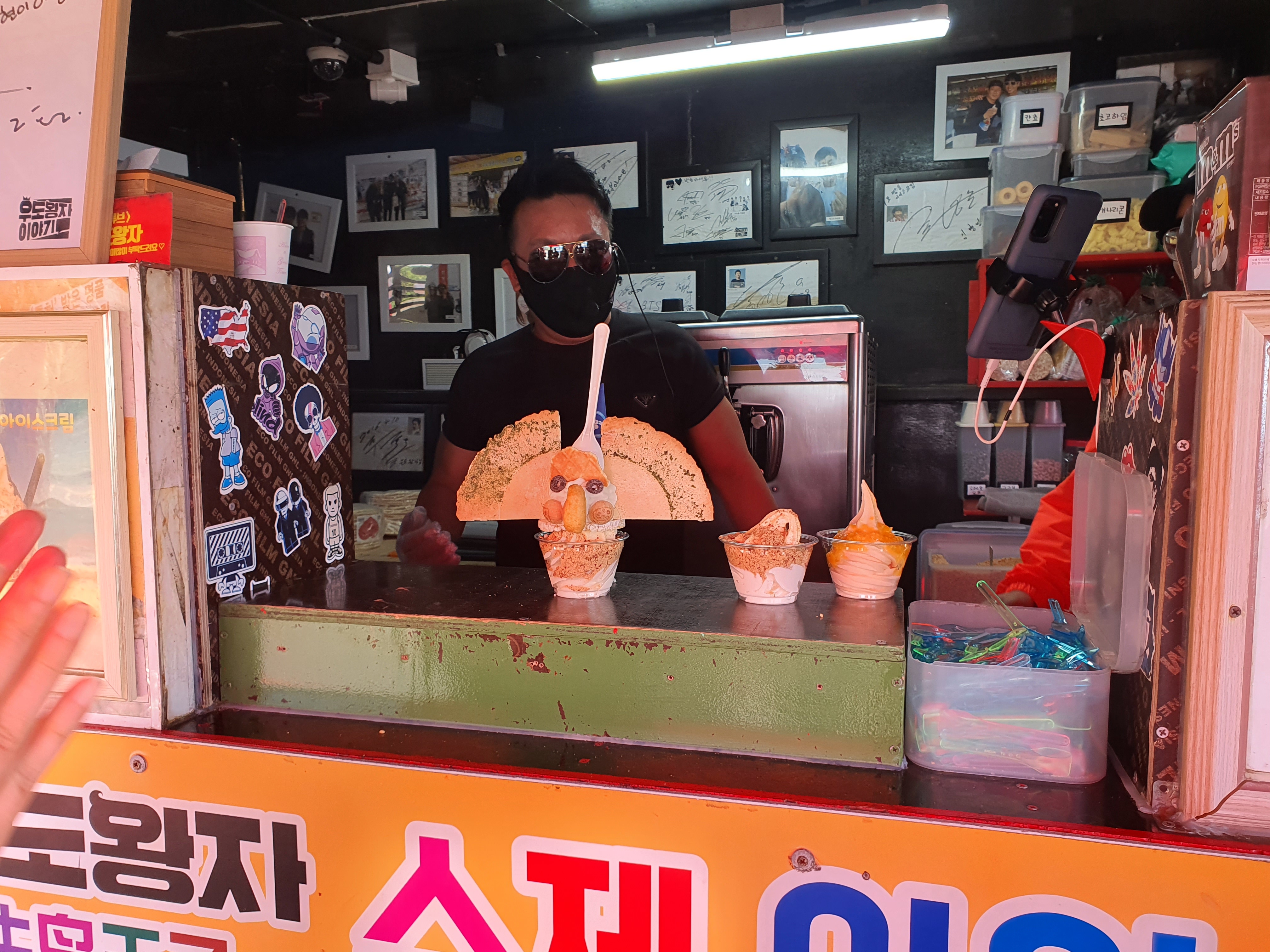 그래서, 경사도가 꽤 되는 곳임에도 많은 식당과 카페가 즐비하게 있어 사람들이 많은 곳이기도 합니다. 이곳에서 가장 유명한 것이 땅콩아이스크림인데, 이분이 그 원조입니다. (중식당 바로 앞 우도왕자)