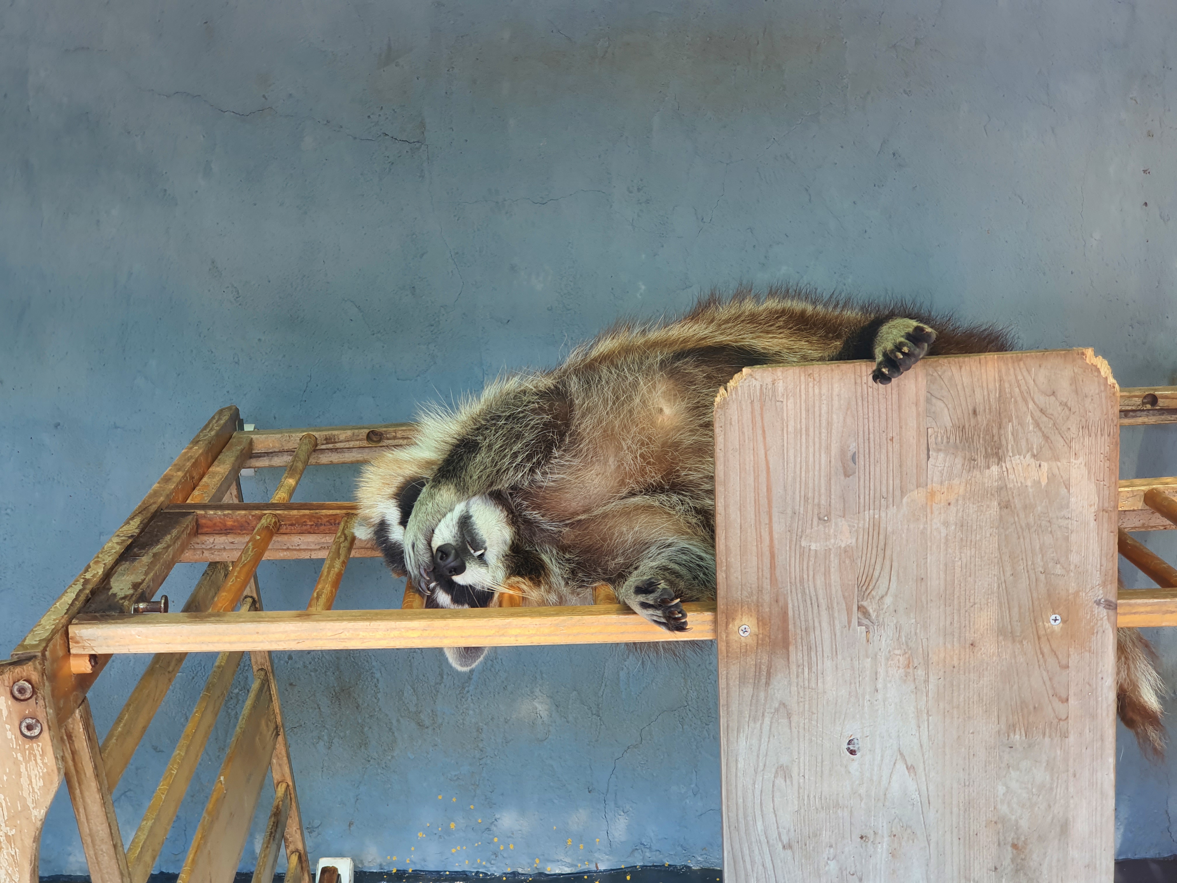 도마뱀이 5~6종류, 동물들이 6~7종류가 있는데, 대부분의 동물들이 먹을 걸 달라고 달려드는데, 이 너구리는 저렇게 손으로 얼굴을 가리고 다리를 턱 걸치고 잠을 자며 먹이는 쳐다보지도 않습니다.