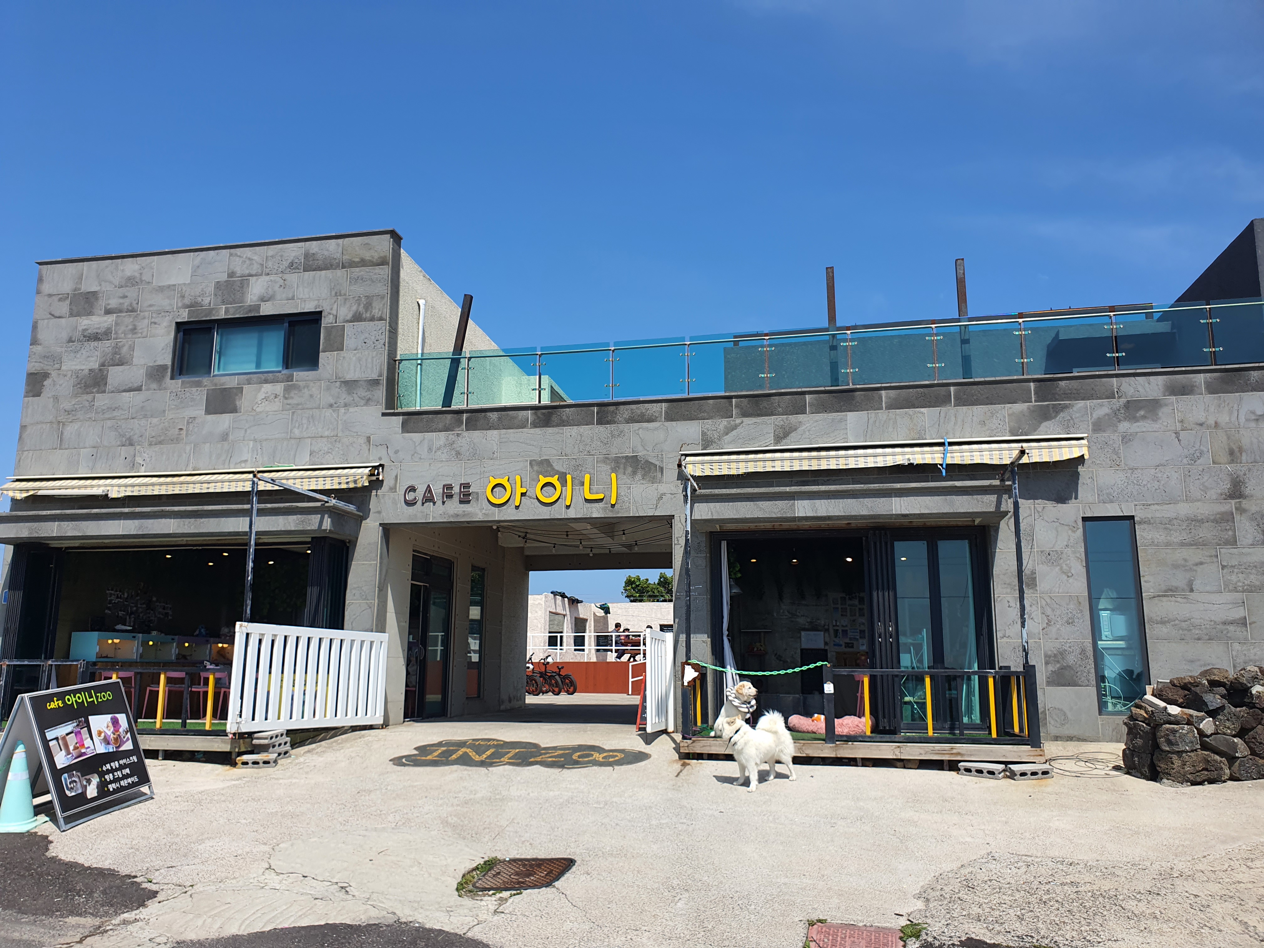 다음 이동한 핫플레이스는 우도에서 추천할 만한 곳입니다. 바로 동물들이 있는 카페인 카페 아이니입니다. 입구에 백구 2마리가 손님들을 맞이합니다.