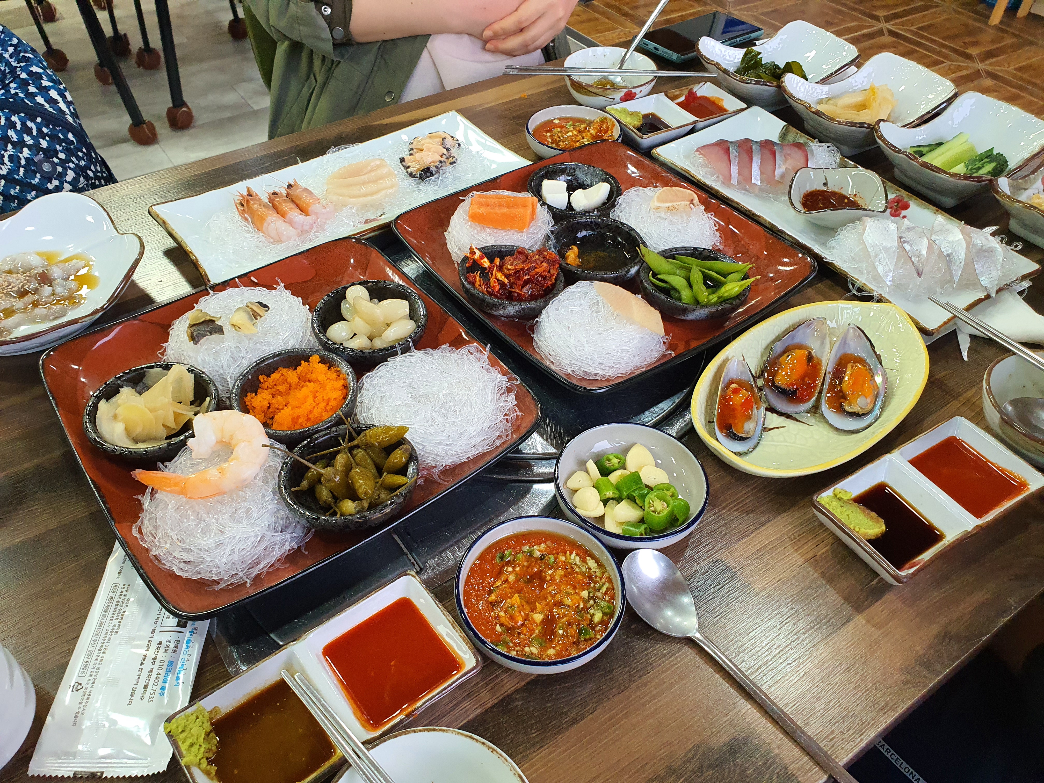 기본 상차림입니다. 이외에도 회를 먹고 나면, 고등어 구이, 전복구이와 매운탕까지 나옵니다. 우럭구이는 윗단계부터 나온다고 하네요.