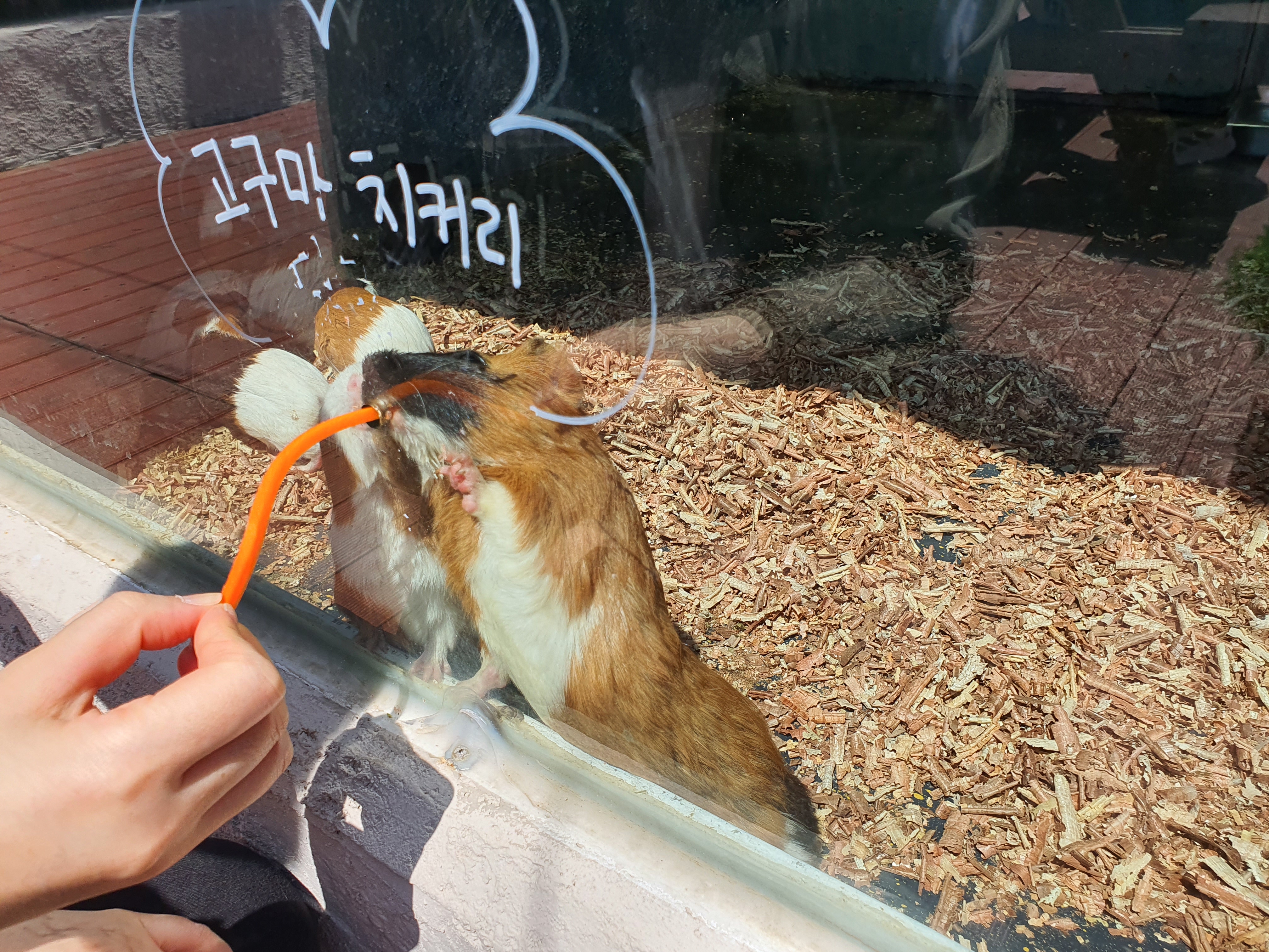 다른 동물들은 주기 바쁘게 서로 먹겠다며 달려듭니다. 작은 동물들을 위해서 이래저래 유인해 최대한 골고루 나눠줘 봅니다.