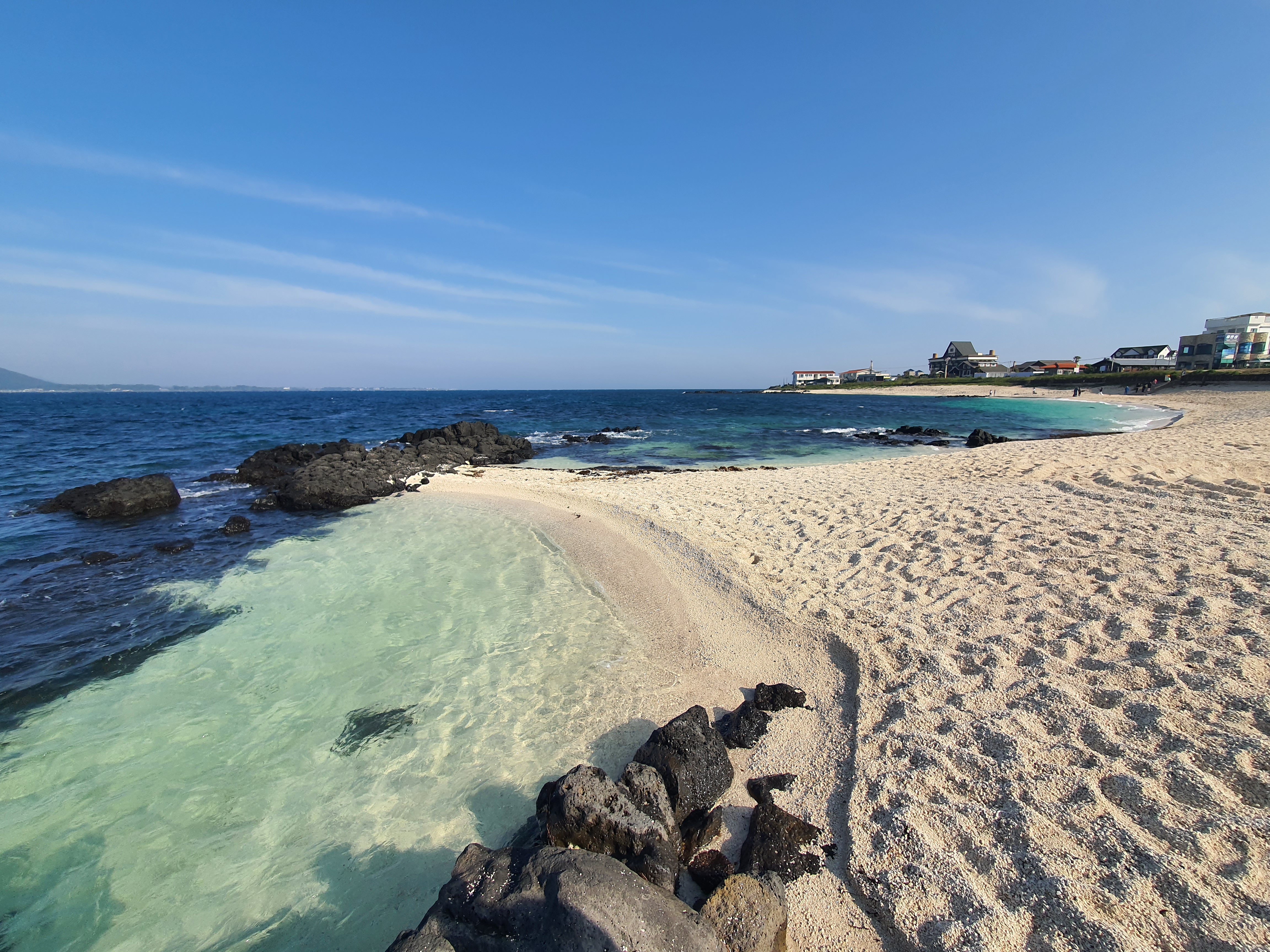 전기자전거를 타고 흰 백사장이 멋진 홍조단괴해빈(산호해수욕장)에서 추억을 남깁니다. 눈이 부실정도의 흰모래와 에메랄드 빛 바다가 정말 멋진 우도핫플레이스입니다.