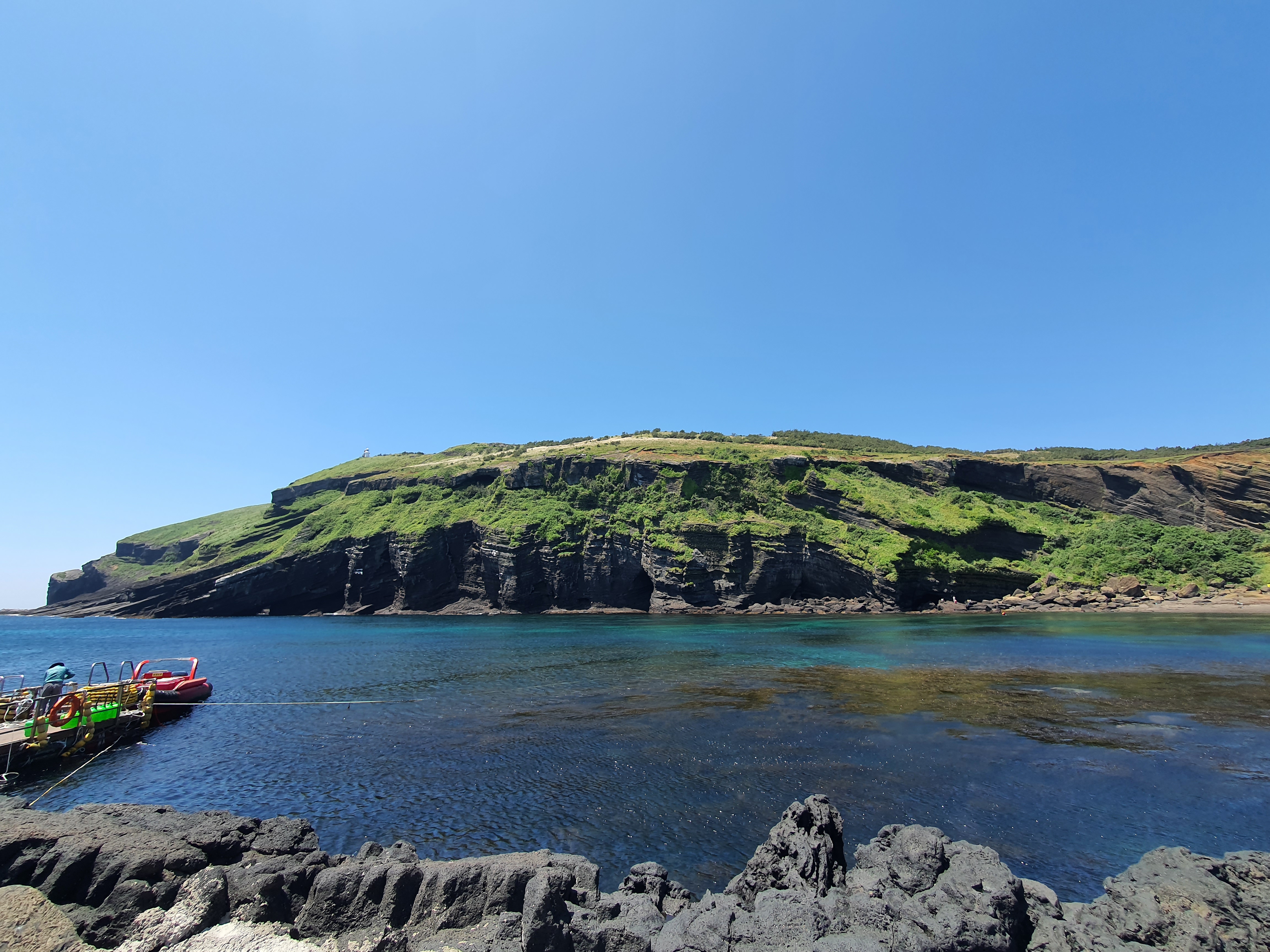다음은 우도에서 가장 유명한 검멀레해변입니다. 깍아지른 절벽이 에메랄드 빛 바다가 만나며 푸르른 하늘을 배경삼아 멋진 풍경을 즐기며 힐링할 수 있는 곳이지요.