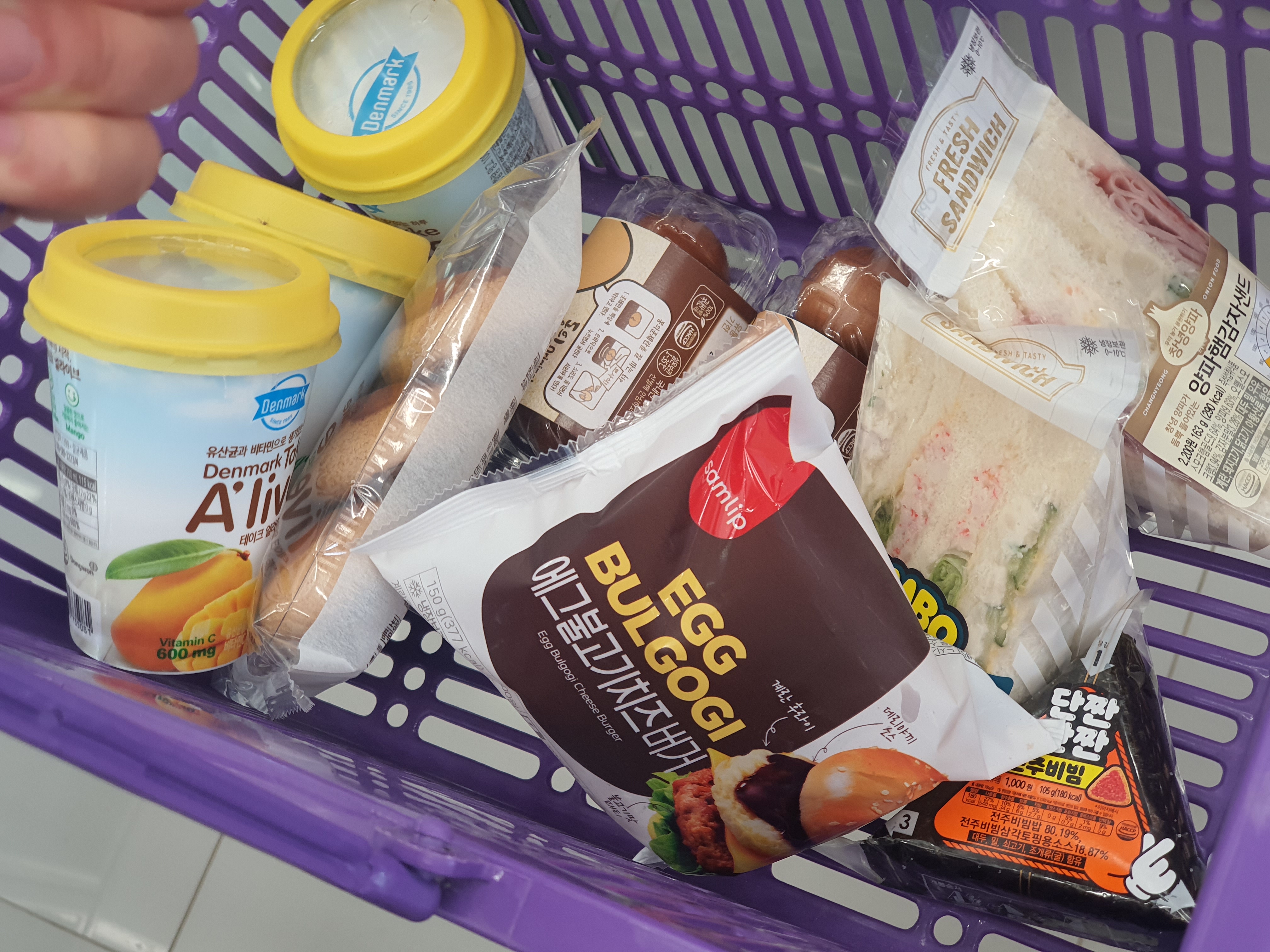 간단히 요기를 하기 위해서 편의점에 들러 이것저것 담아서 준비합니다.