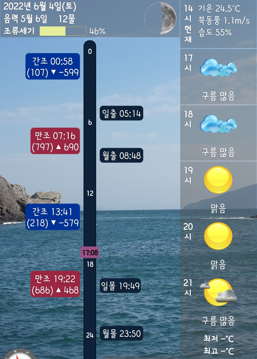 물때는 12물이고 바람은 간간히 1단 수준이었지만, 습한 날씨에 강한 햇살의 더위가 느껴지는 날씨었네요.