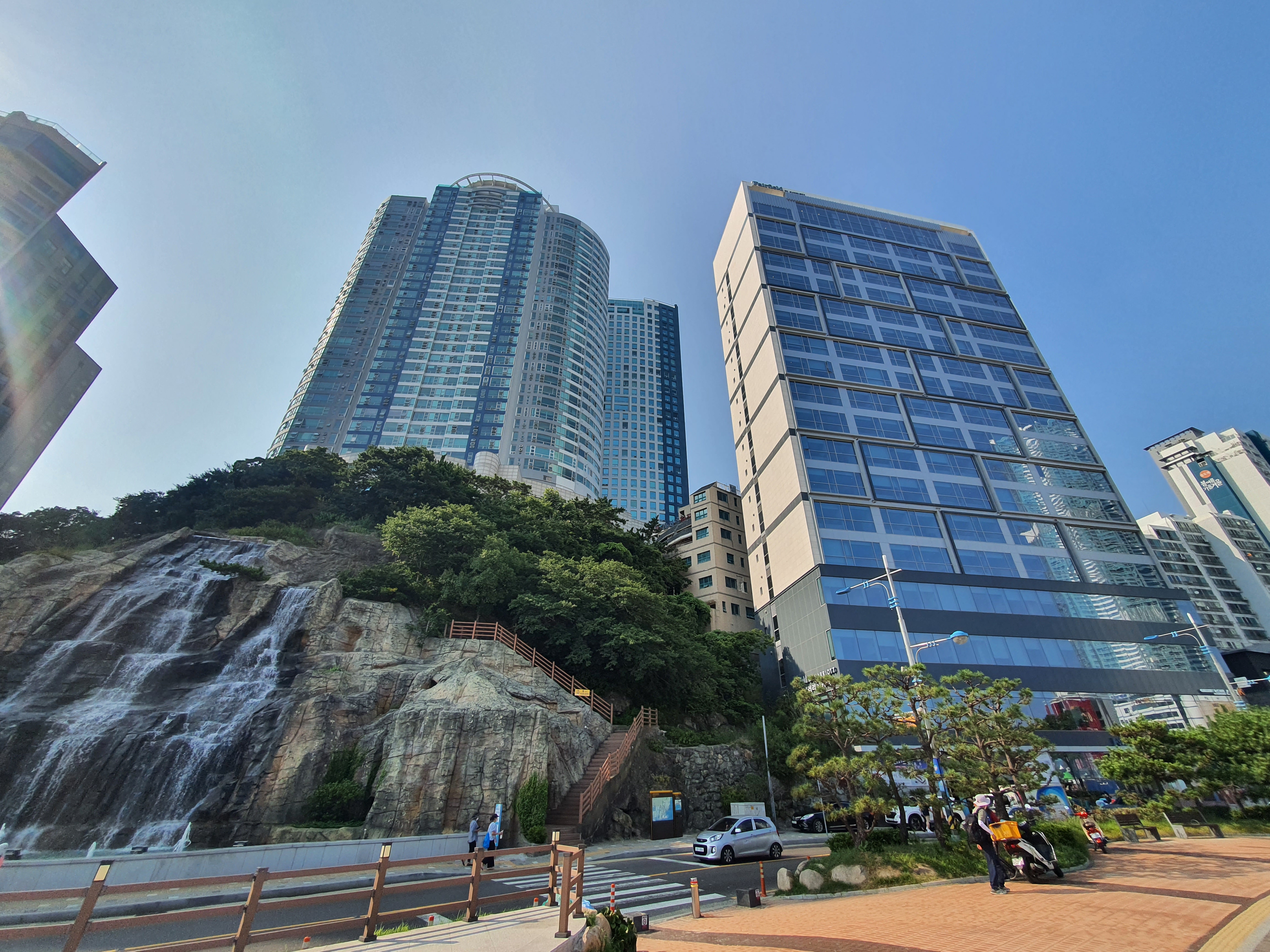 건물 옆쪽은 조그만 공원인데, 인공폭포수가 시간에 맞춰 시원하게 흘러내리더군요.