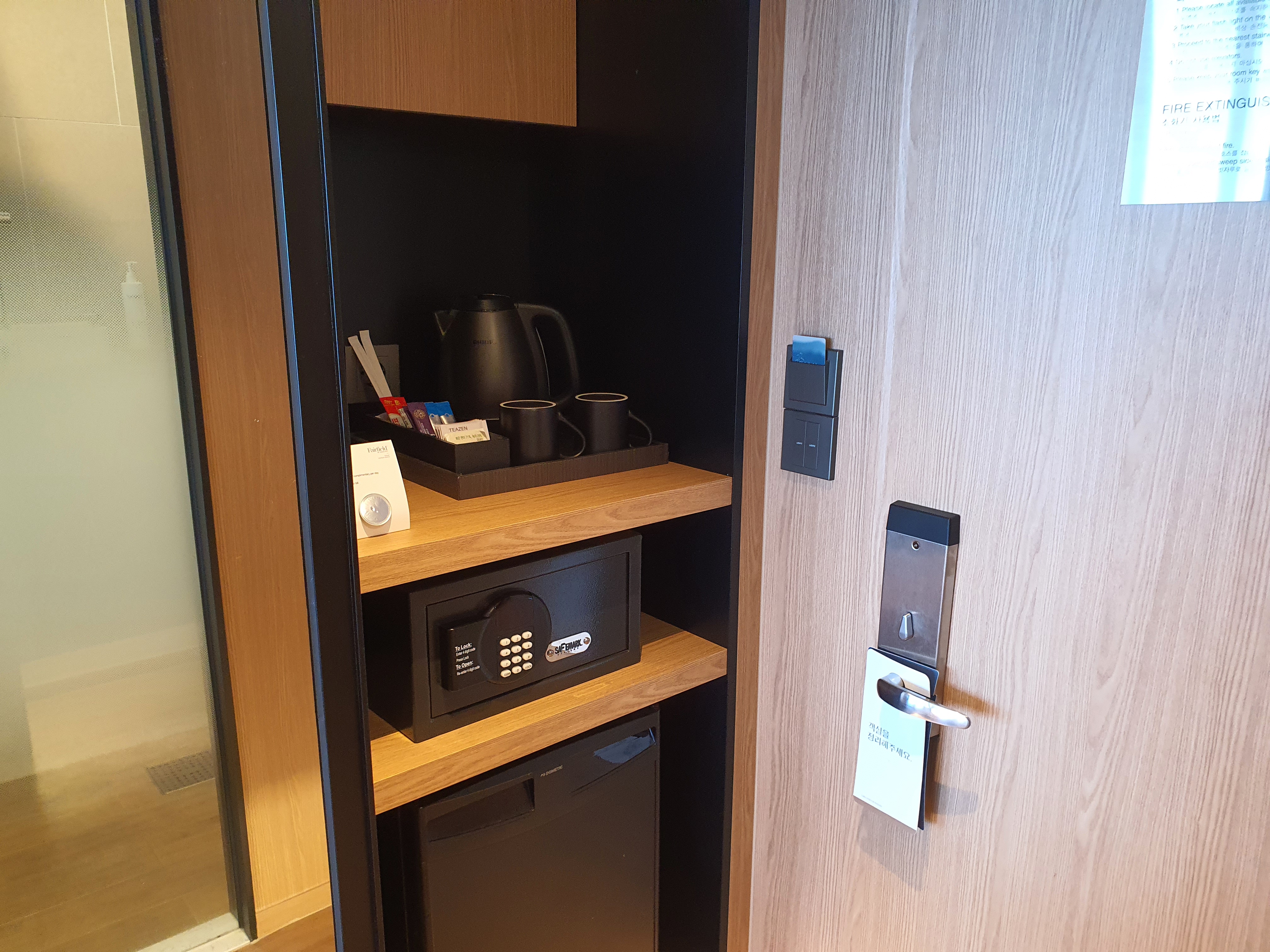 커피와 차는 무료로 이용이 가능하고, 냉장고에 물도 기본적으로 구비되어 있더군요. 캡슐용 커피도 있는데 그건 유료더군요.