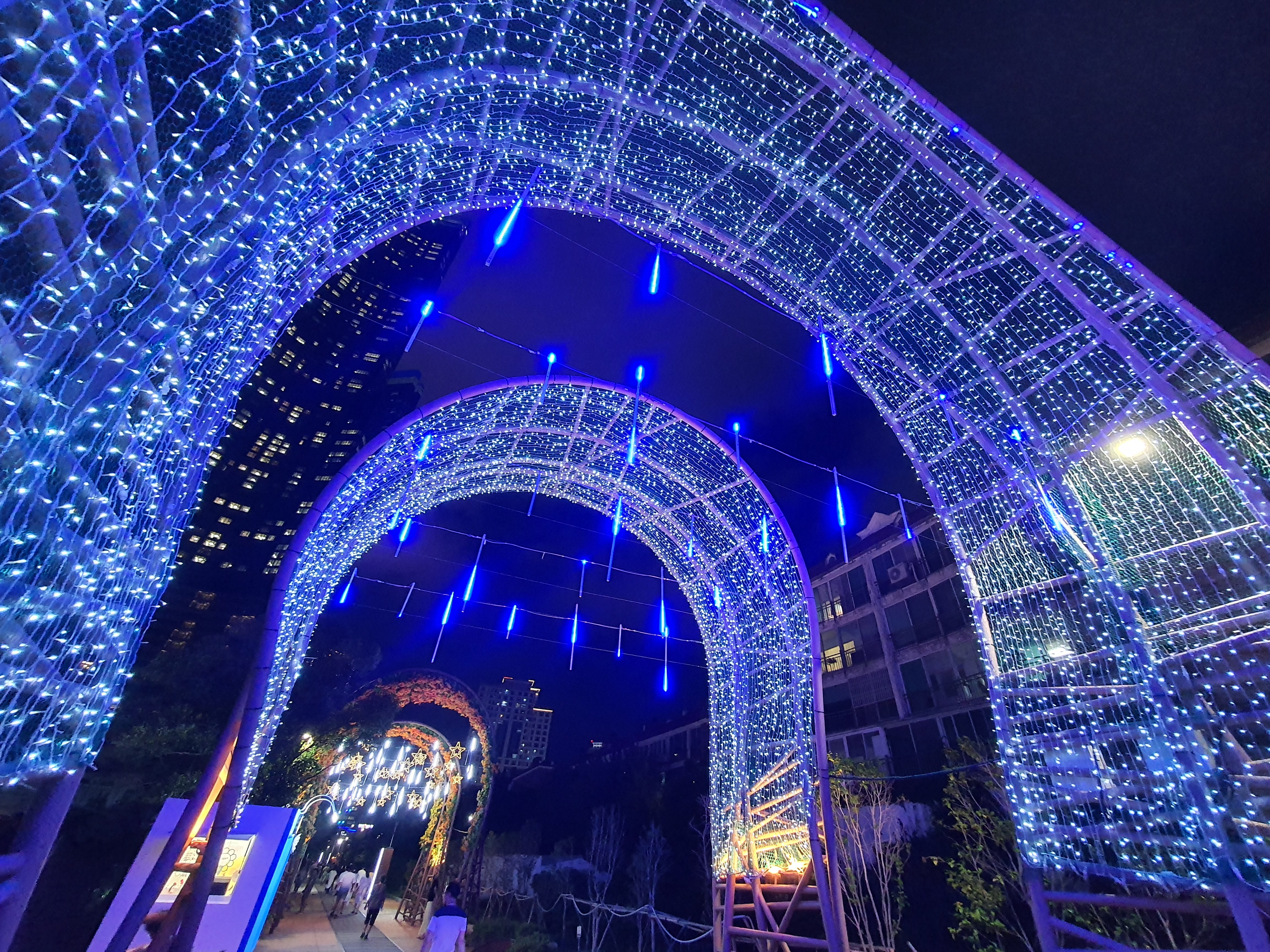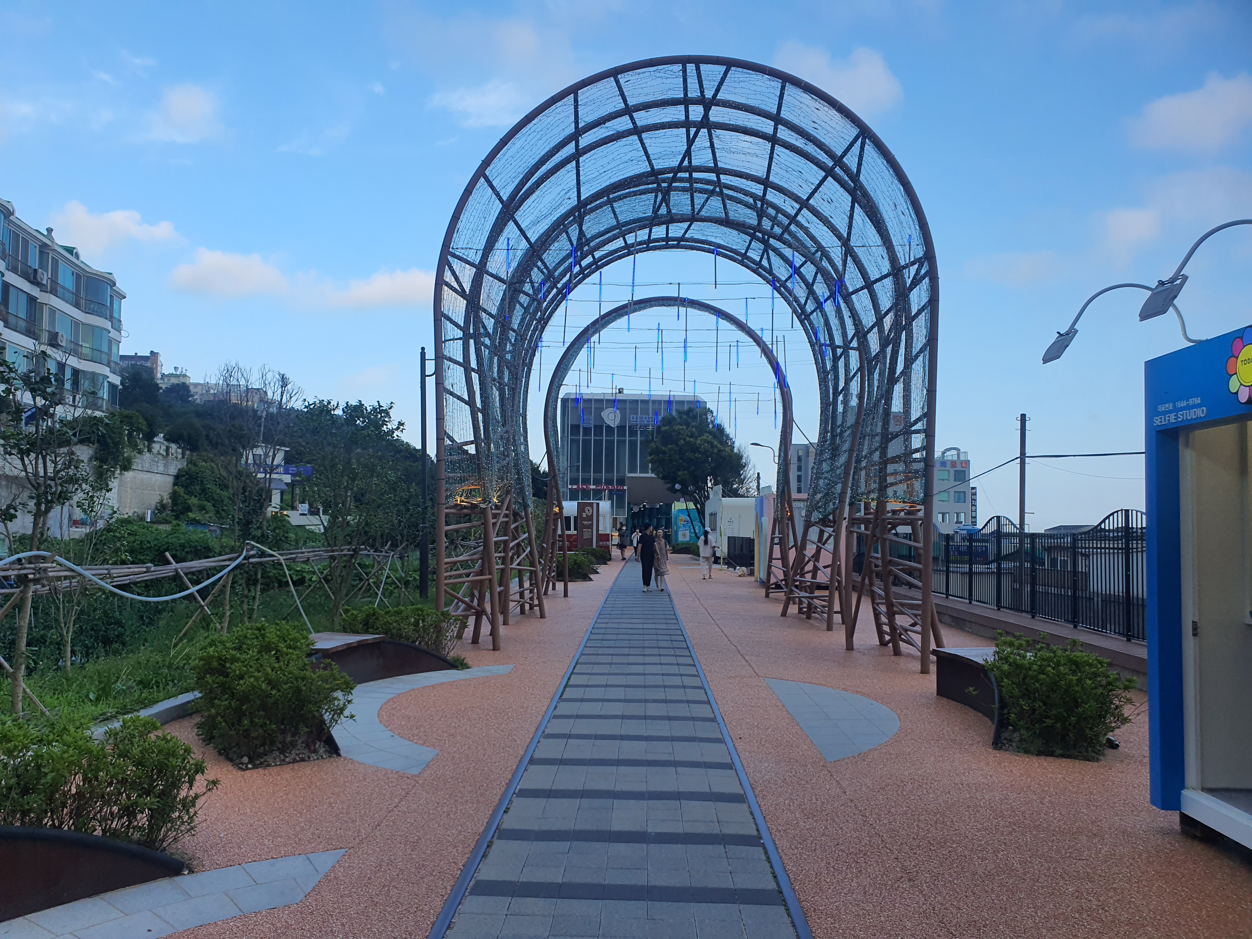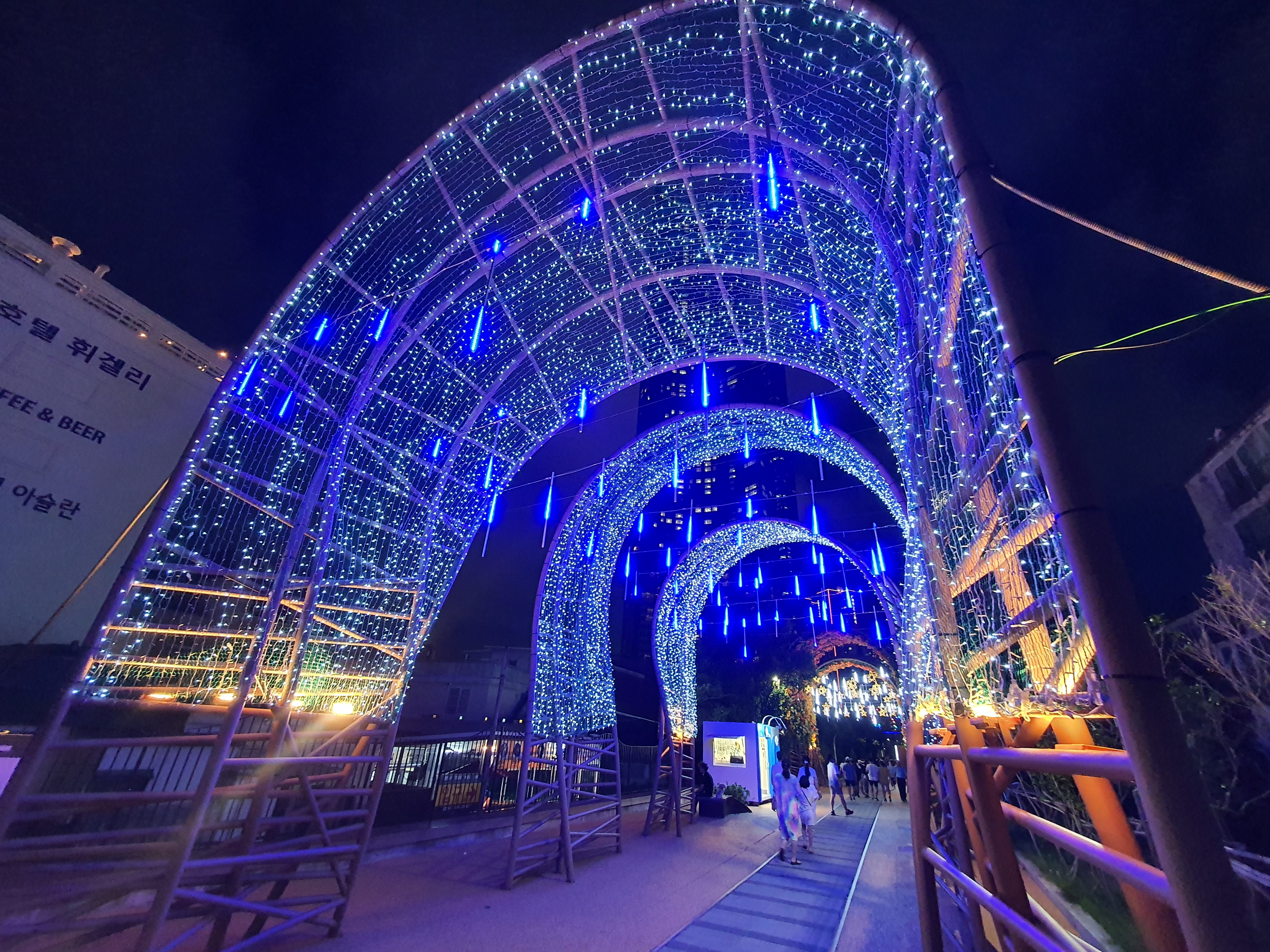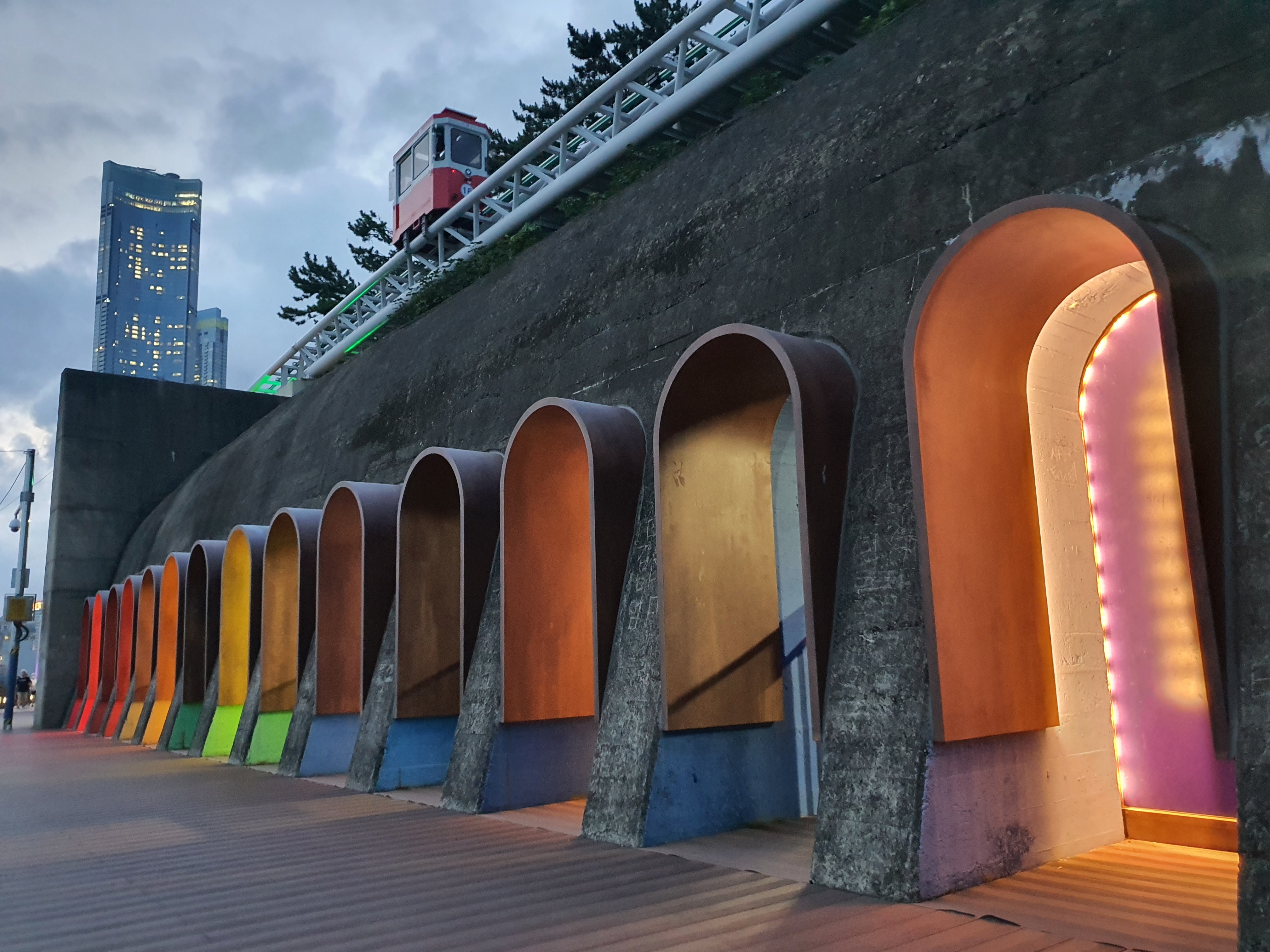 그 아래에 달맞이터널이 있습니다. 무지개빛의 터널이 멋들어지게 보이는데, 해질 무렵 도착한 터라 형형색색 빛들이 더 멋 들어져 보입니다.