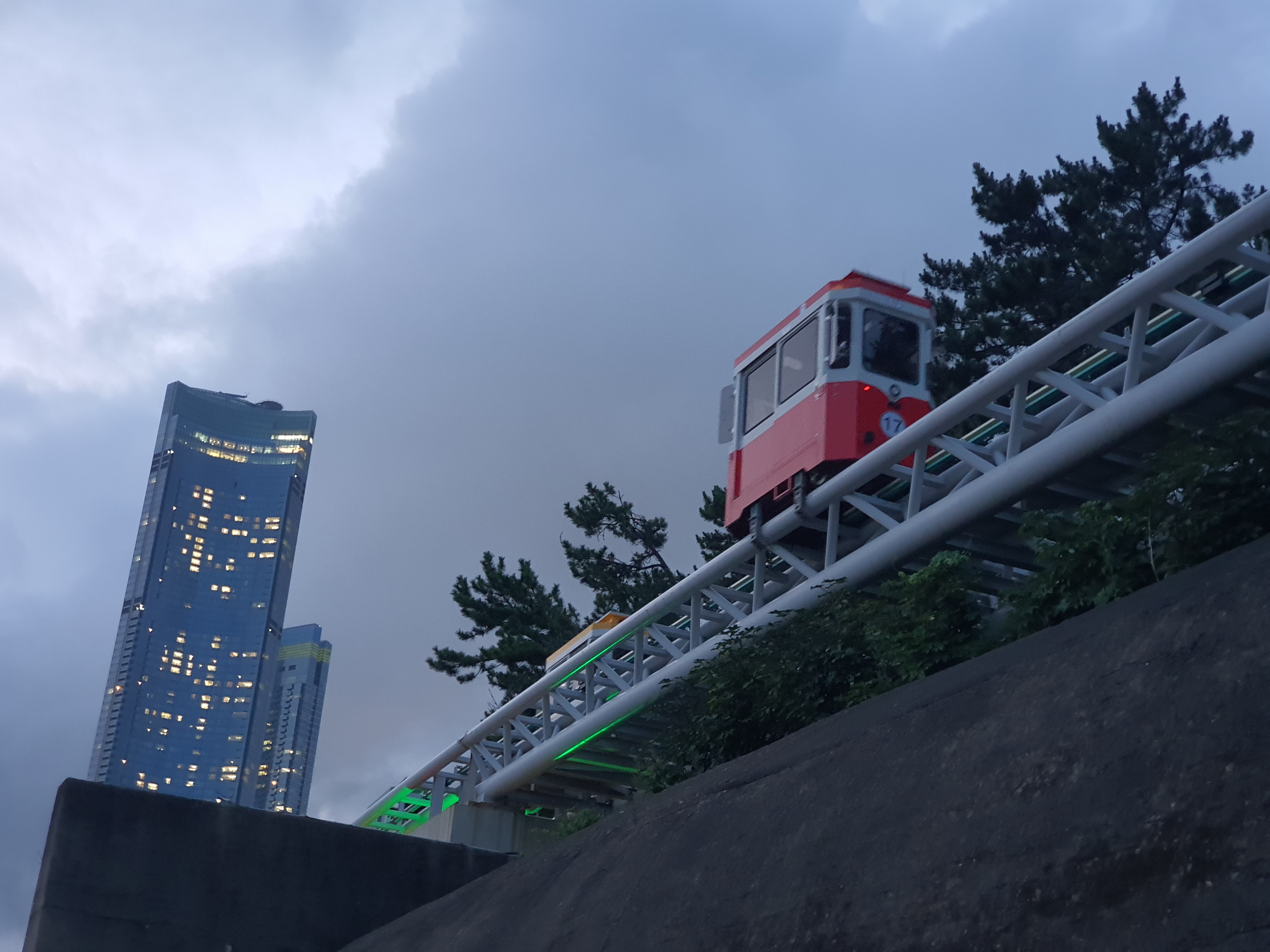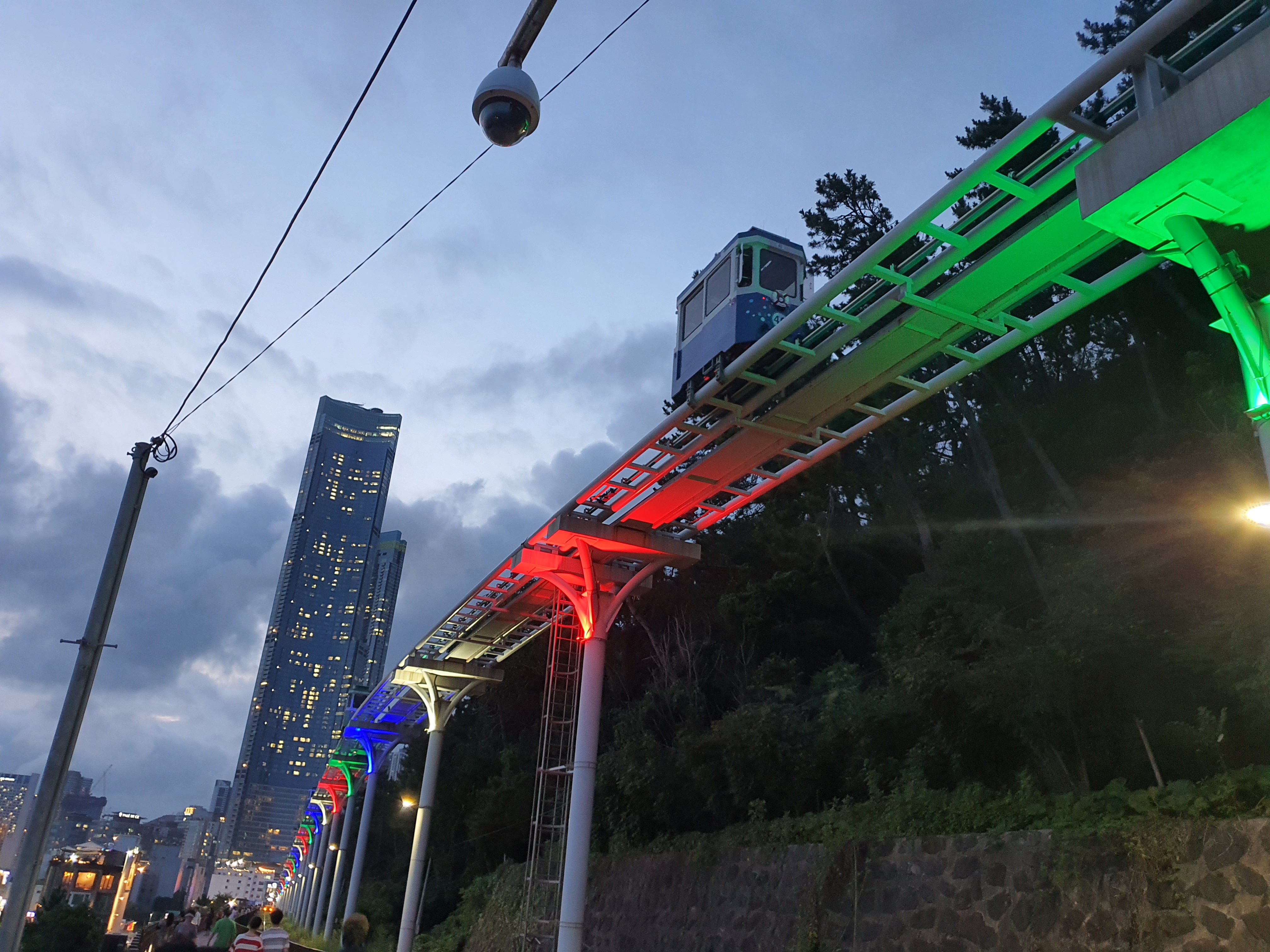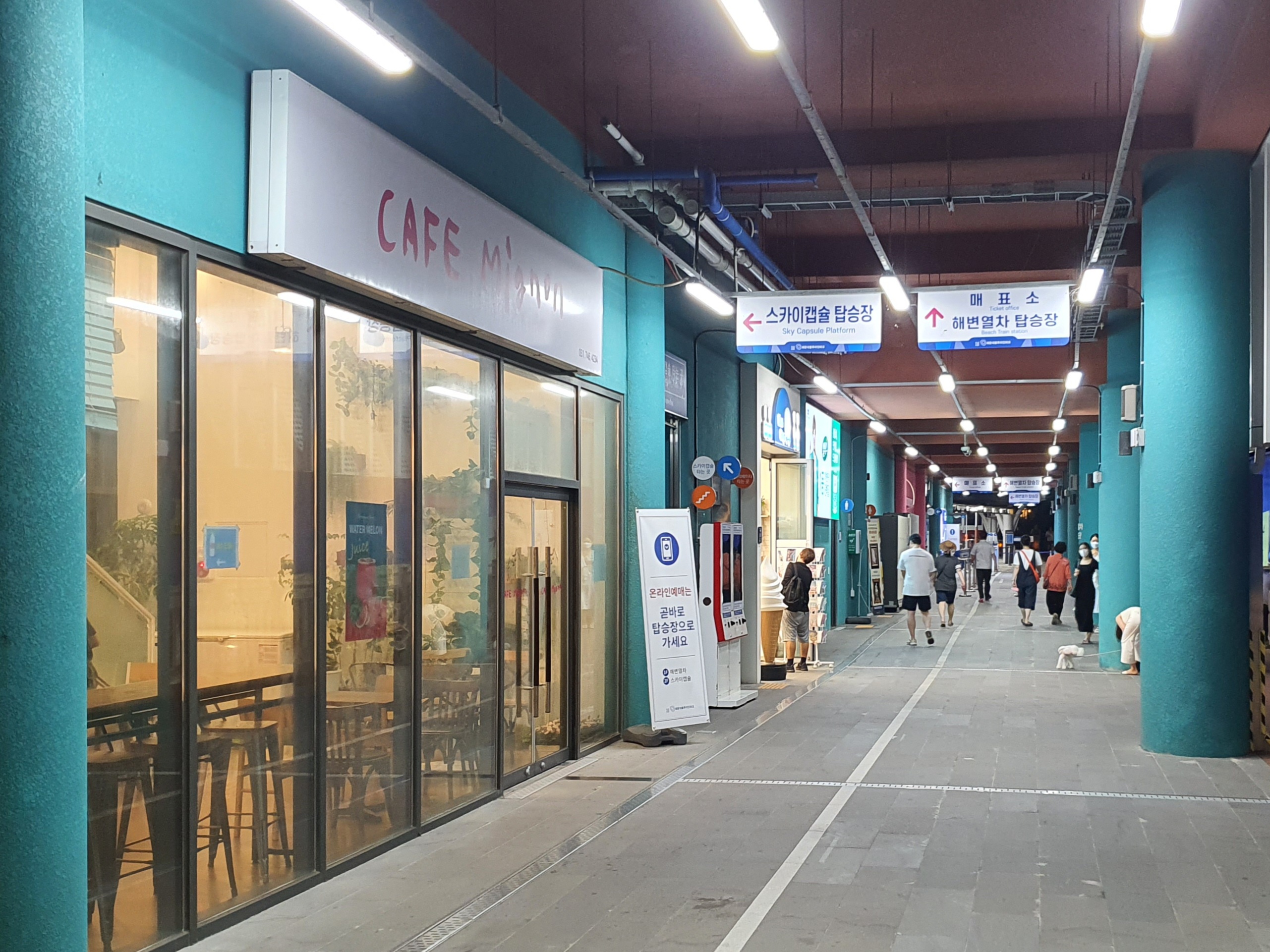 청사포 정거장도 시간 관계상 패스하고 달맞이 터널 정거장에서 하차를 합니다. 정거장에서 나오니 스카이캡슐이 2층에서 간간히 지나갑니다.