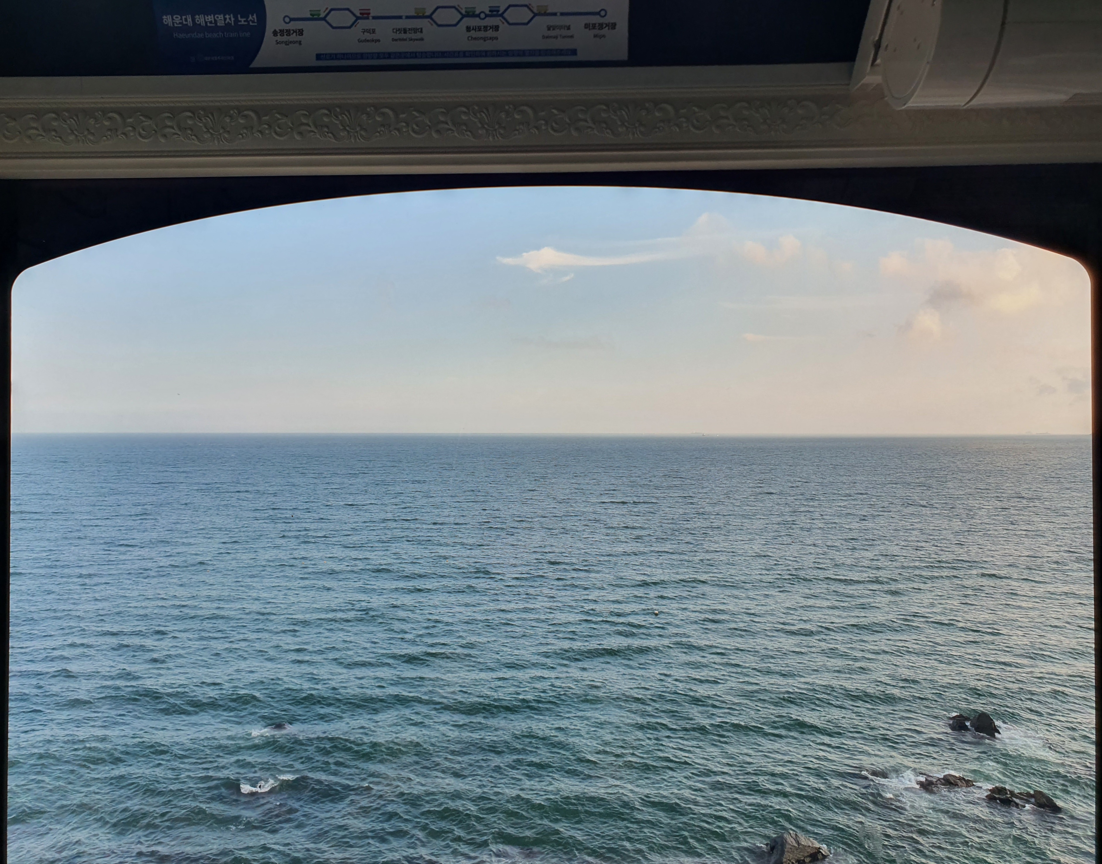 해변열차 출발과 함께 드넓은 부산 앞바다의 풍경이 나타납니다. 바다 전체의 풍광이 나타나는 것은 미포정거장에서 달맞이터널 구간이며, 나머지는 가끔씩 보이지만 소나무와 건물등으로 풍경에 아쉬움이 있기는 하더군요.