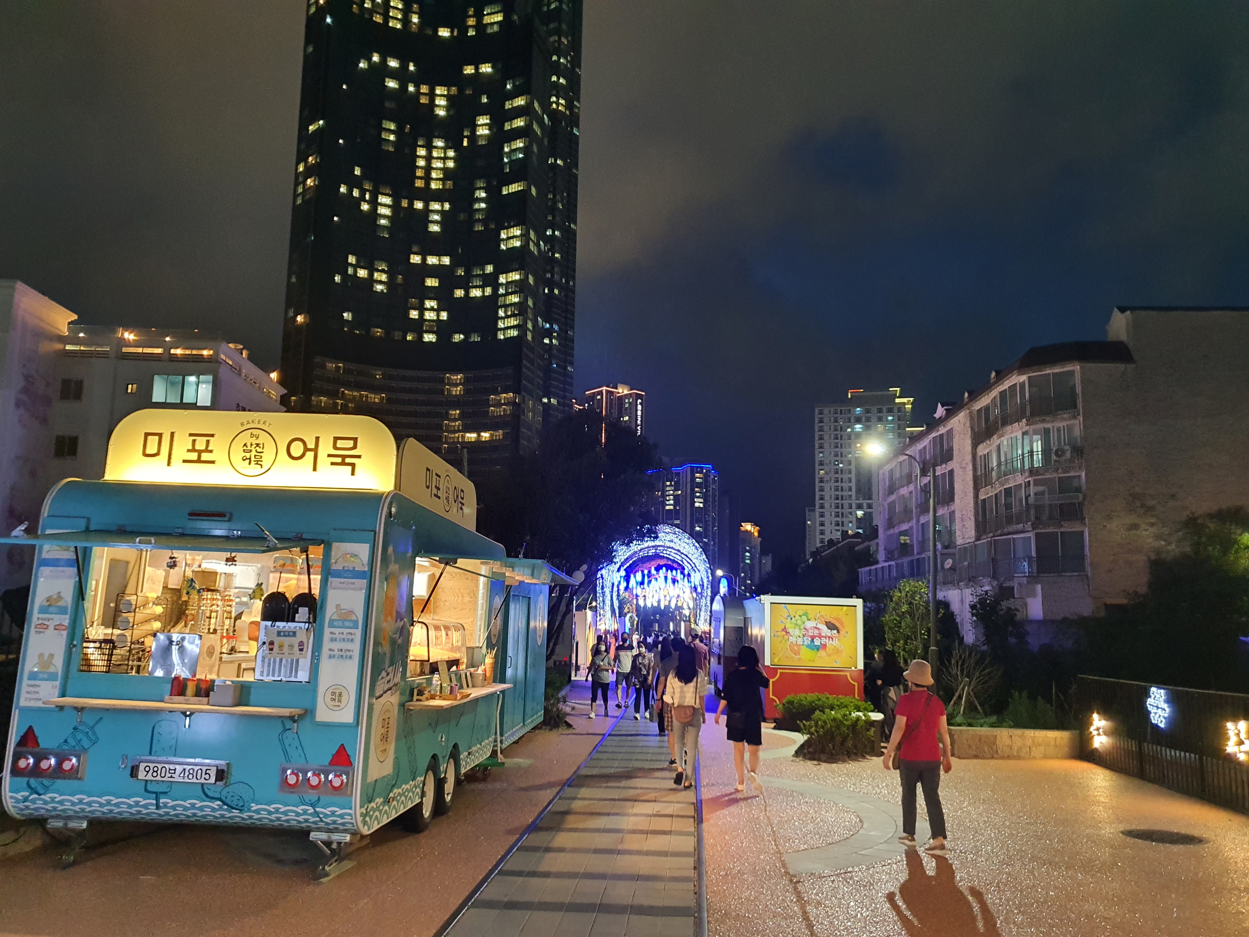 미포정거장은 주차장에서 약 400m정도 떨어진 곳에 있는데, 들어갈 때는 몰랐는데, 해가 지고 나니 멋진 LED의 야경을 보여주더군요.