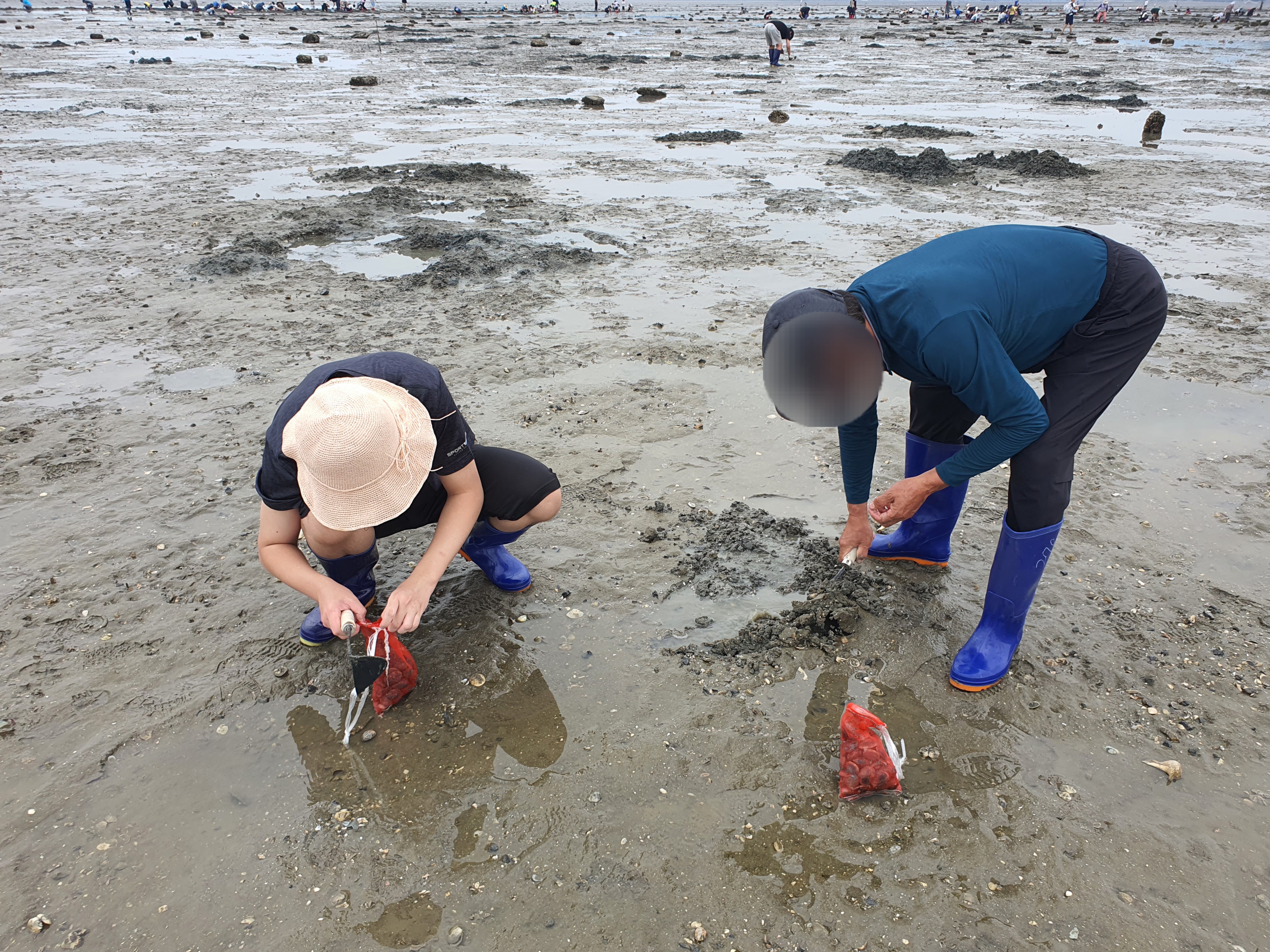 300m 정도를 걸어가면 먼저 조개를 캐고 계신 많은 분들을 볼 수 있습니다. 이미 파인 곳은 조개를 캔 곳이고 물이 많은 곳은 갯벌로 잘 보이기에 캔 흔적이 없는 곳을 위주로 호미질을 합니다.